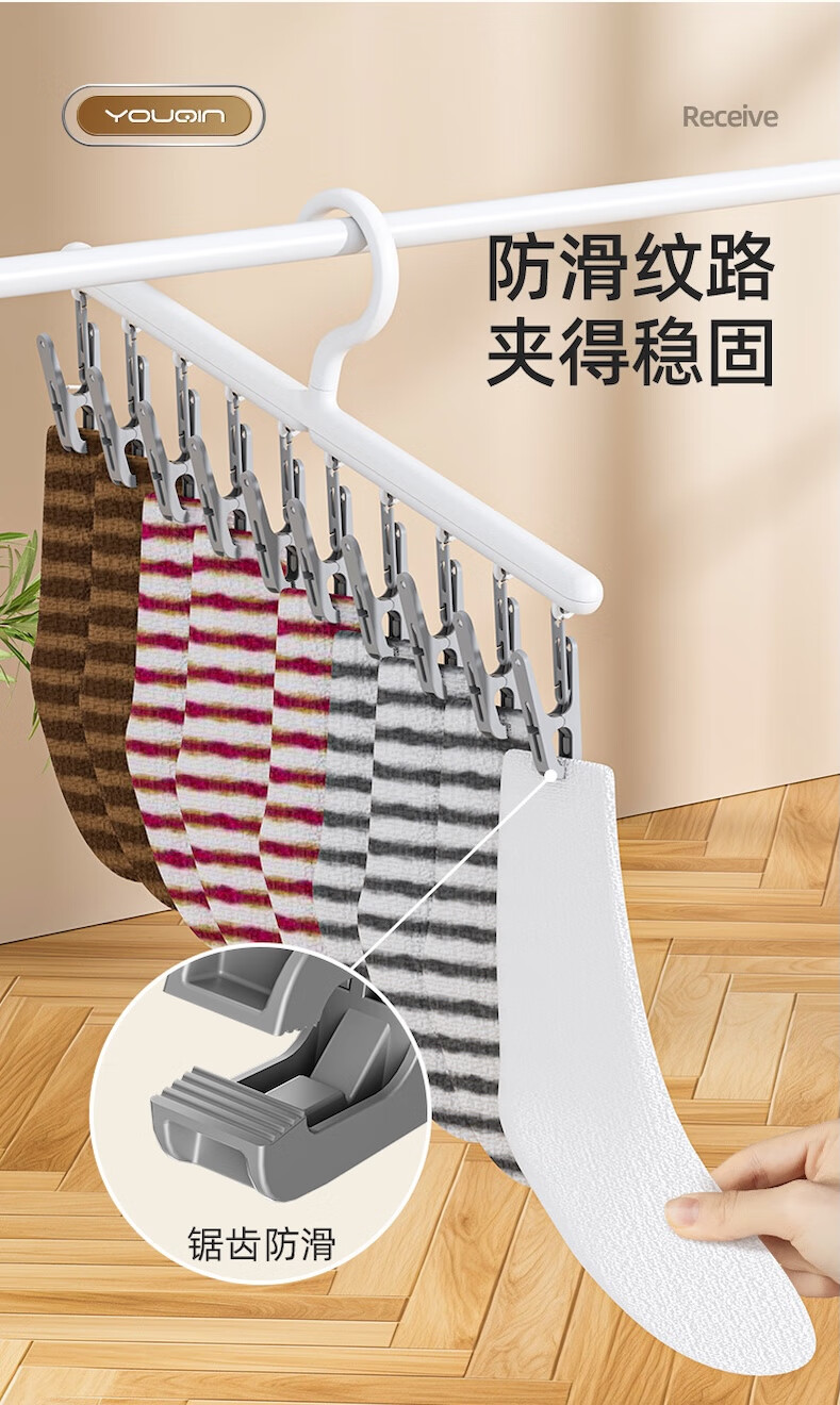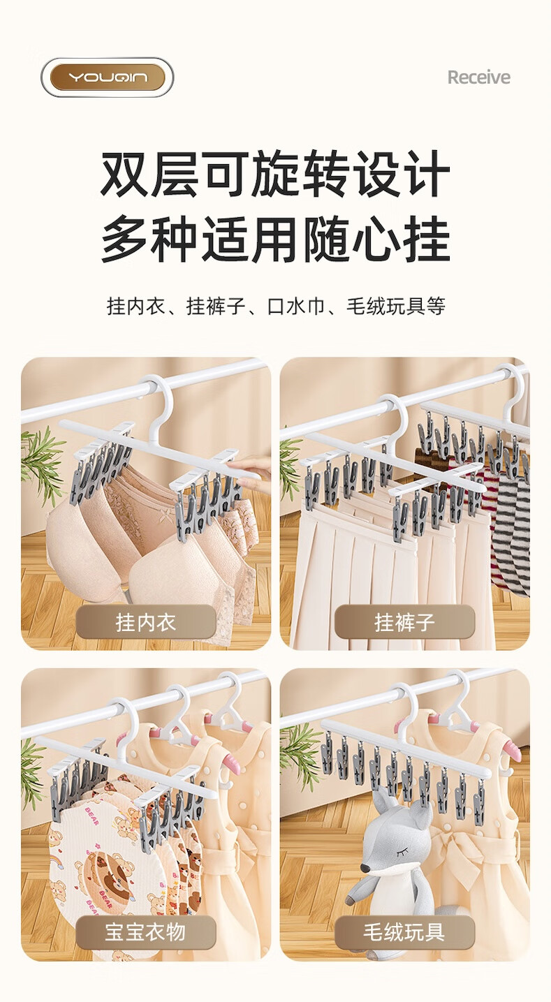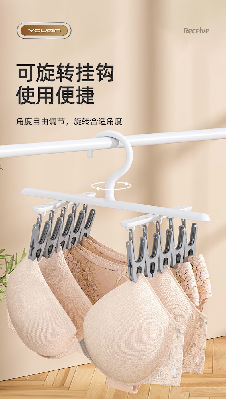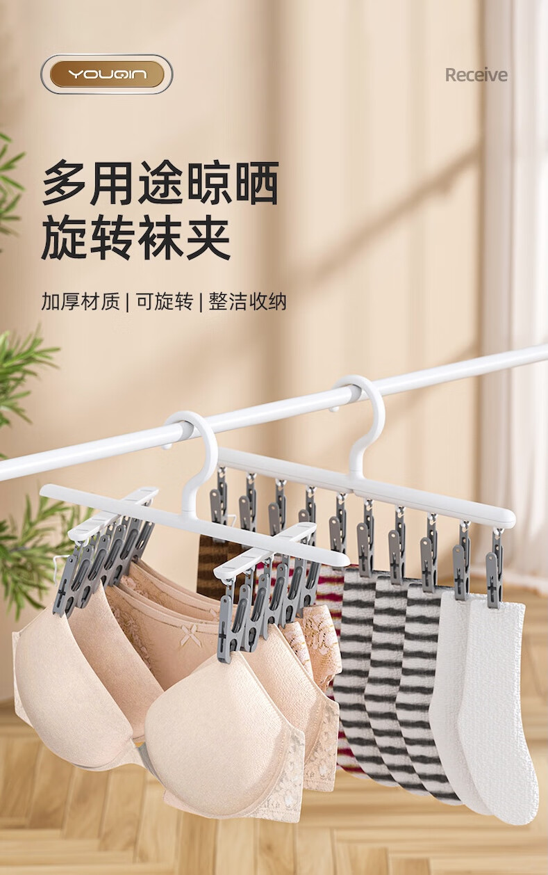 优勤(YOUQIN)多功能旋转袜夹家用阳台袜子晾衣架多夹子袜子夹便携内裤内衣夹子 灰白色多功能旋转袜夹【含10夹】 1个装