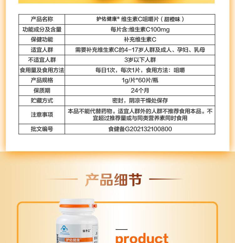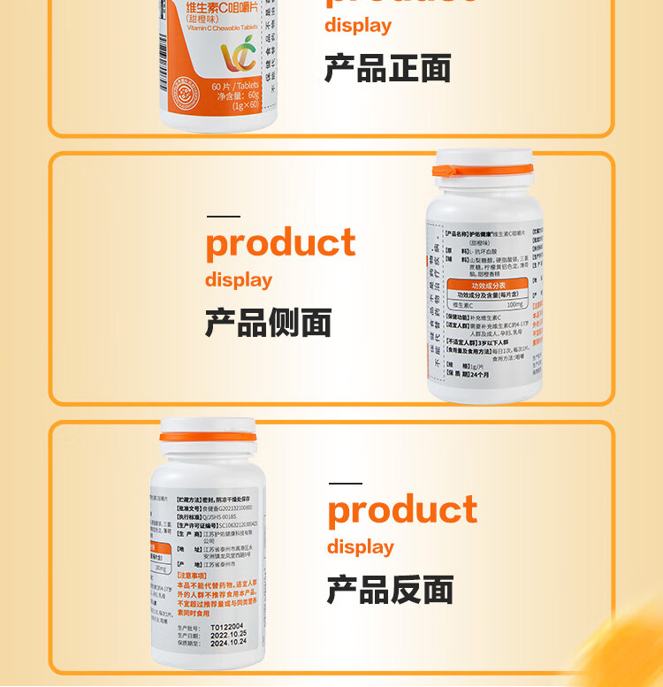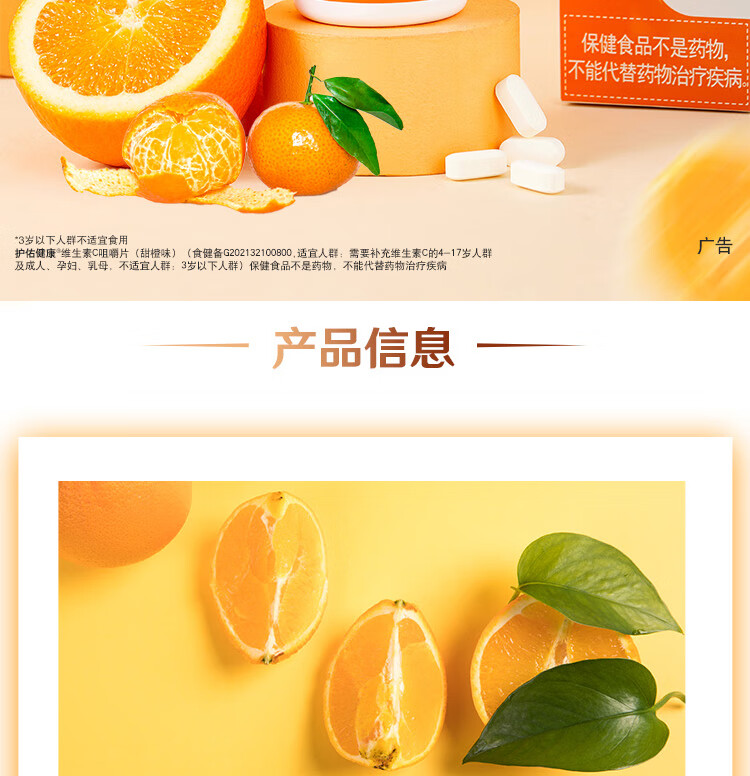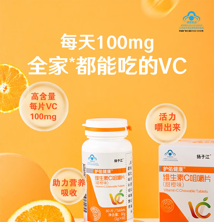 护佑维生素C咀嚼片60片/瓶 甜橙味 维c咀嚼片含片VC儿童增强免疫力1g