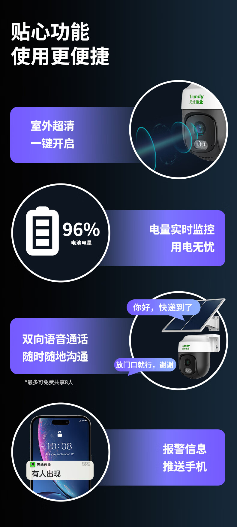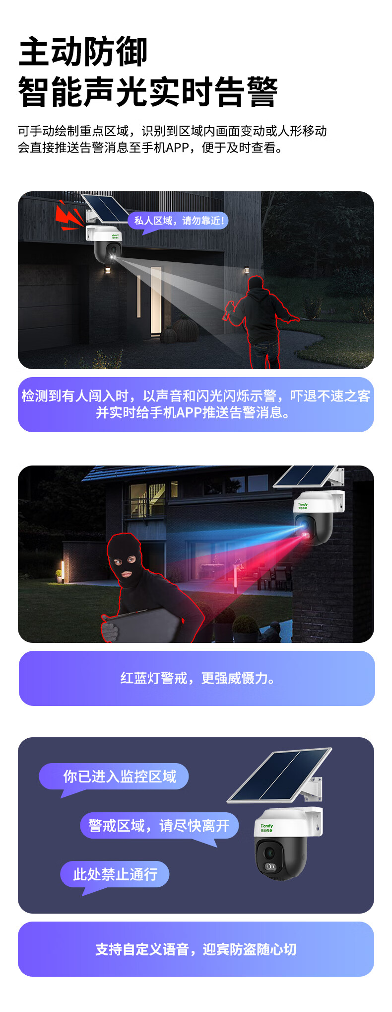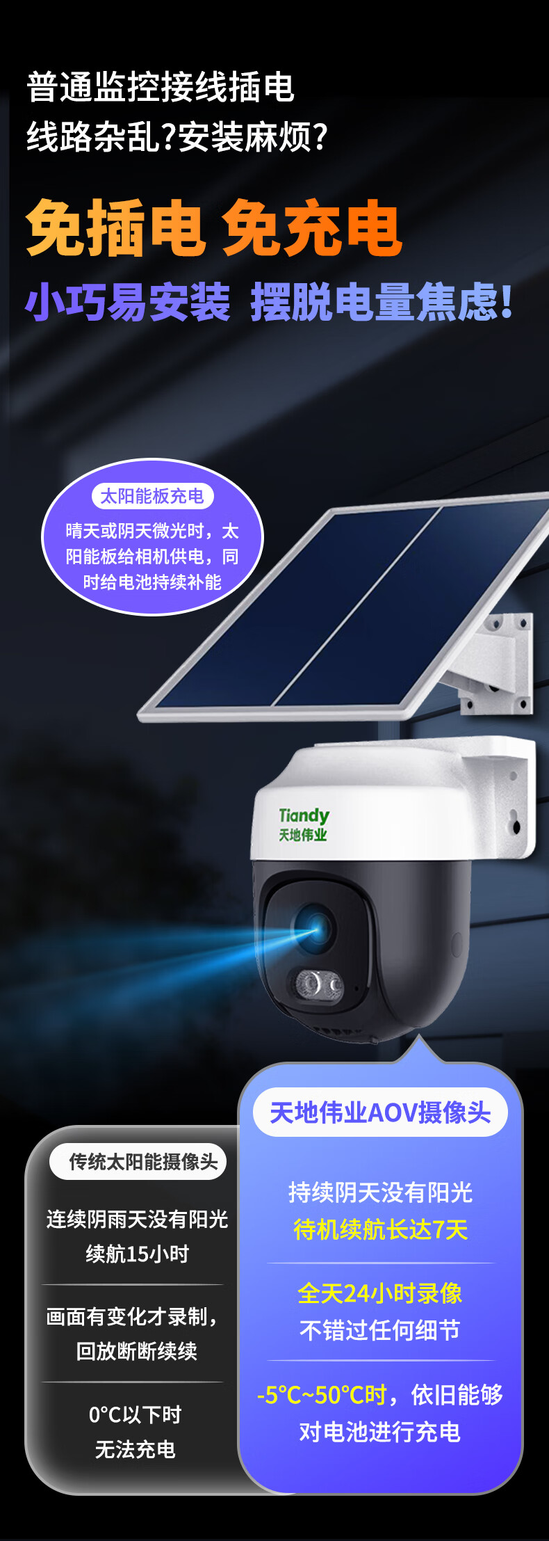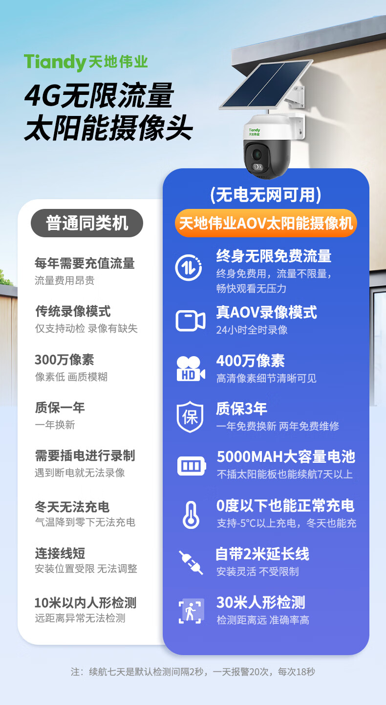天地伟业太阳能家用监控摄像头400万 4G无限流 室外监控器360度无死角 手机远程全景全彩夜视追踪+64G卡