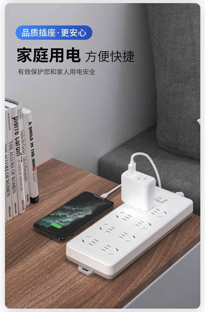 公正午多孔接线板多功能排插带USB办公宿舍家用插座带快充插排铜芯带线总控插排/插线板/插座 八位插孔0.8米【纯铜+防雷】