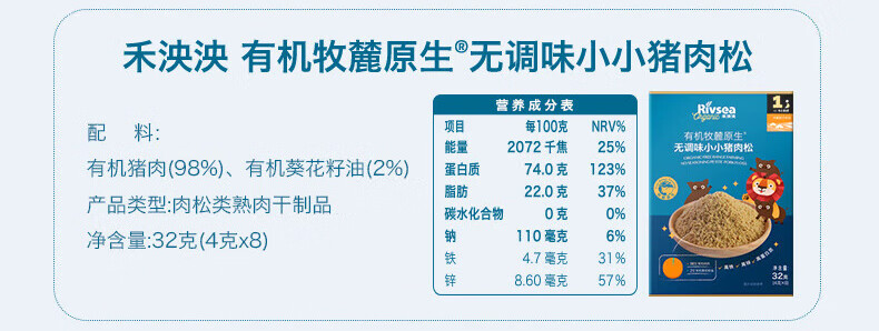 禾泱泱有机牧麓原生无调味小小猪肉松32g 98%猪肉高铁高锌可拌米粉面条