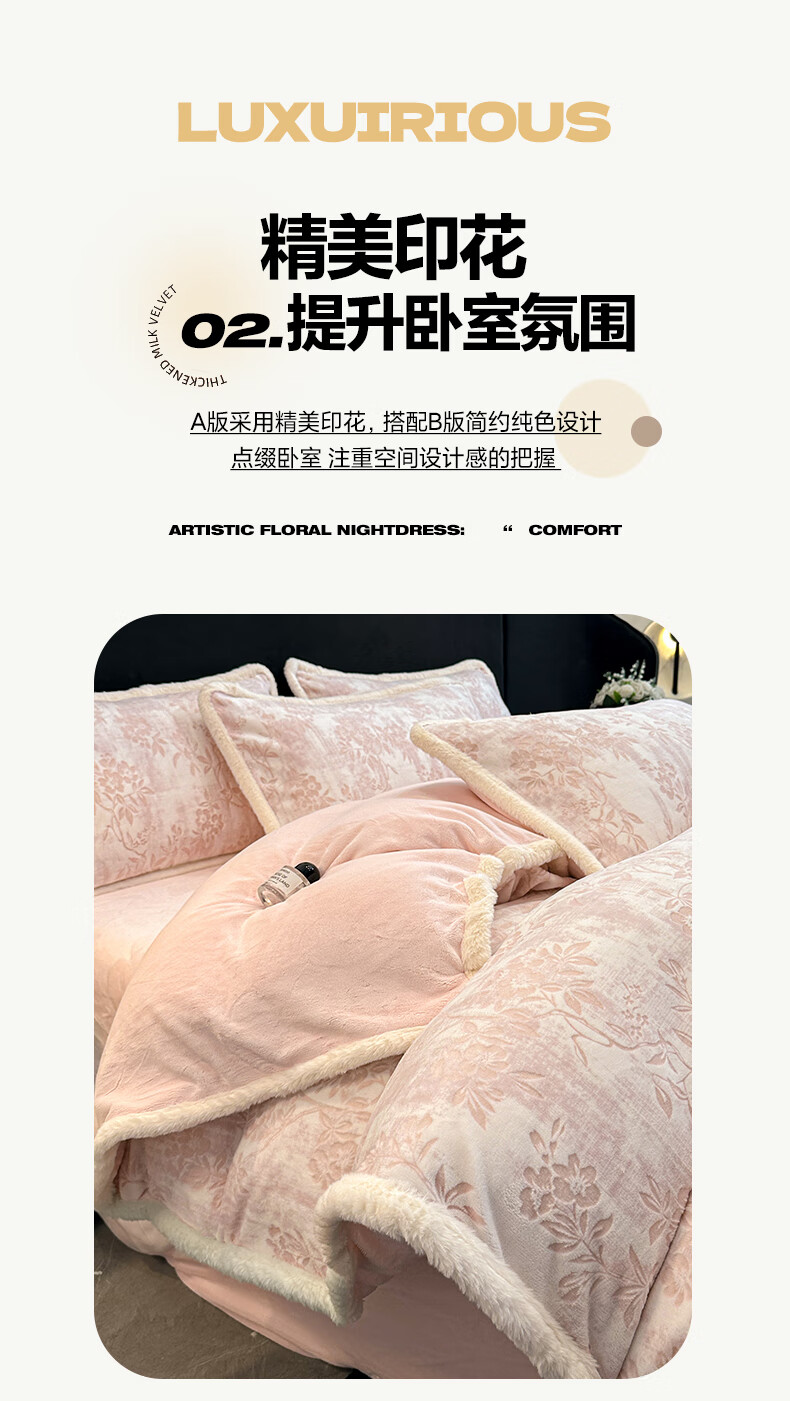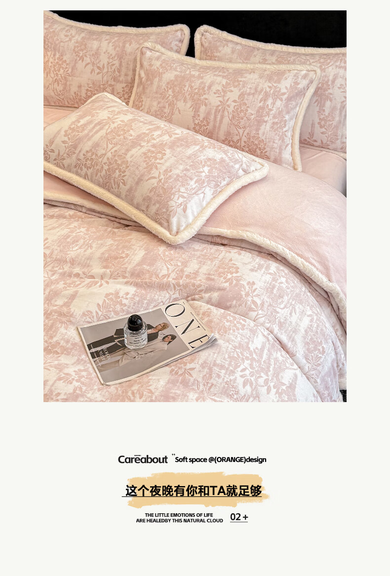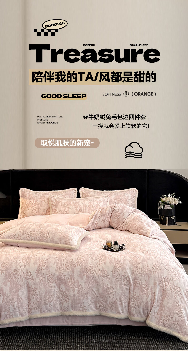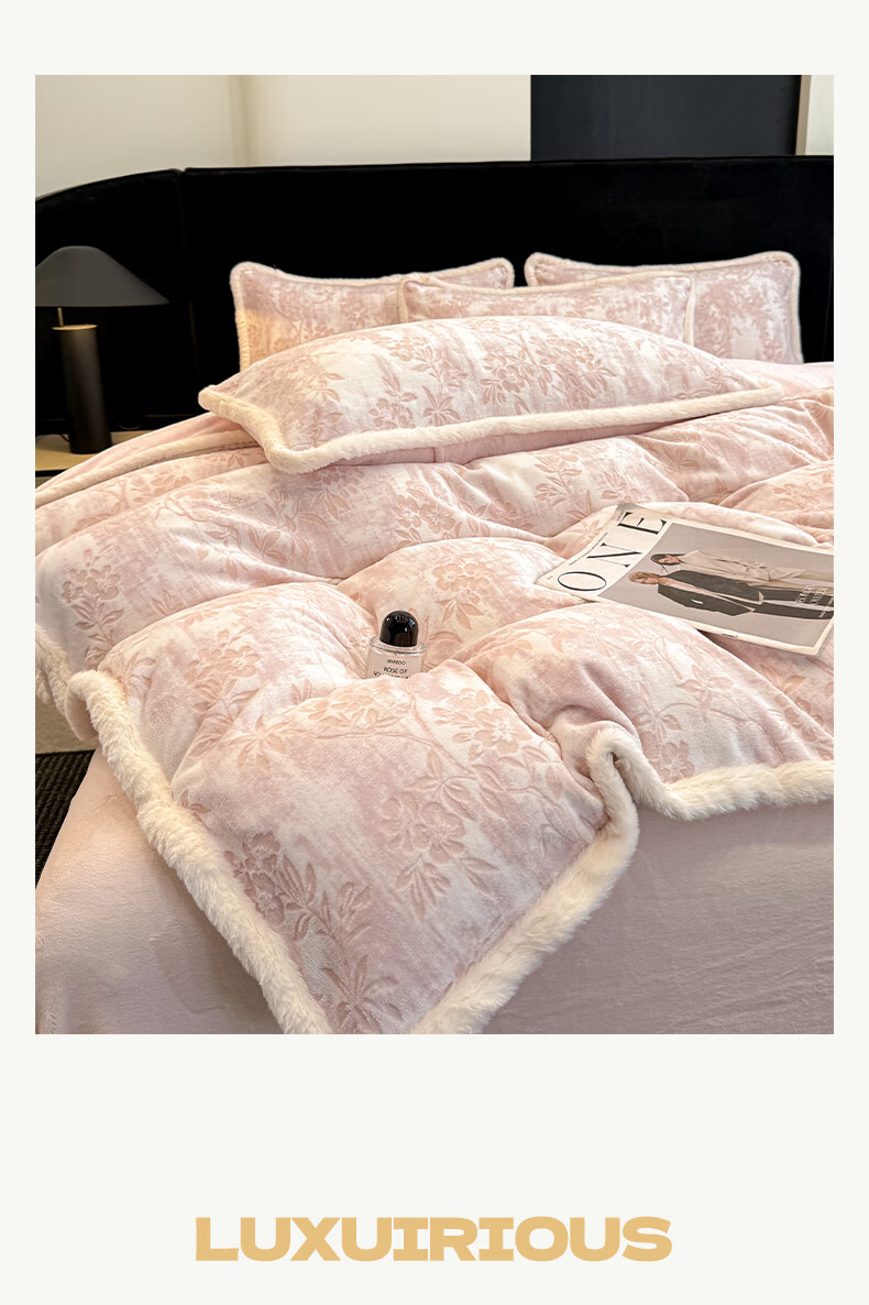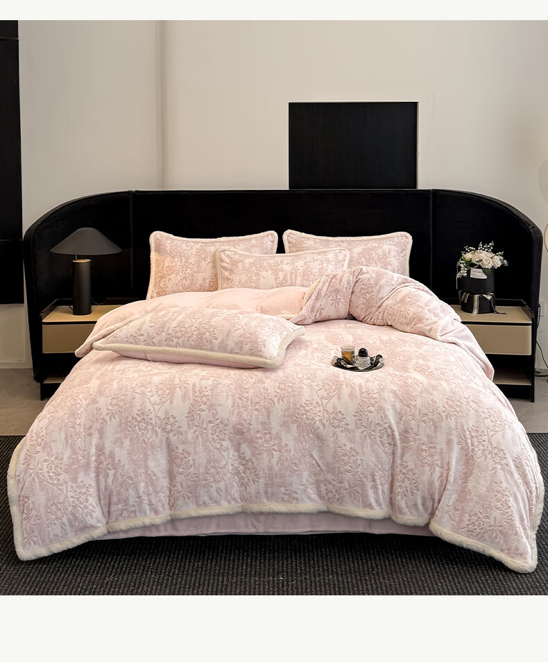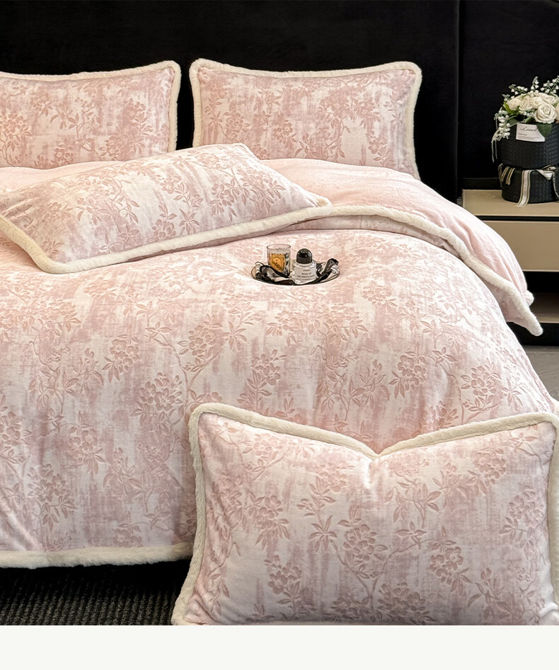 苏萱A类雕花牛奶绒四件套2025新款加绒被套床单人兔毛绒包边床上用品4 花枝-粉 1.8m 床单款 四件套-被套200x230cm