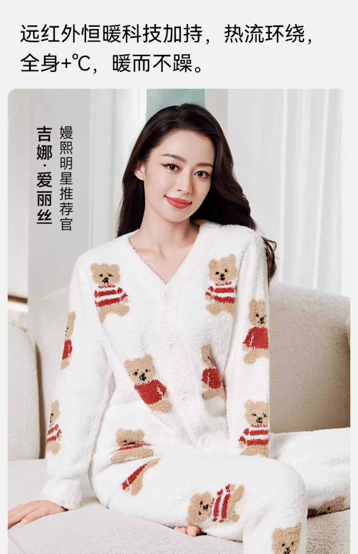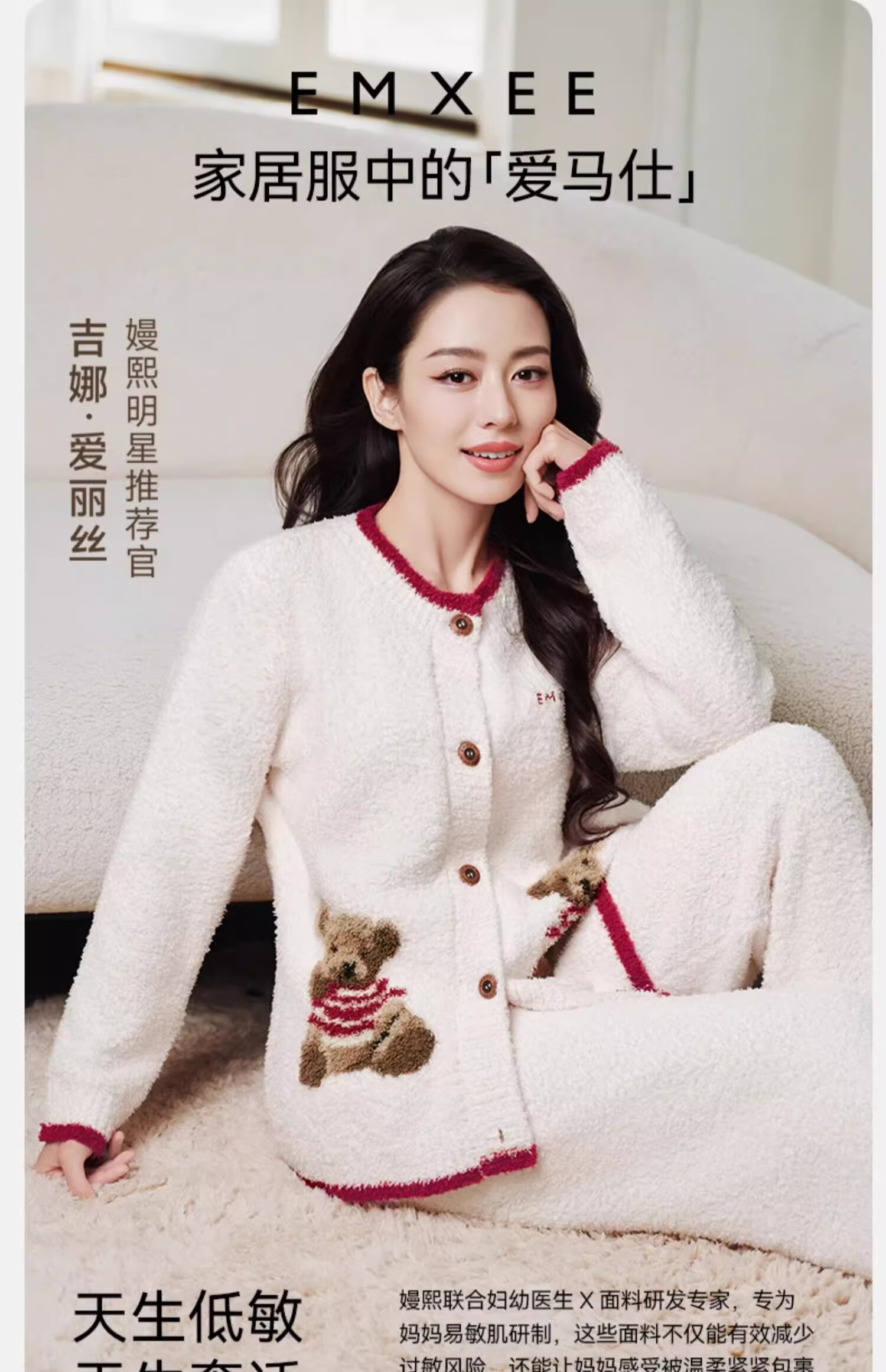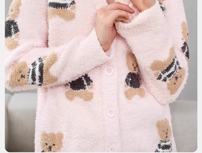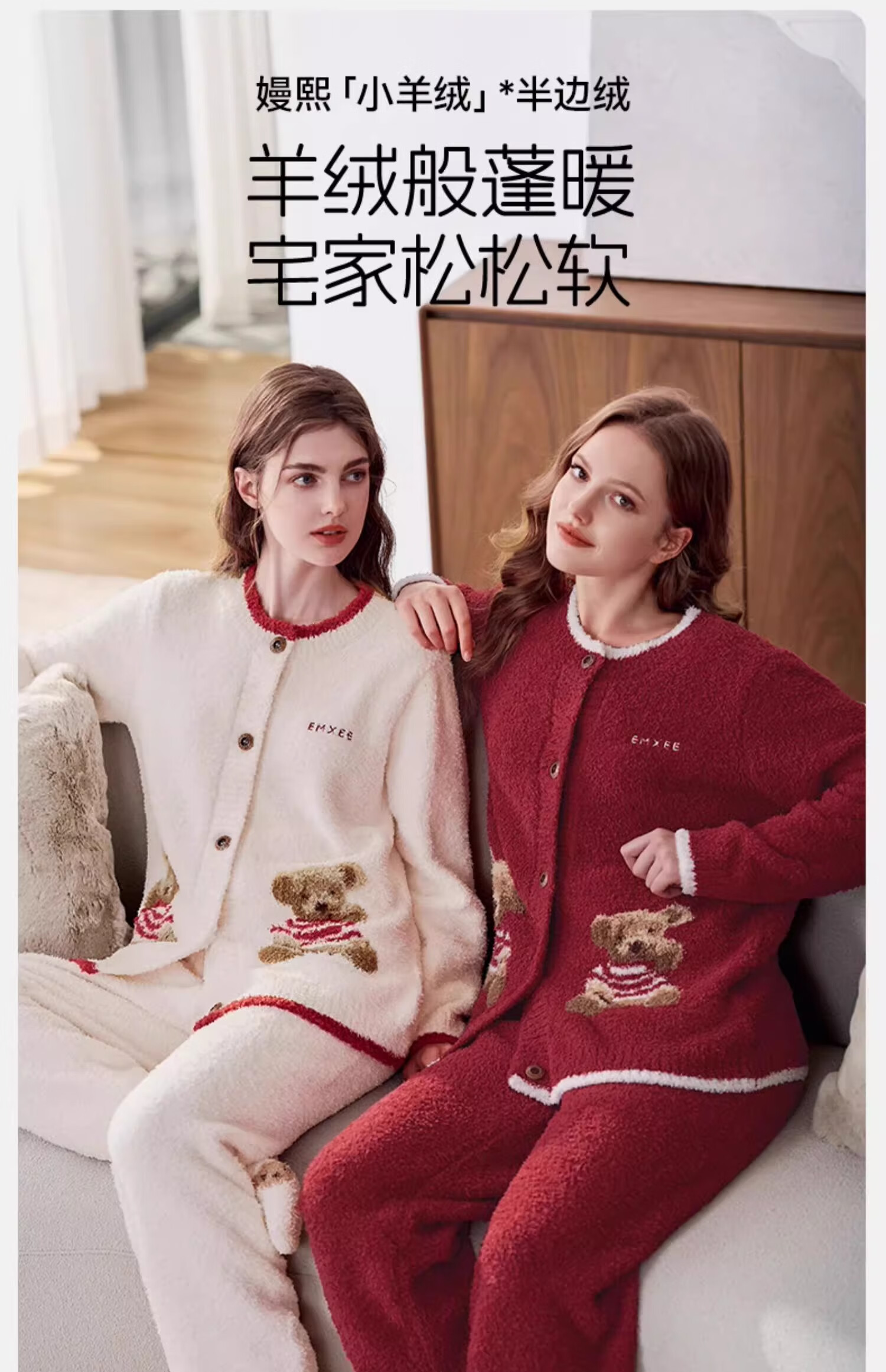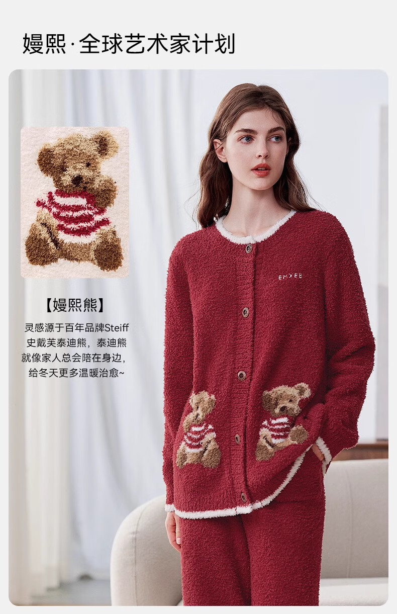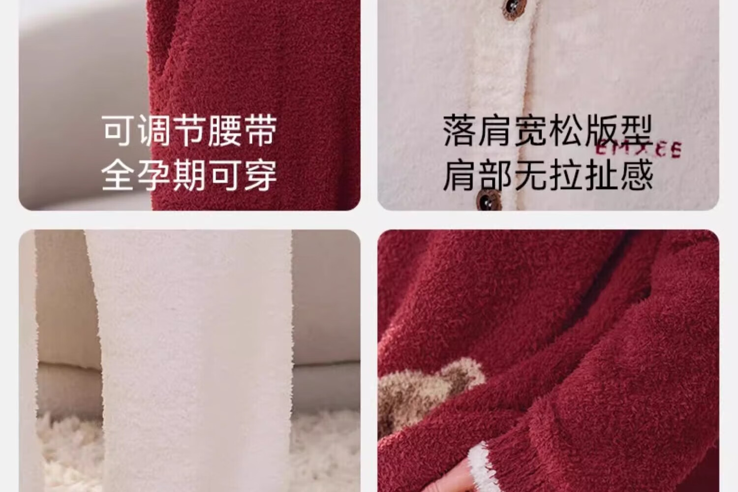 嫚熙(EMXEE)秋冬季小熊半边绒孕妇睡衣哺乳产妇加绒月子服产后家居服套装 经典熊-粉色【小羊绒】 XL