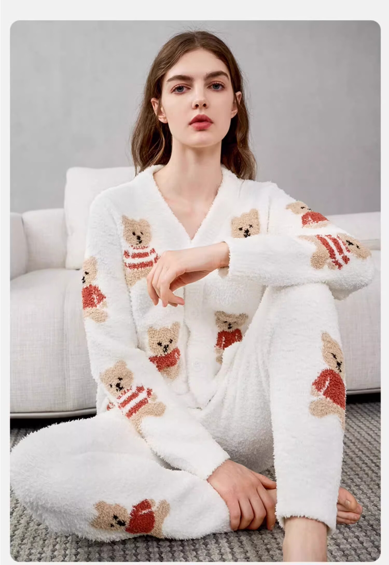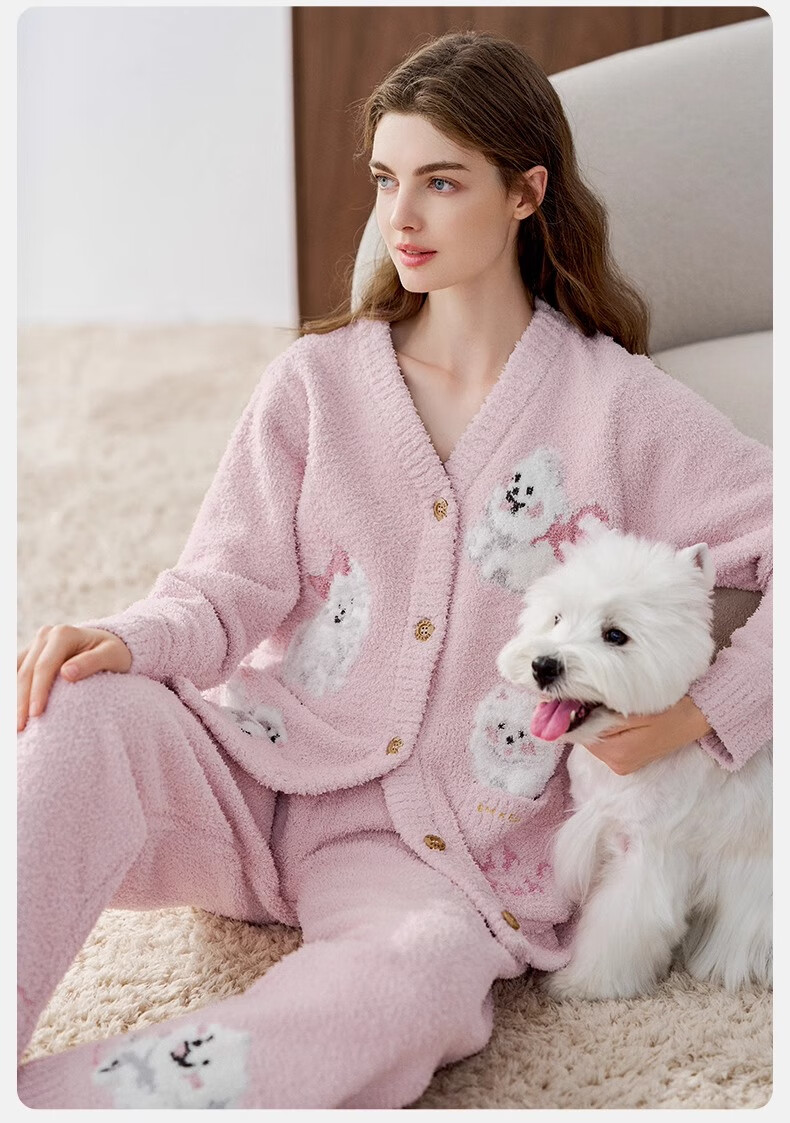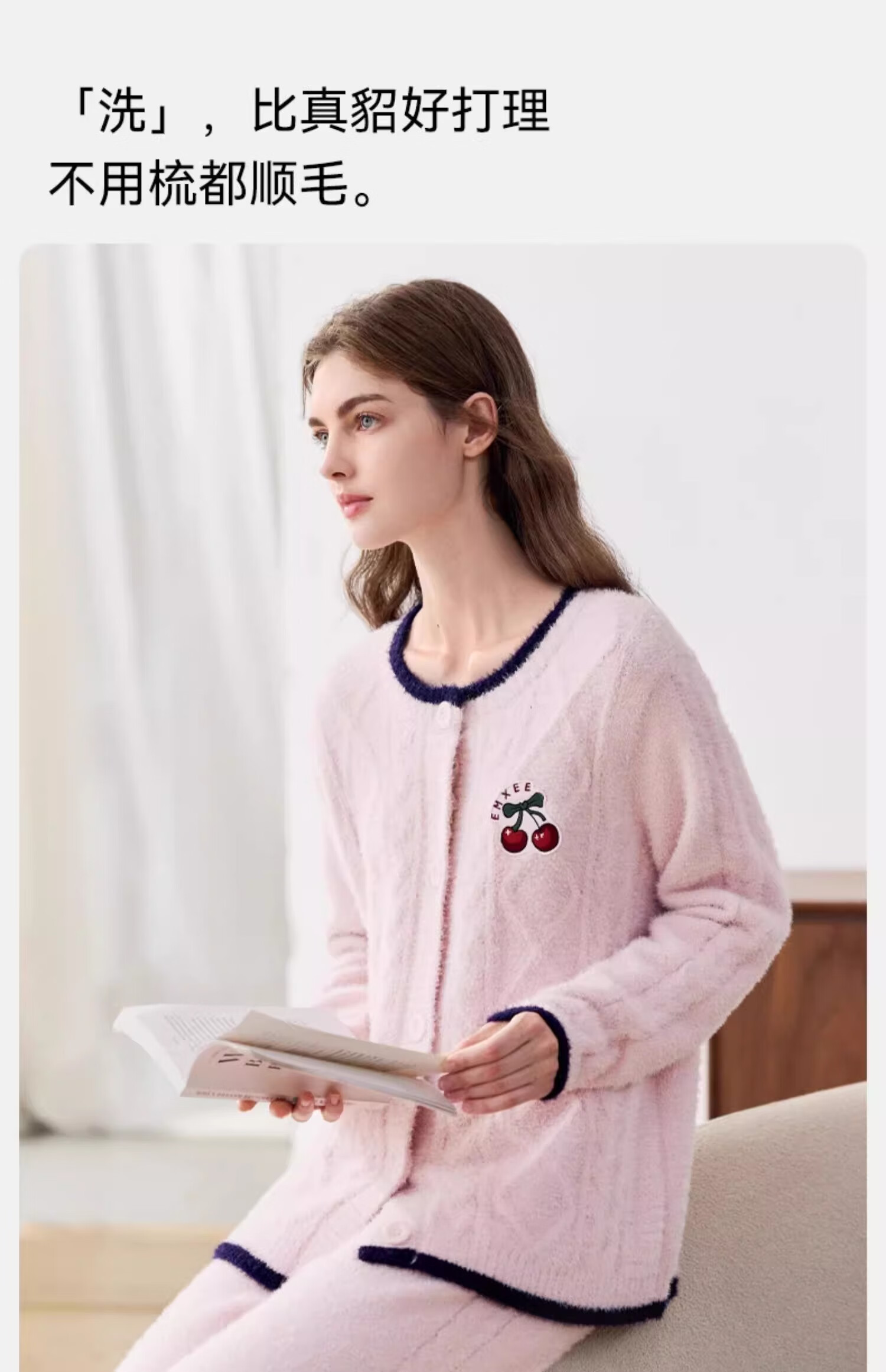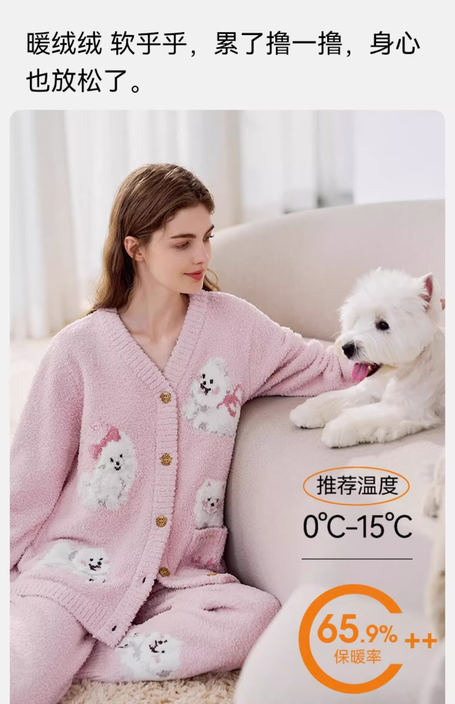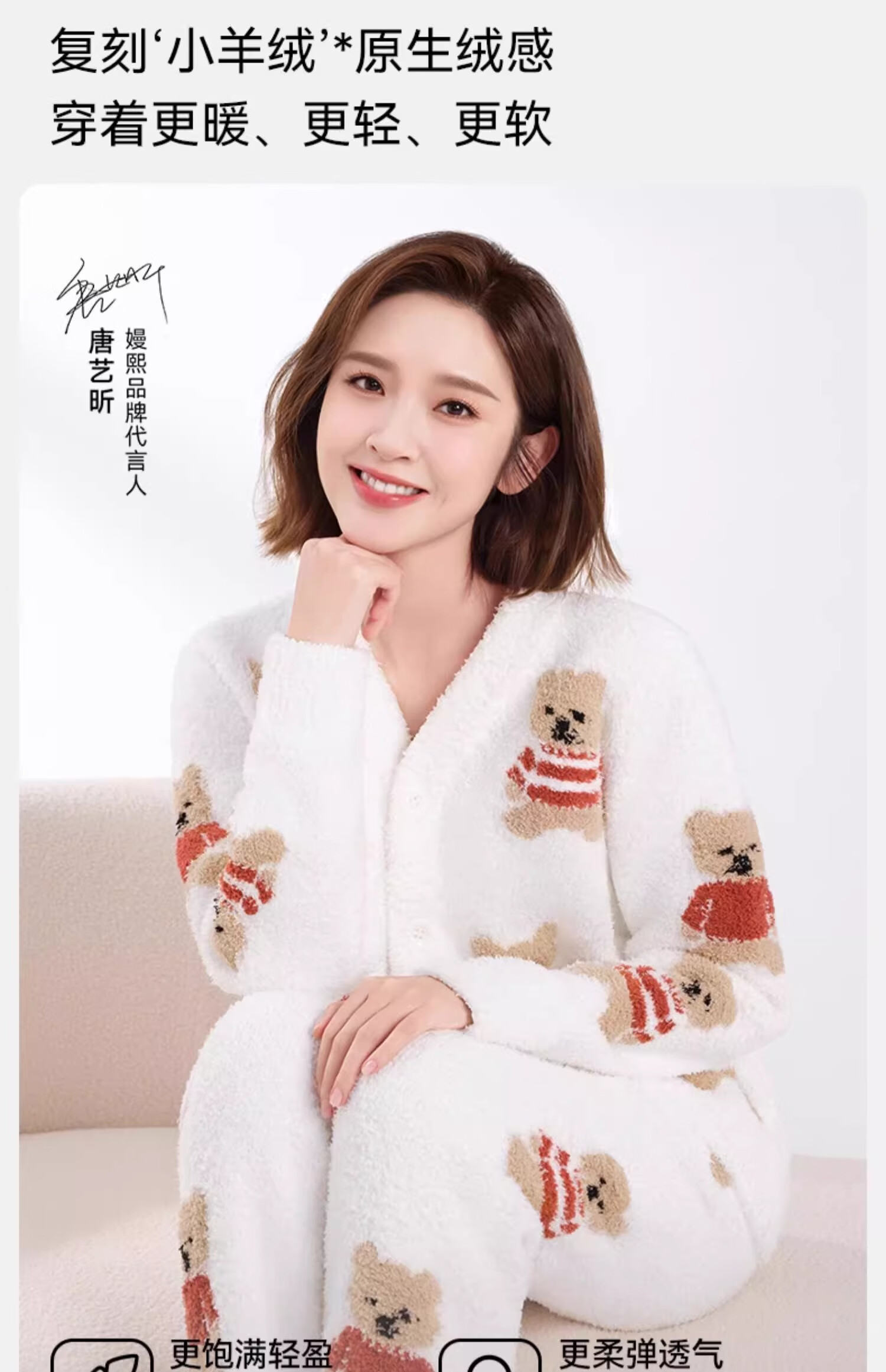 嫚熙(EMXEE)秋冬季小熊半边绒孕妇睡衣哺乳产妇加绒月子服产后家居服套装 经典熊-粉色【小羊绒】 XL