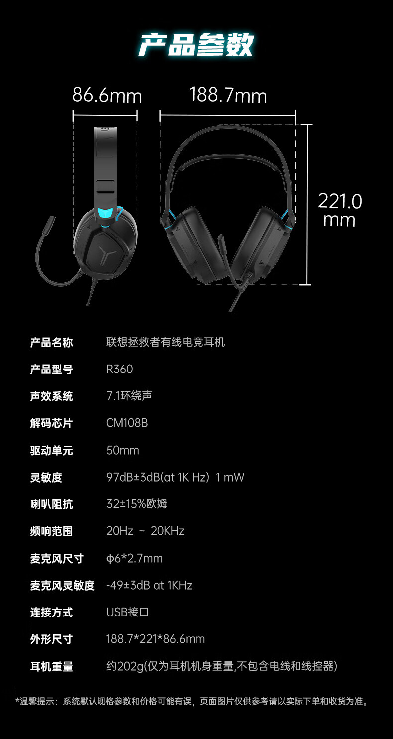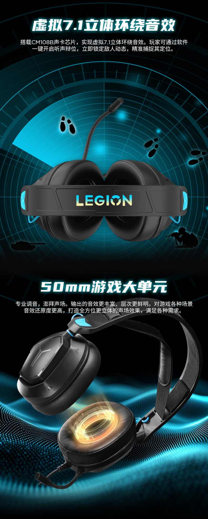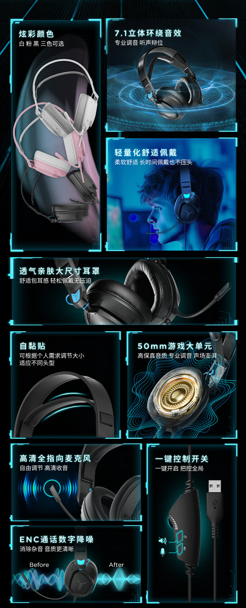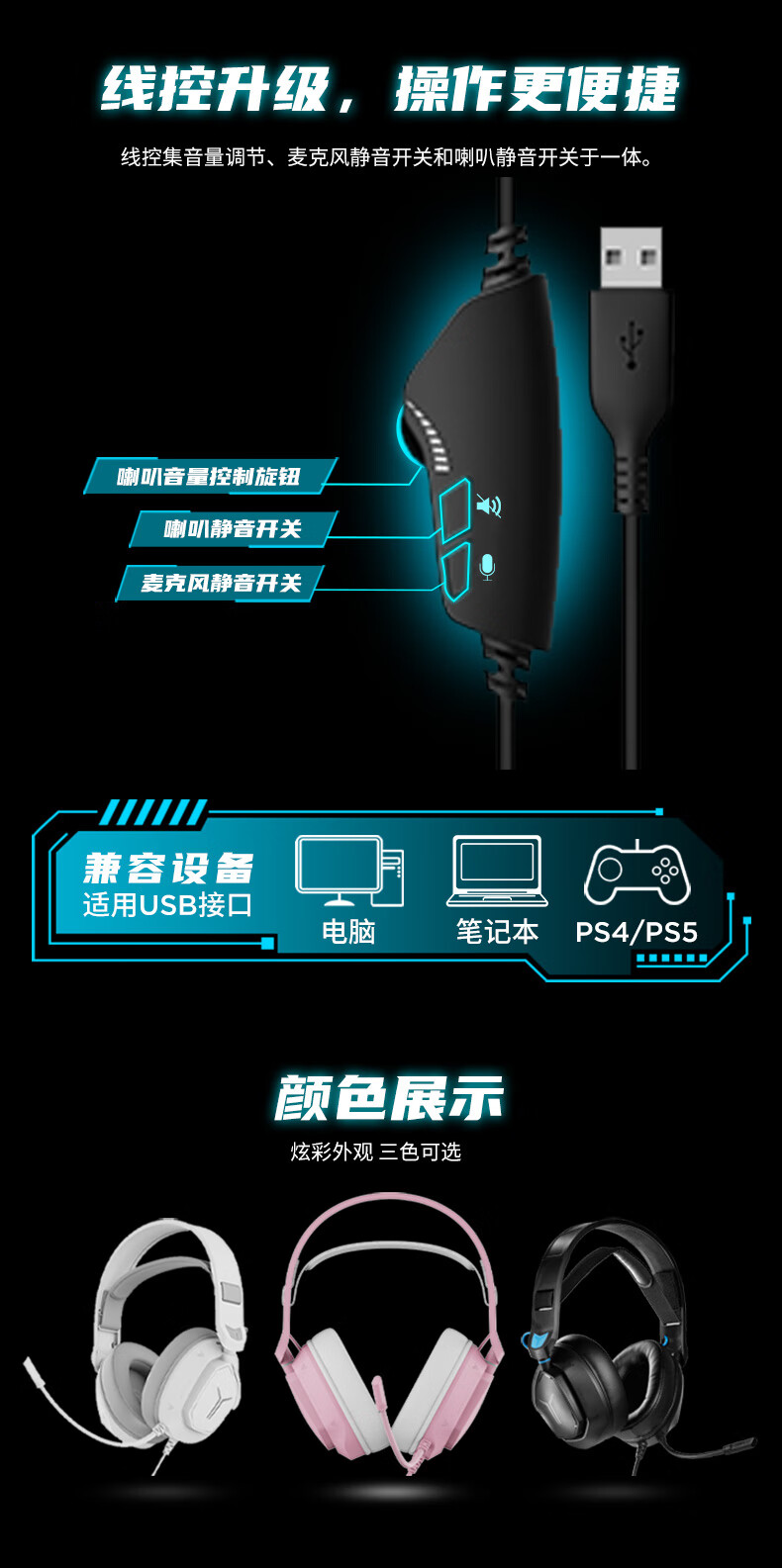 联想(Lenovo)拯救者有线电竞耳机R360粉 7.1环绕升级音效 50mm游戏大单元 游戏耳机头戴式有线电脑电竞耳机耳麦