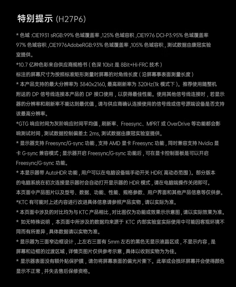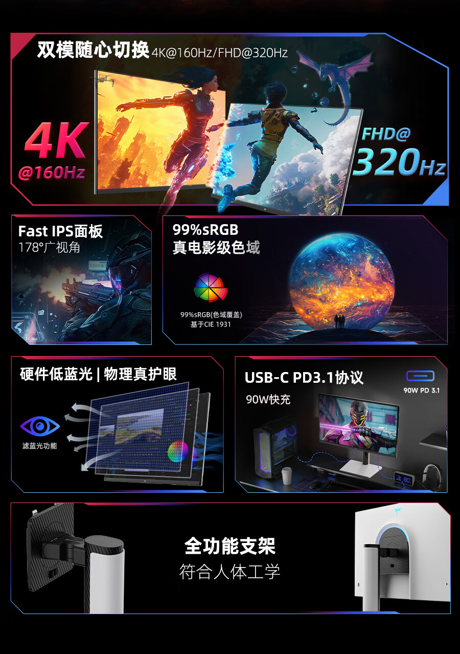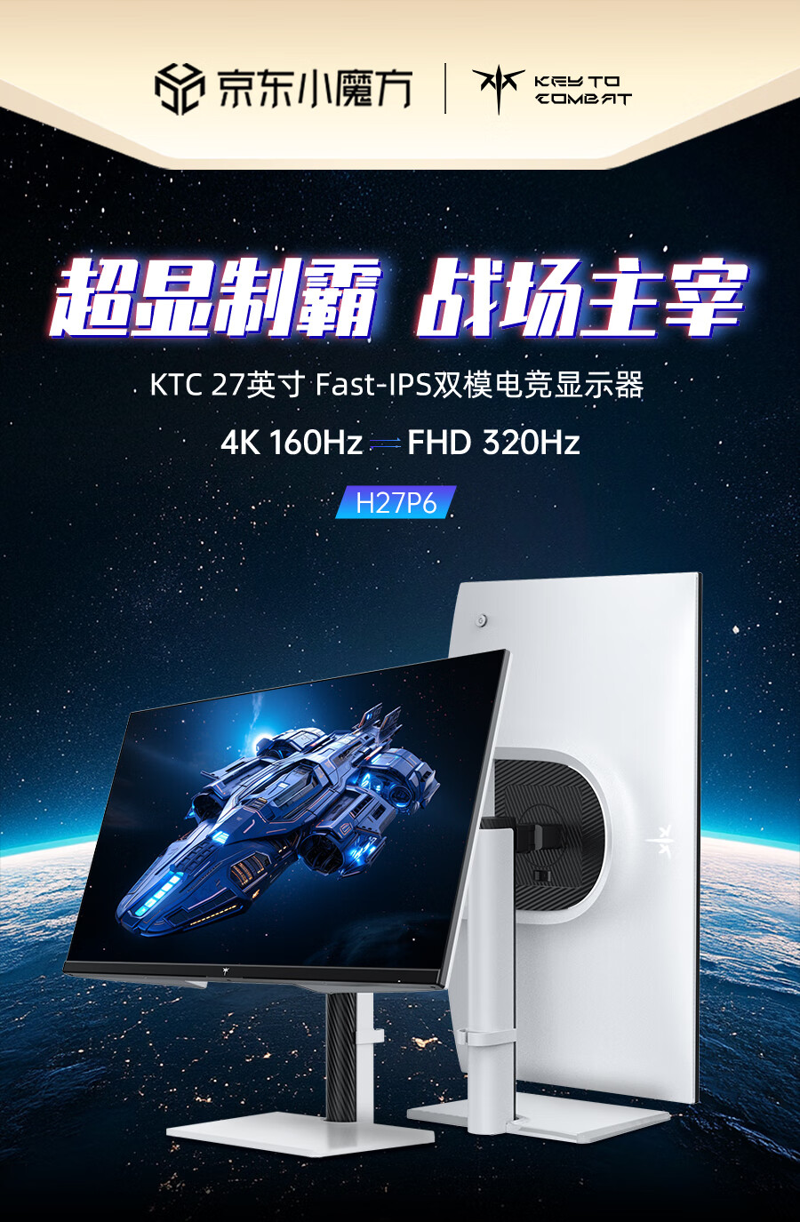 KTC 27英寸4K 160Hz/FHD 320Hz双模Type-c 90w Switch2外接 国家补贴400nit显示屏电脑显示器 H27P6