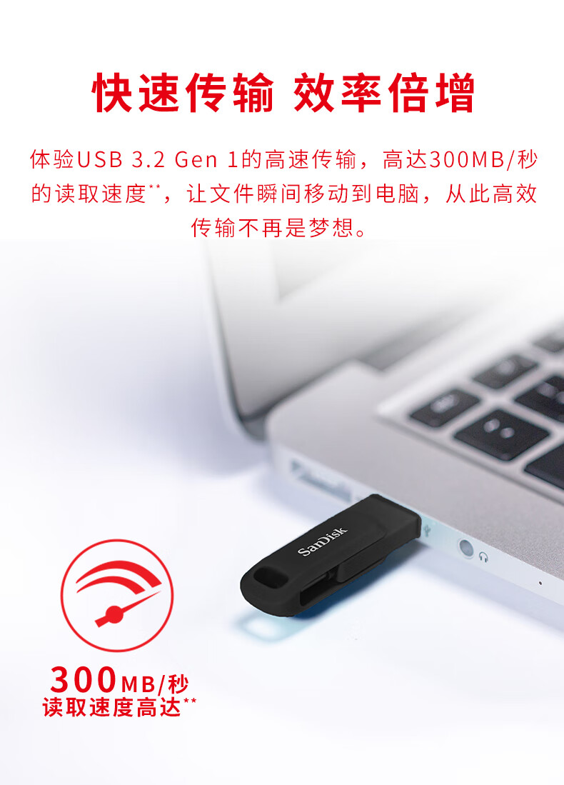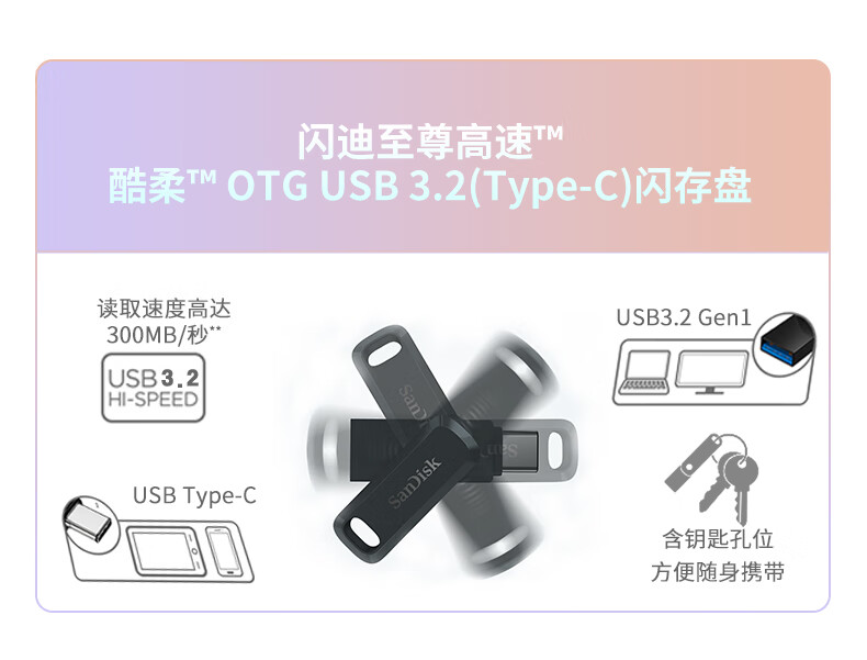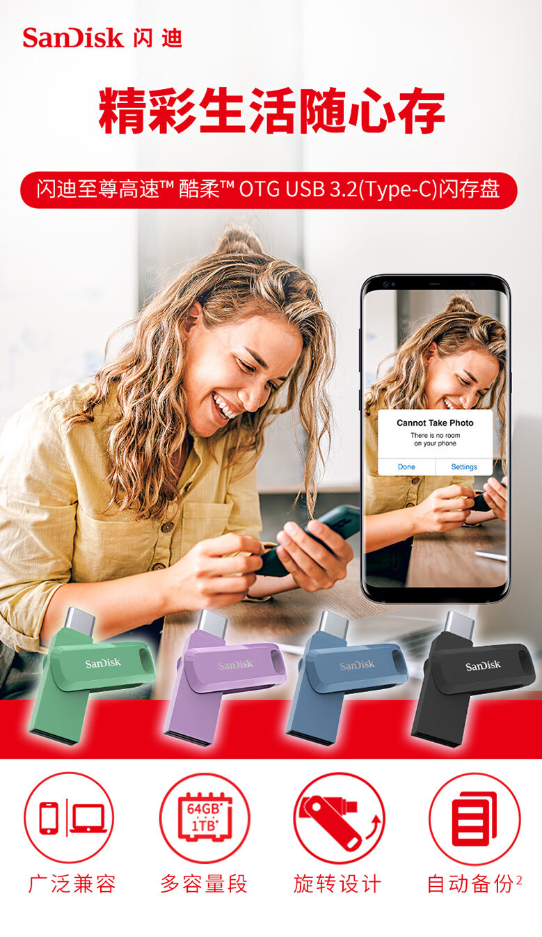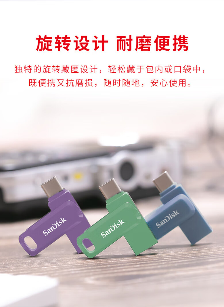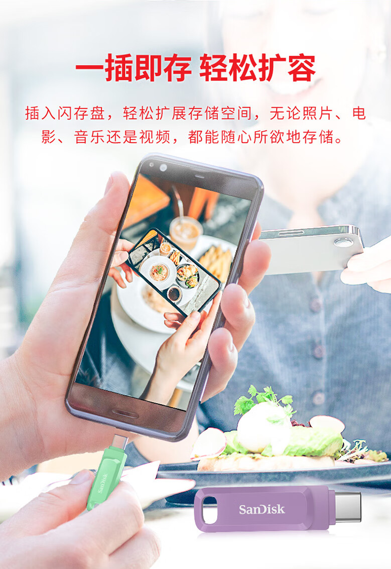 闪迪(SanDisk)64GB Type-C USB3.2 手机U盘DDC3黑色 读速高达300MB/s 自动备份 手机电脑两用 双接口大容量优盘
