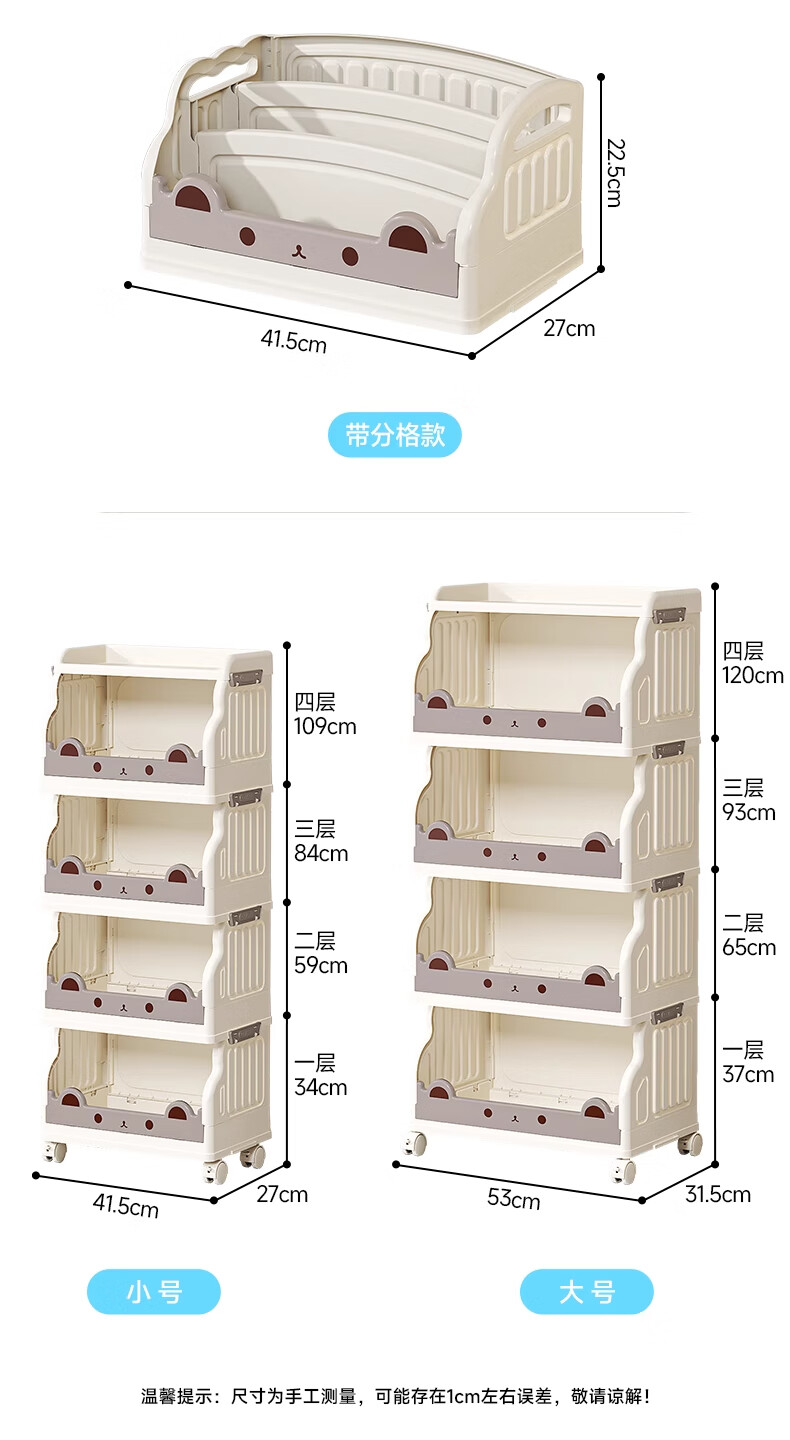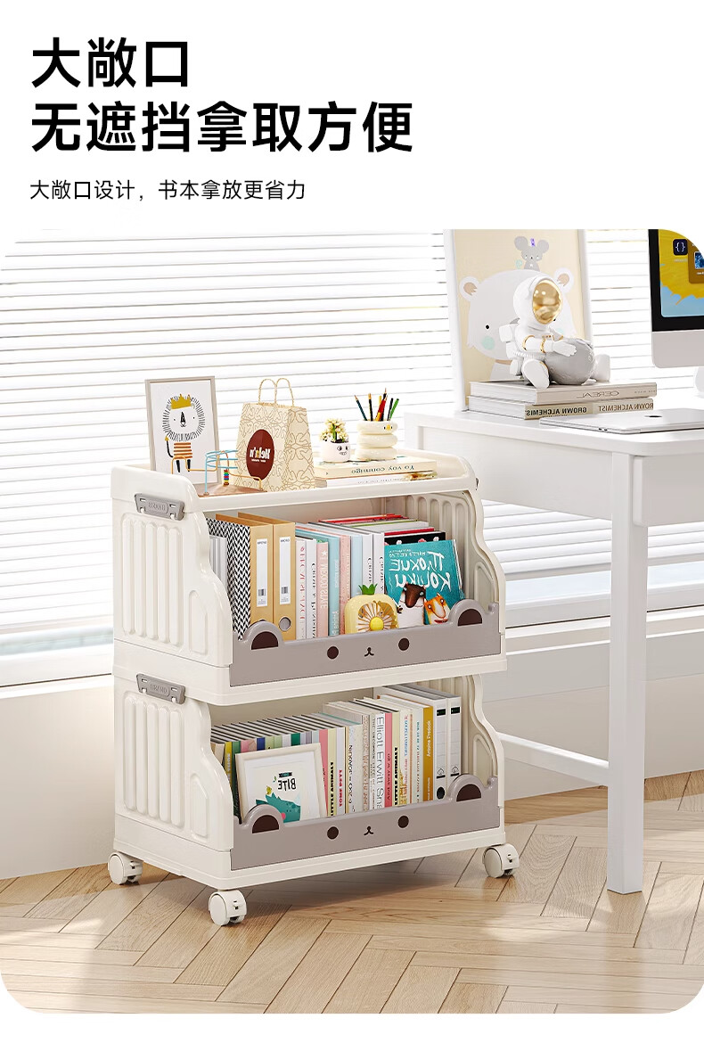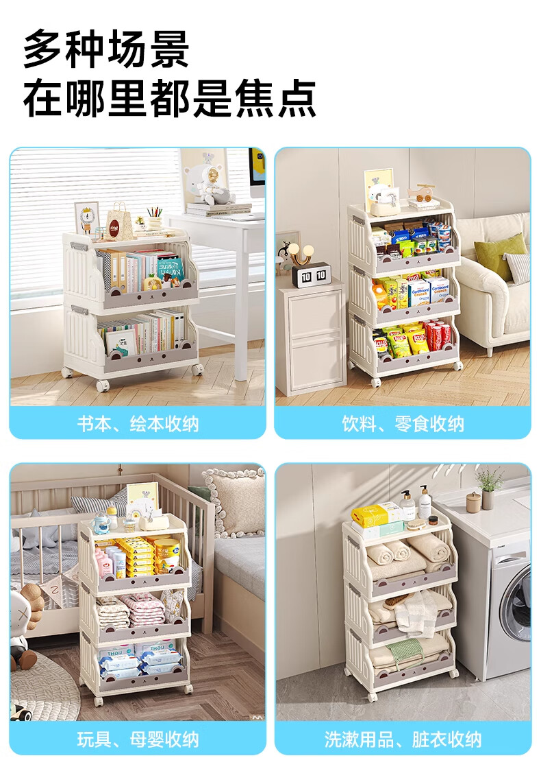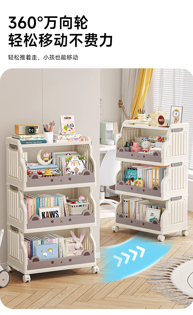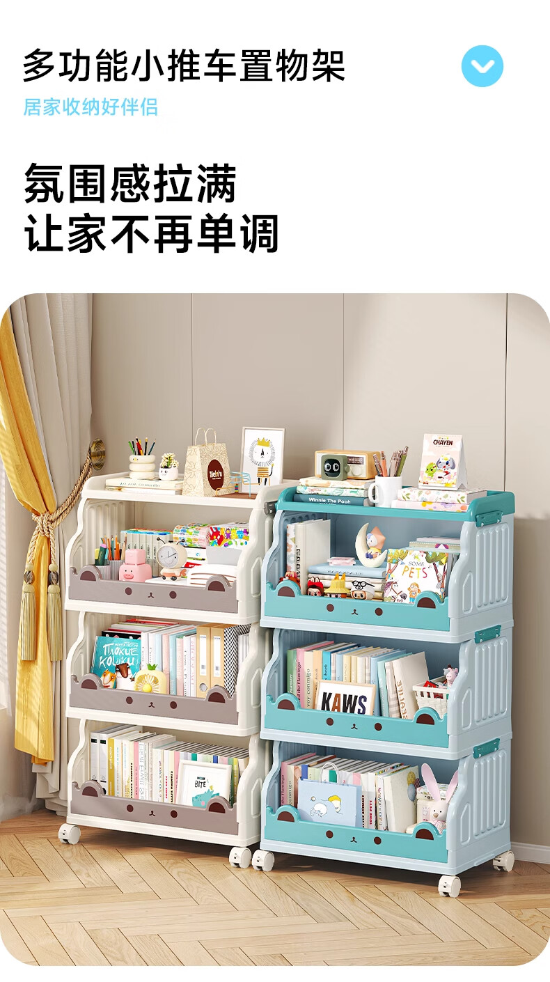 木格格书架可移动小推车收纳架书本文具书包置物架零食小推车收纳分层架 蓝色小号三层【可移动滑轮】