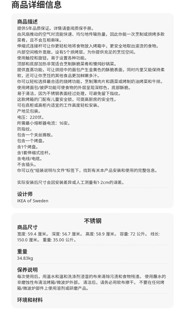 宜家(IKEA)SMAKSAK斯玛克萨克强制风烤箱不锈钢家用电器 强制风烤箱不锈钢