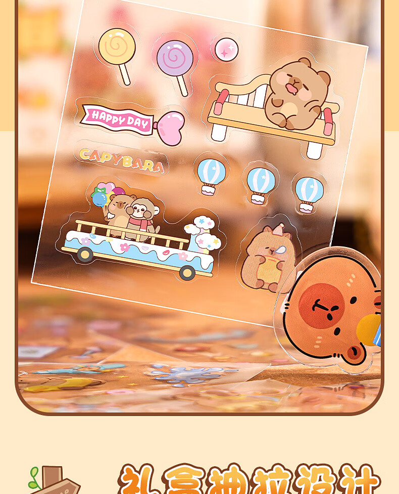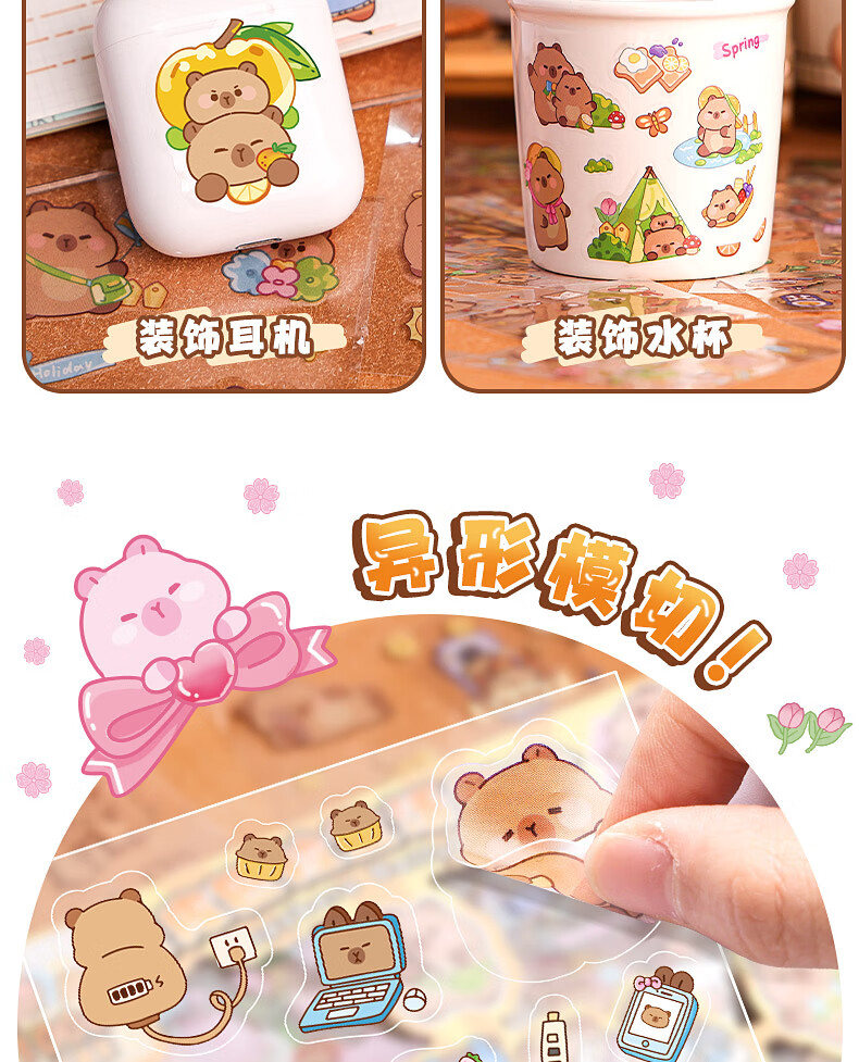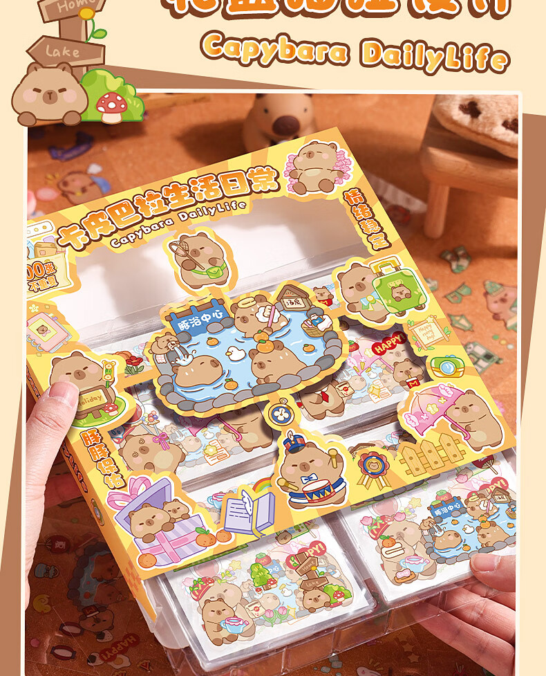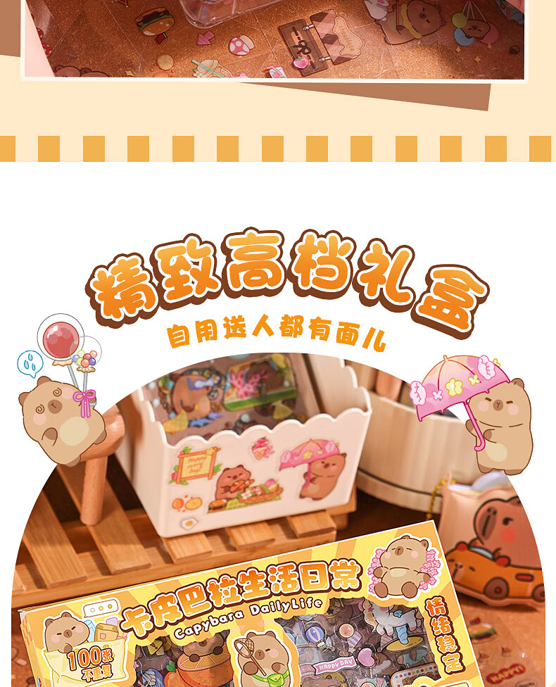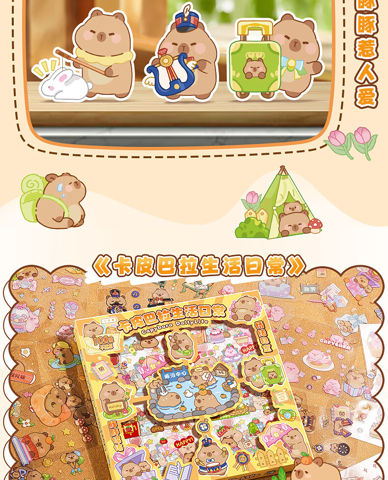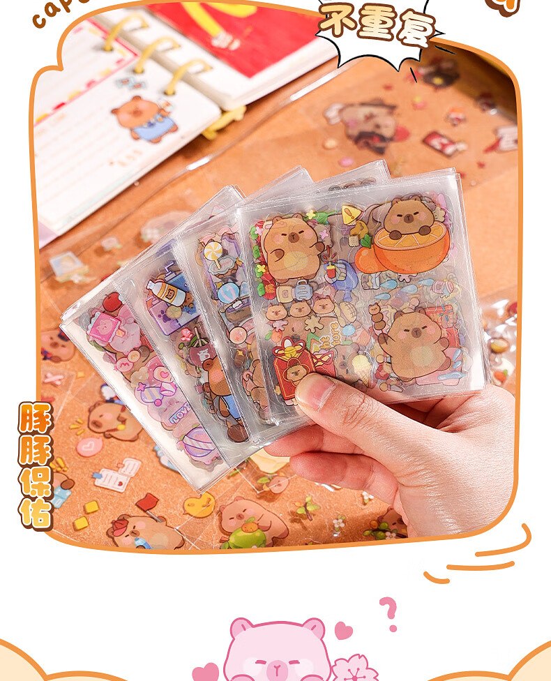 咔巴熊 手账贴纸高颜值透明 100张不重复可爱套装 咕卡贴画 卡皮巴拉生活日常
