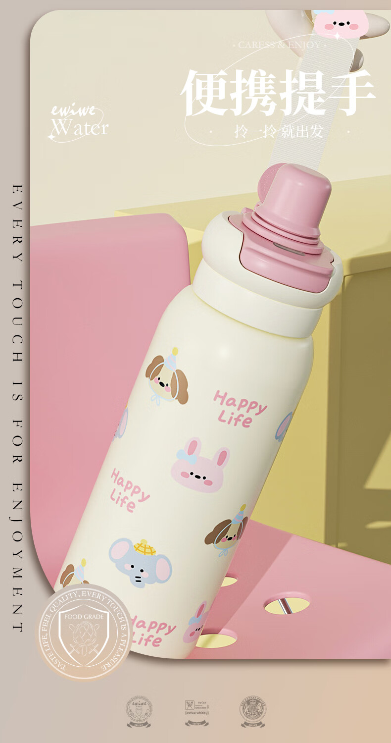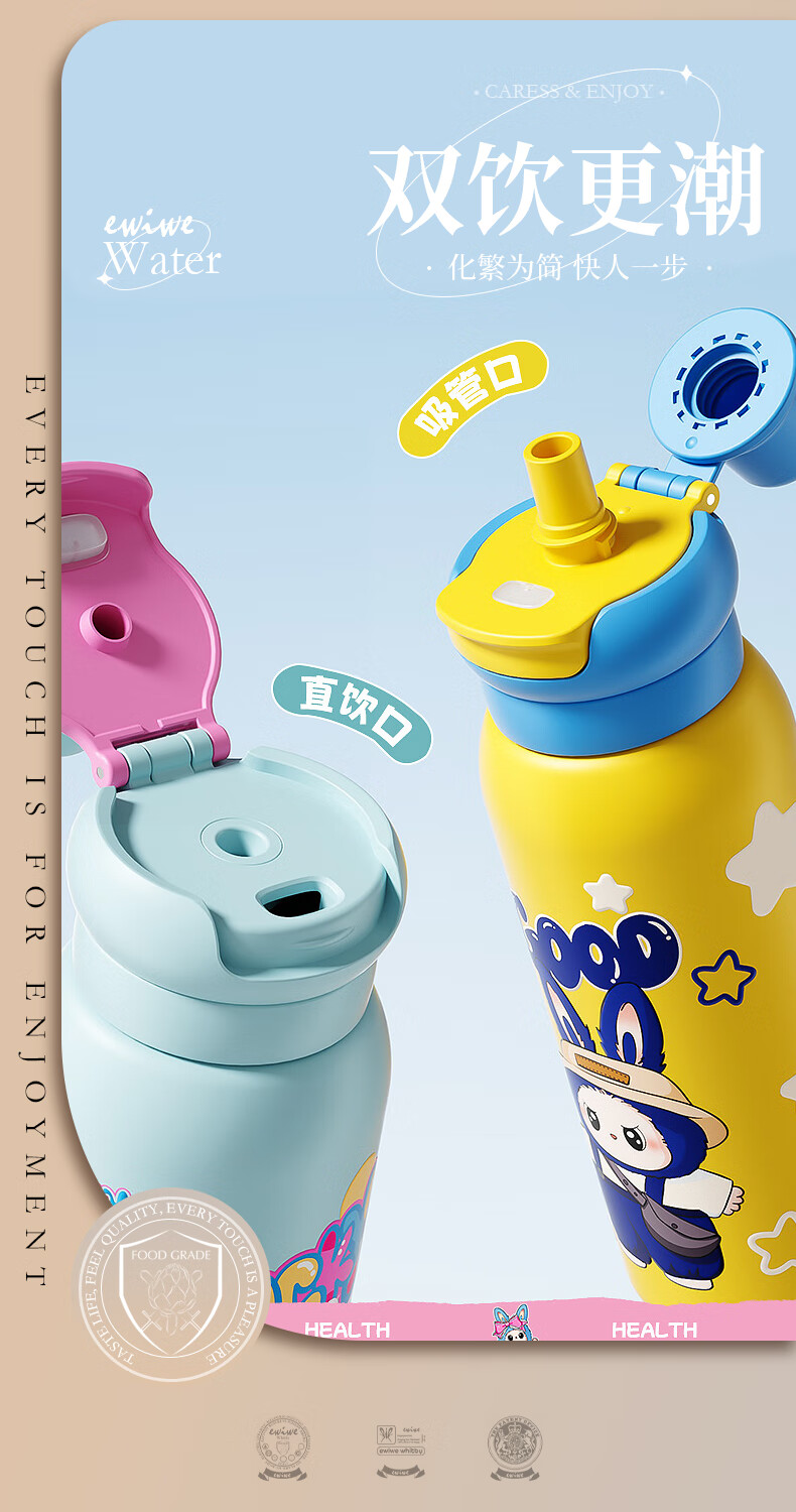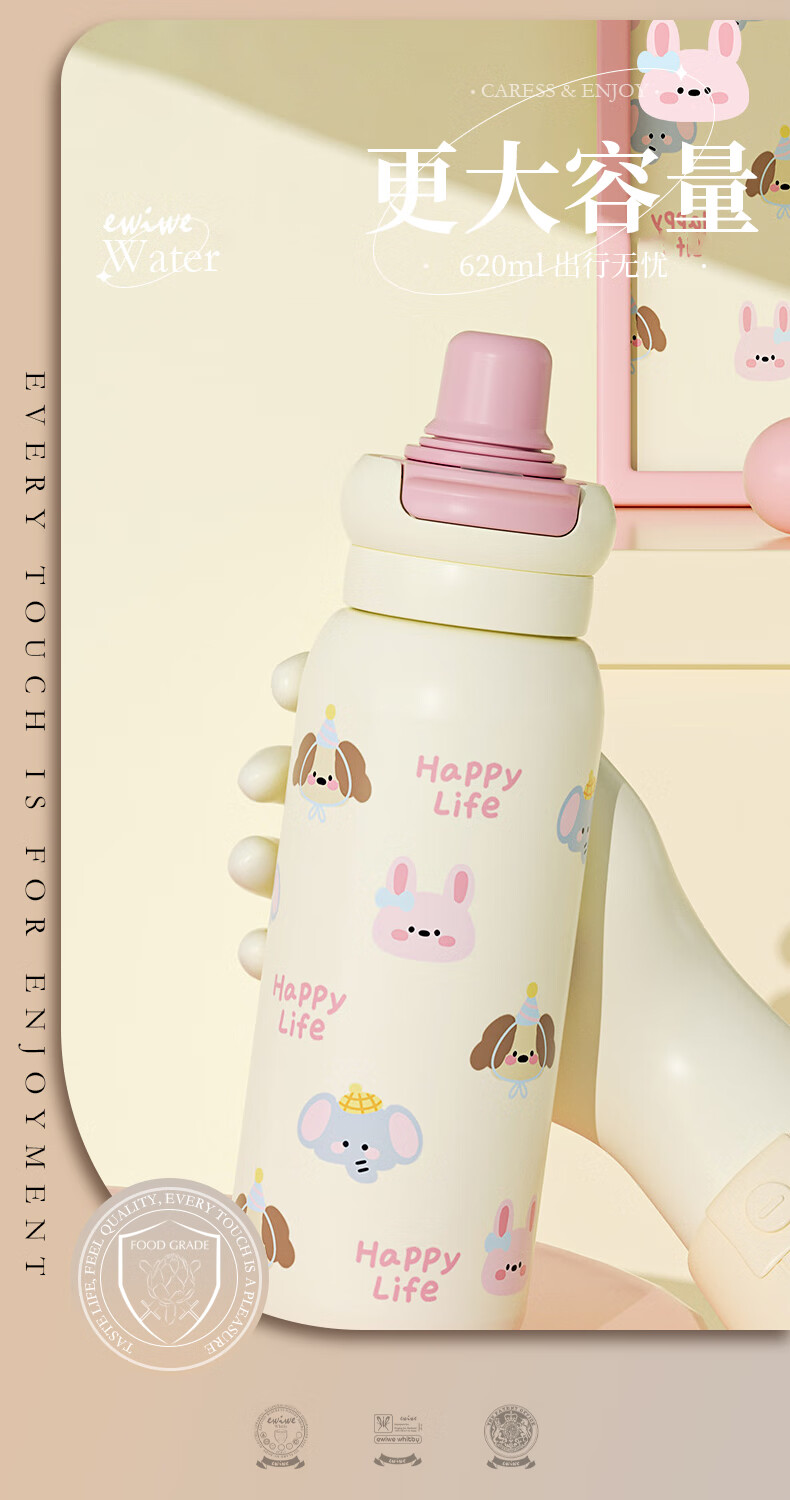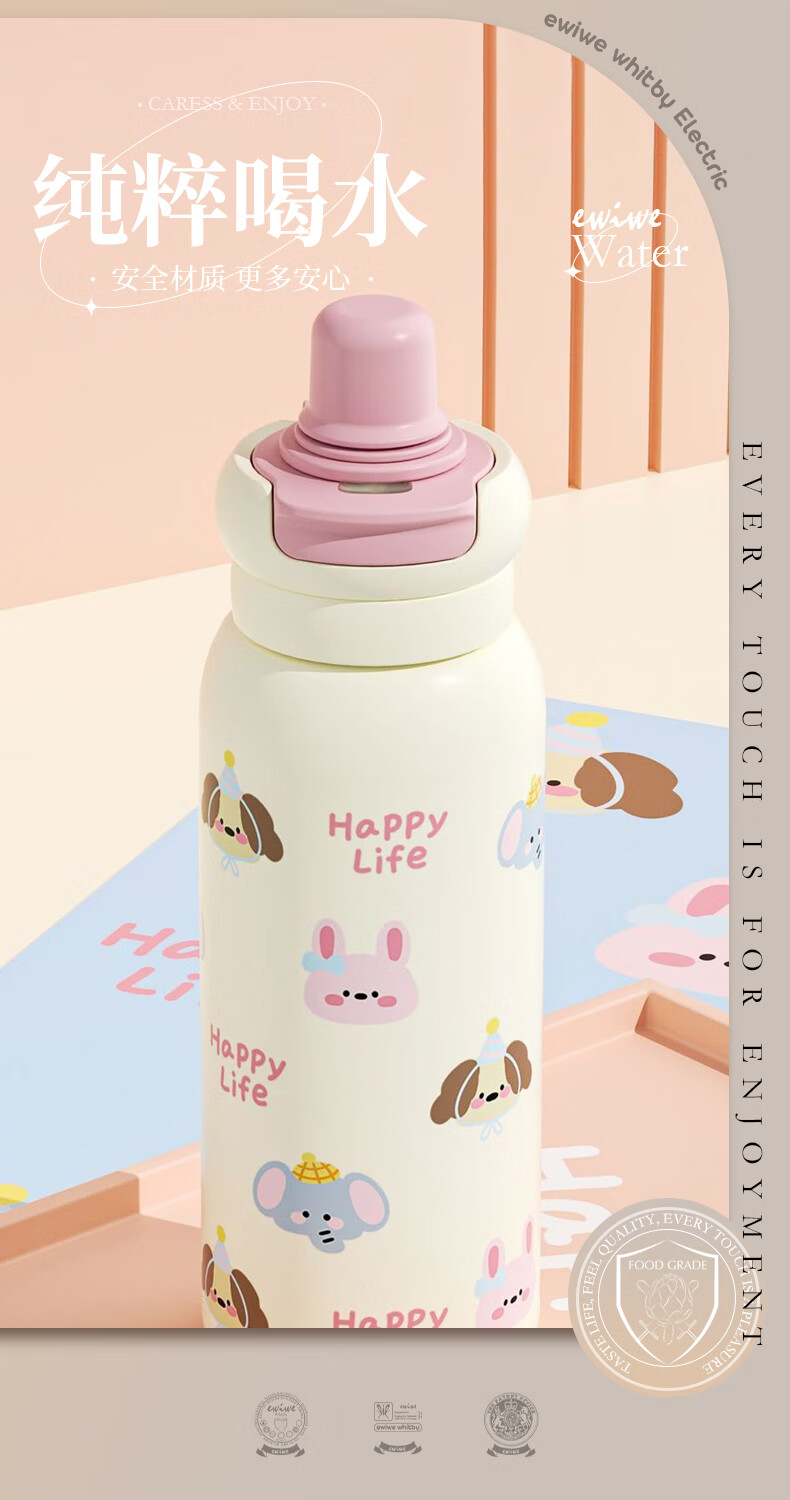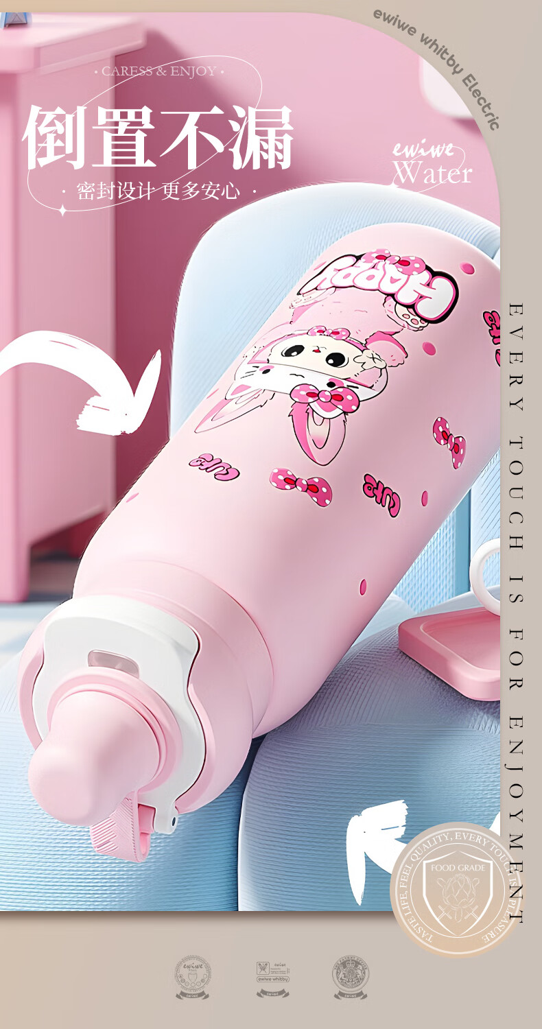 EWIWE保温杯女大容量316新款高颜值吸管杯子运动上学专用便携双饮水壶 粉色奶椰椰/食品级材质/双饮盖/620ml