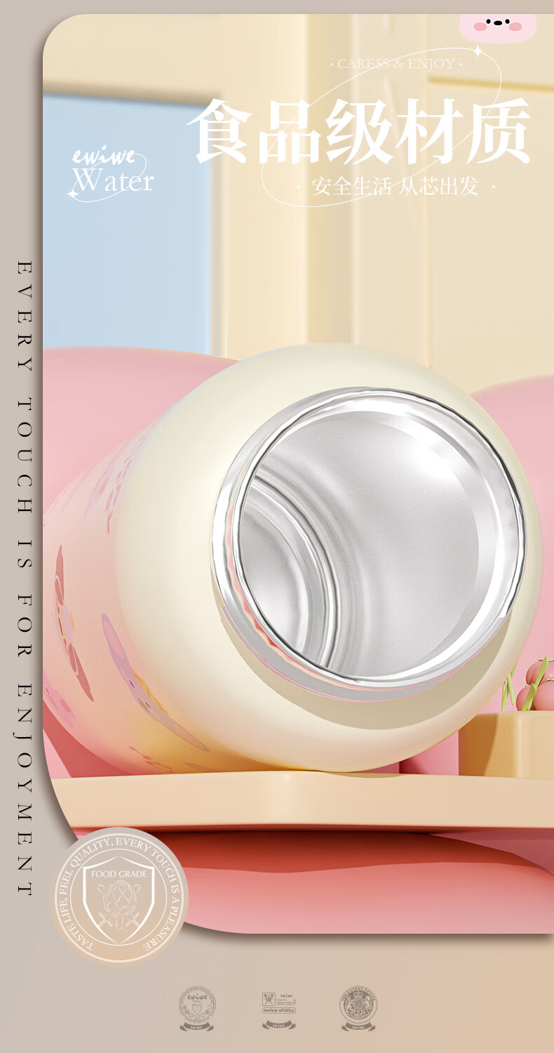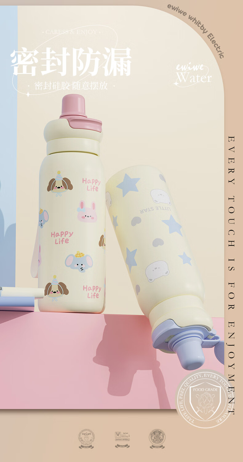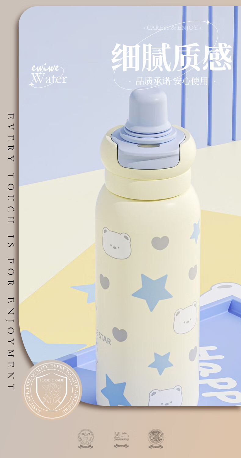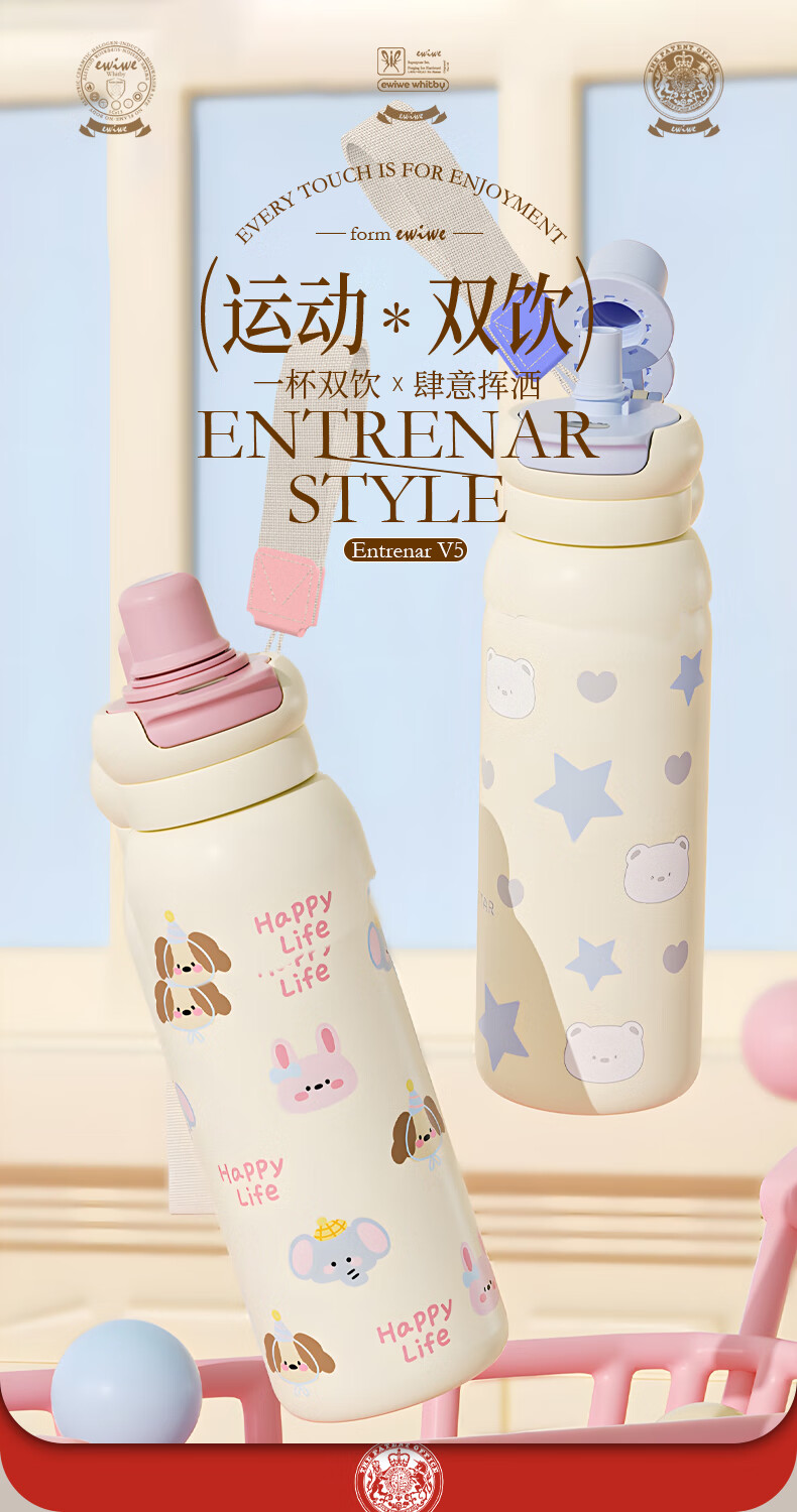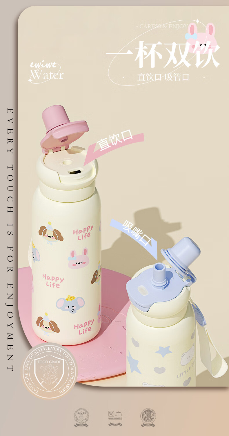 EWIWE保温杯女大容量316新款高颜值吸管杯子运动上学专用便携双饮水壶 粉色奶椰椰/食品级材质/双饮盖/620ml