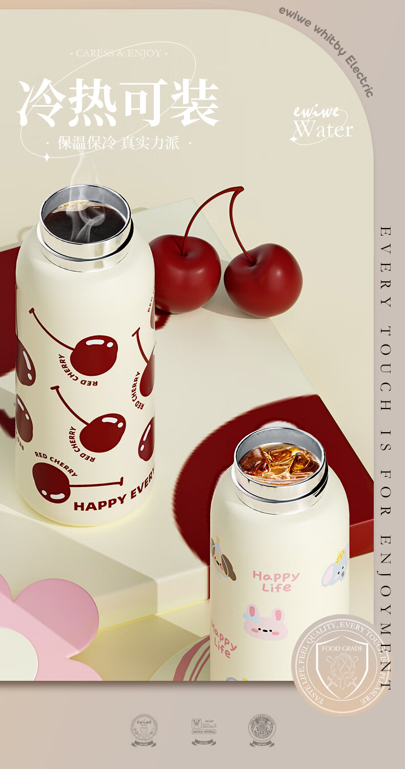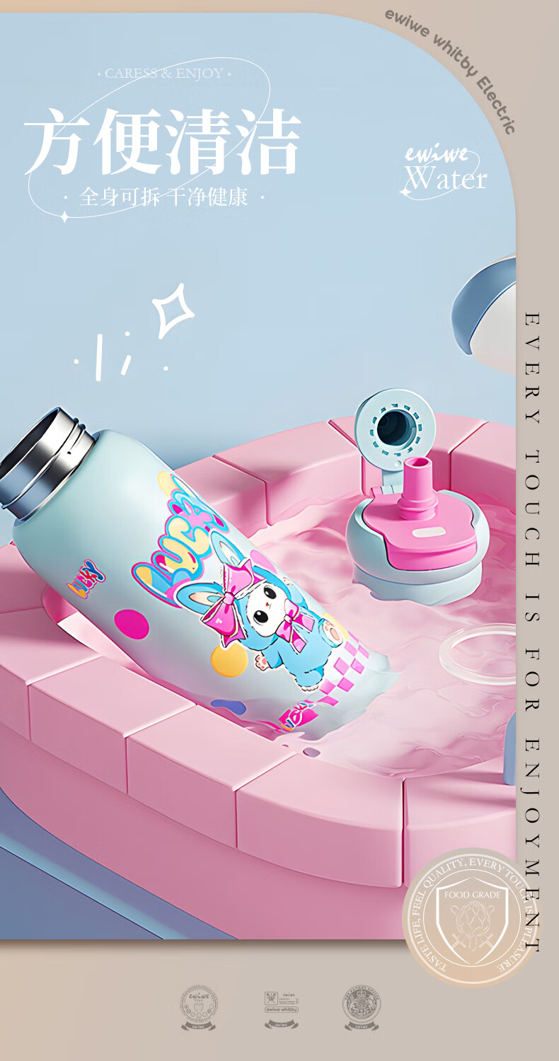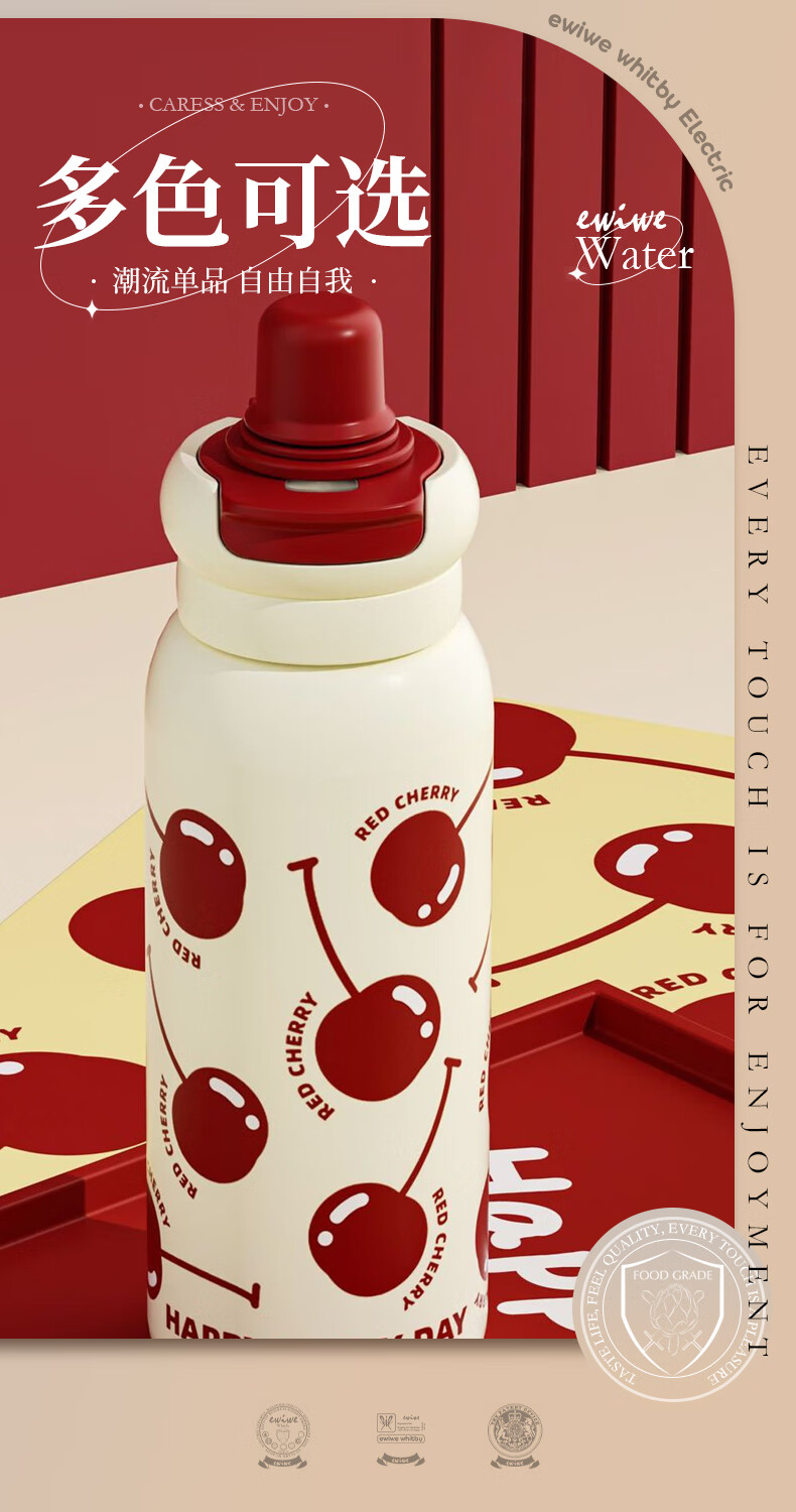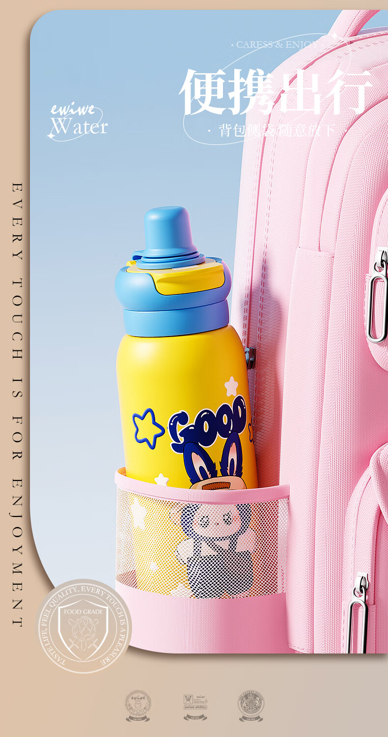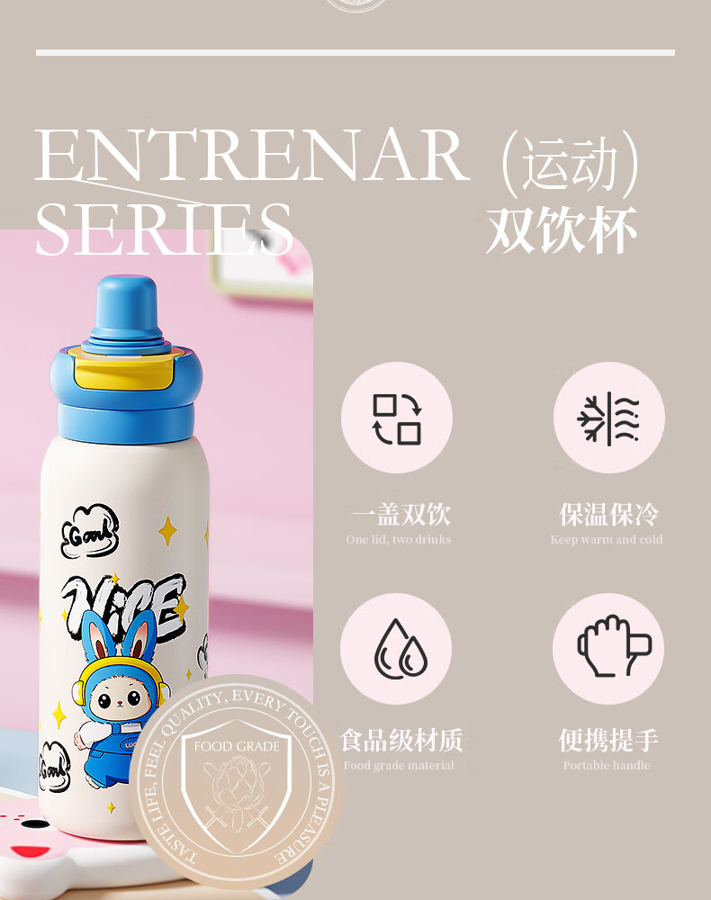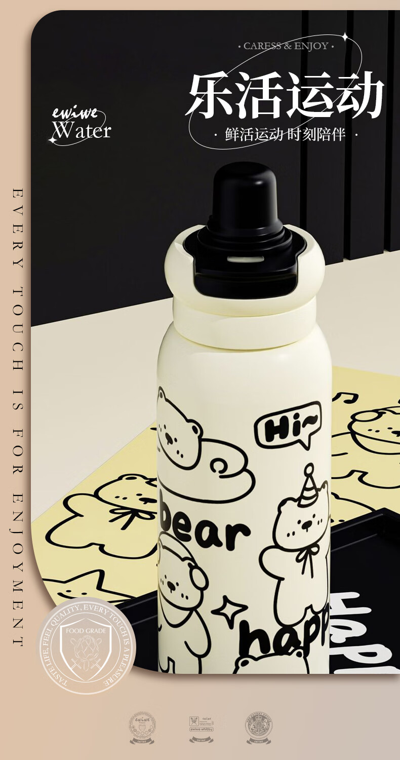 EWIWE保温杯女大容量316新款高颜值吸管杯子运动上学专用便携双饮水壶 粉色奶椰椰/食品级材质/双饮盖/620ml