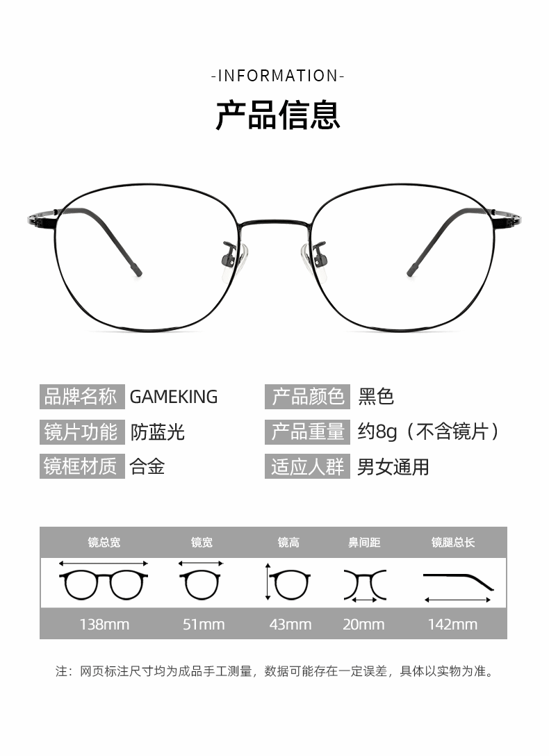 Gameking防蓝光眼镜男女防辐射眼镜无度数眼睛框手机电脑游戏平光镜GK8028