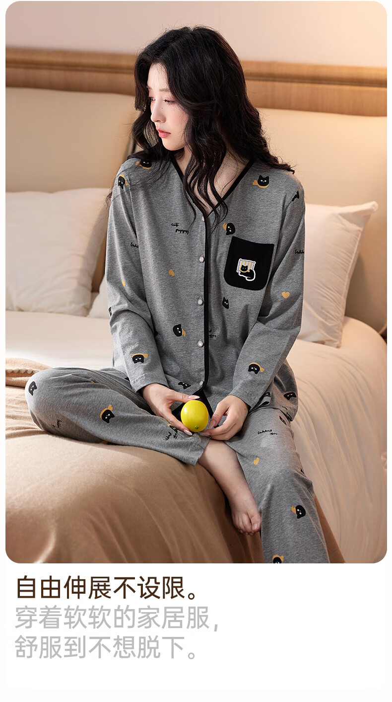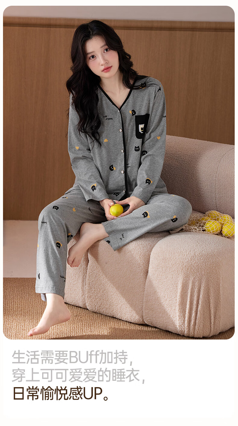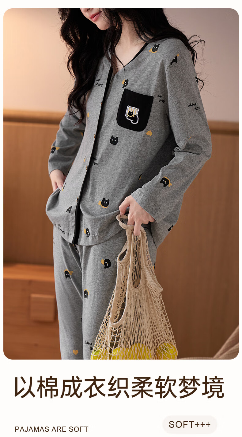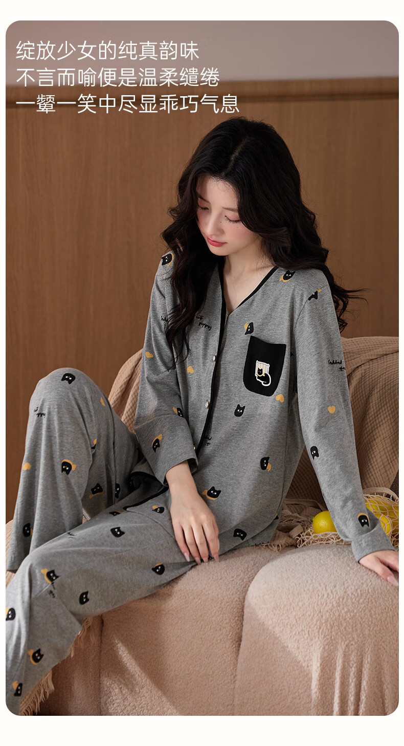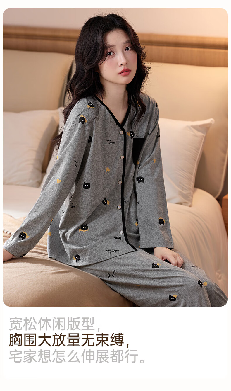 玛伦萨纯棉睡衣女春秋季2025新款可外穿长袖长裤V领开衫女士全棉家居服 花灰 M