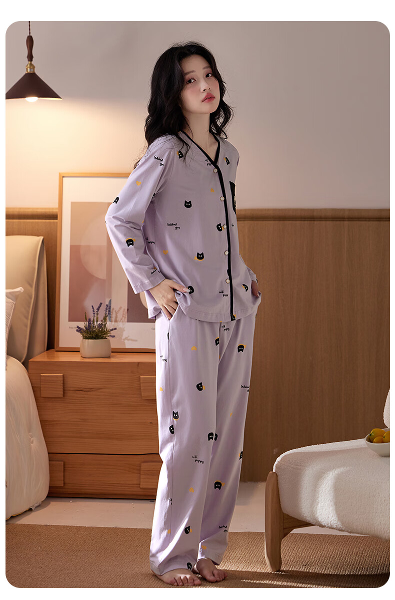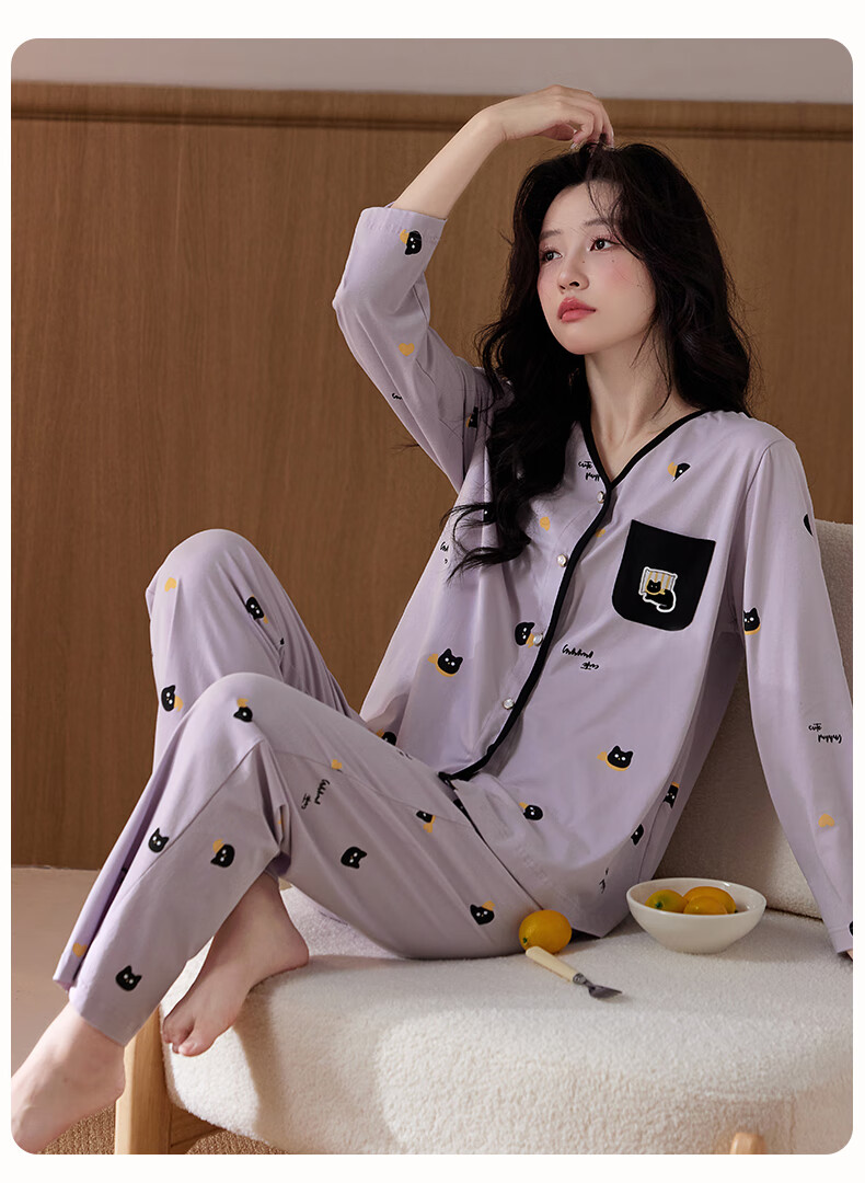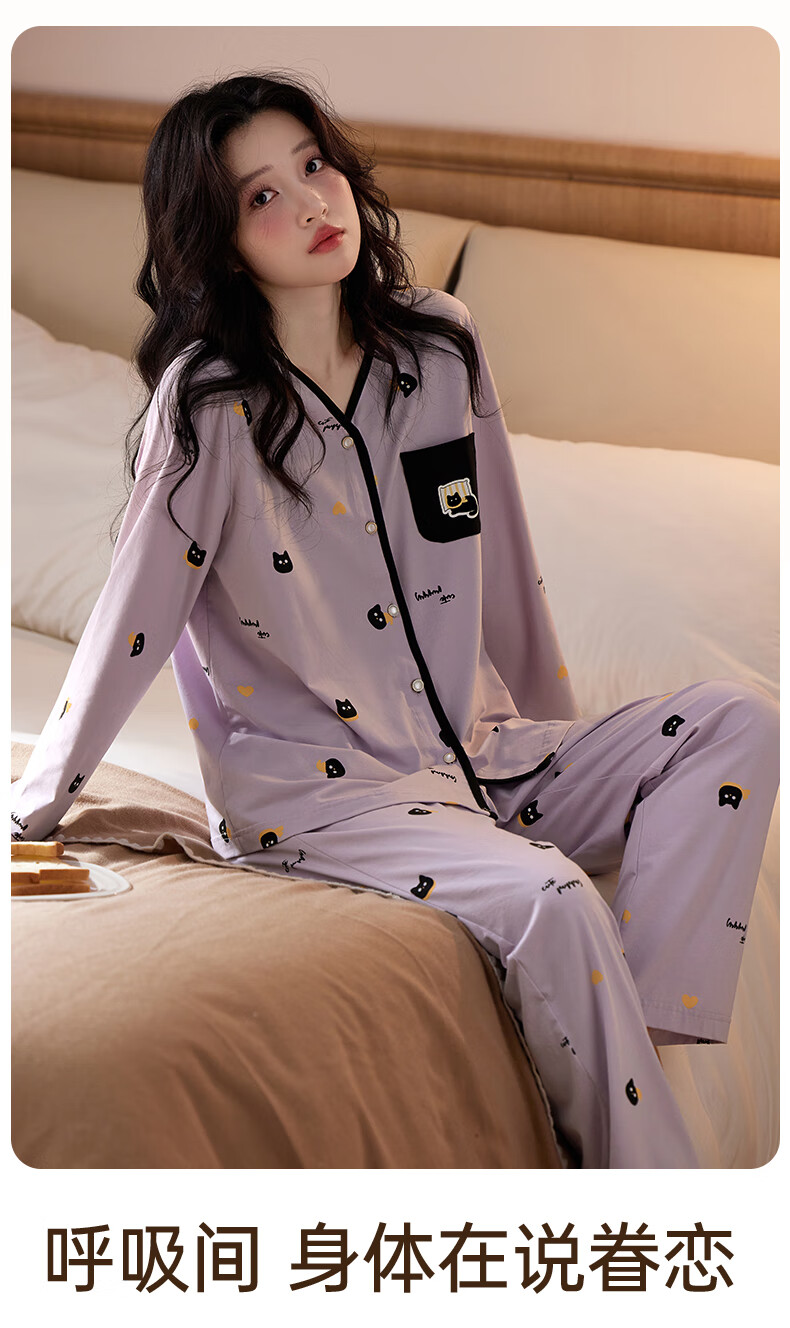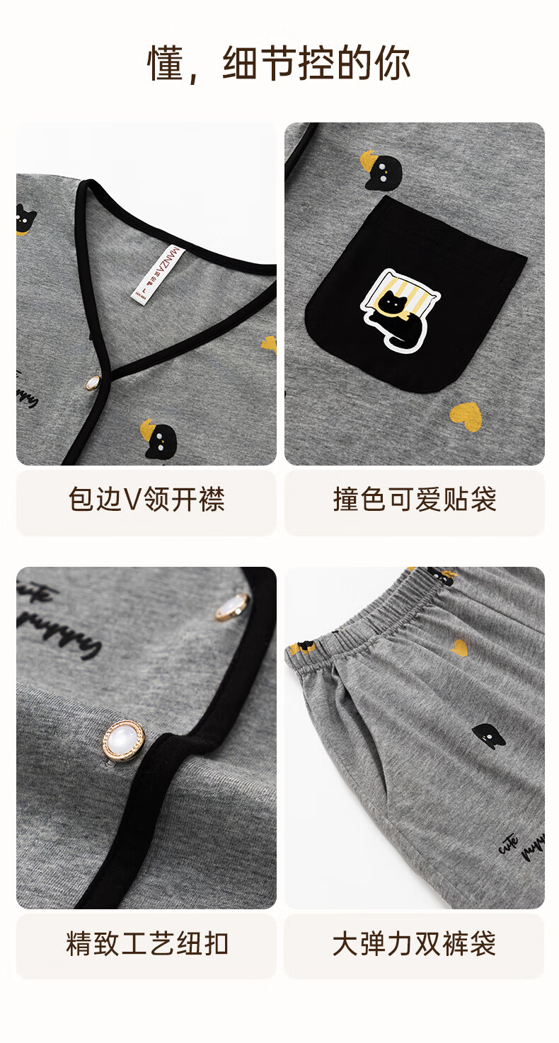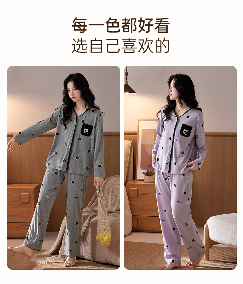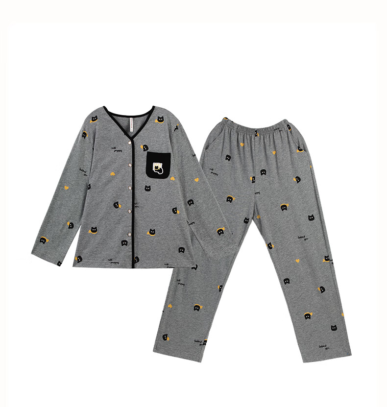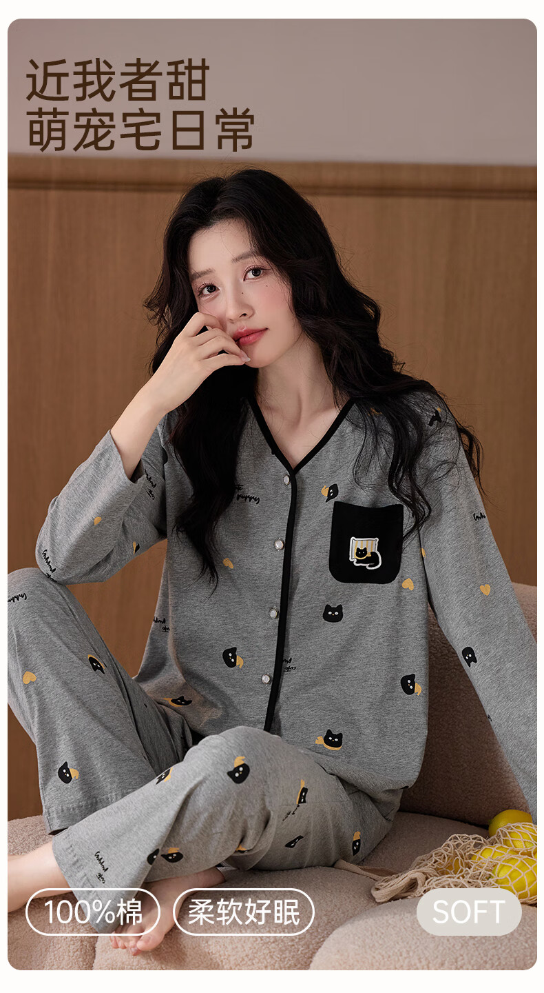 玛伦萨纯棉睡衣女春秋季2025新款可外穿长袖长裤V领开衫女士全棉家居服 花灰 M