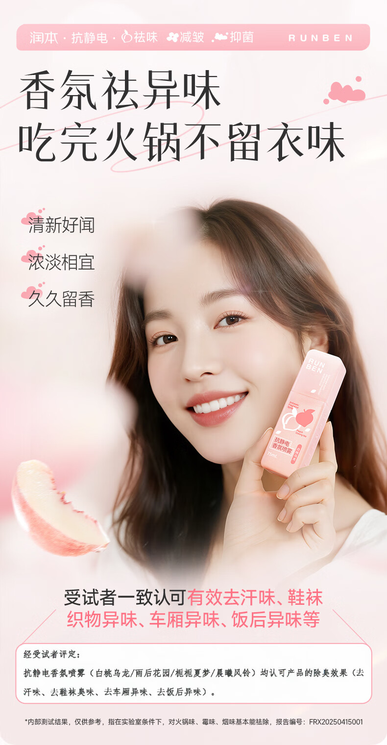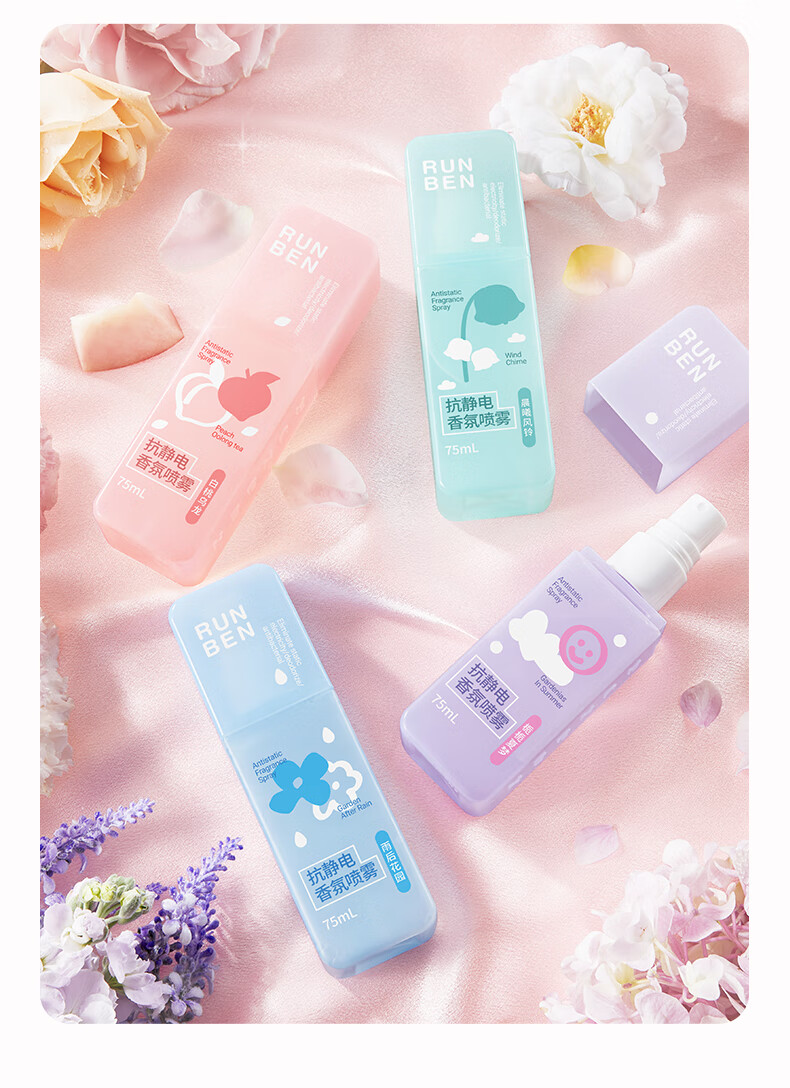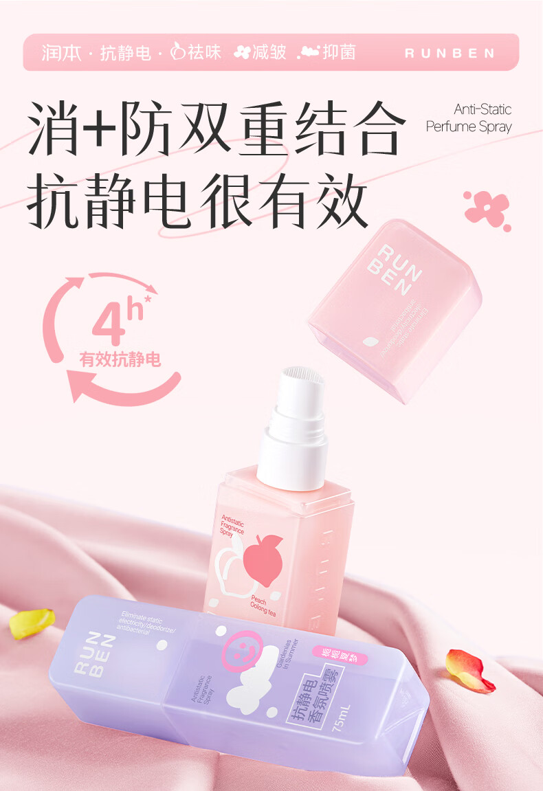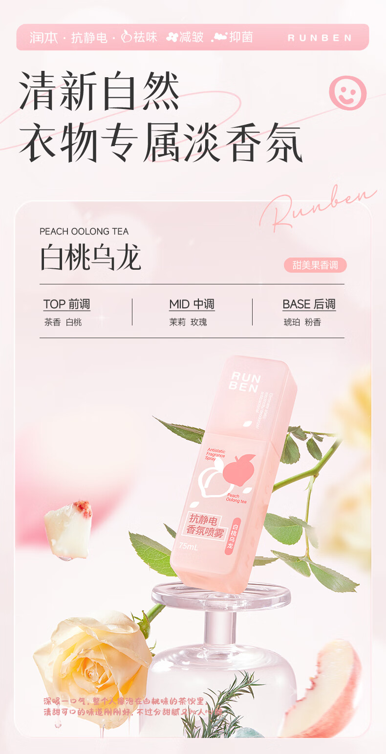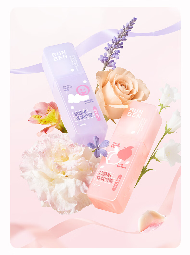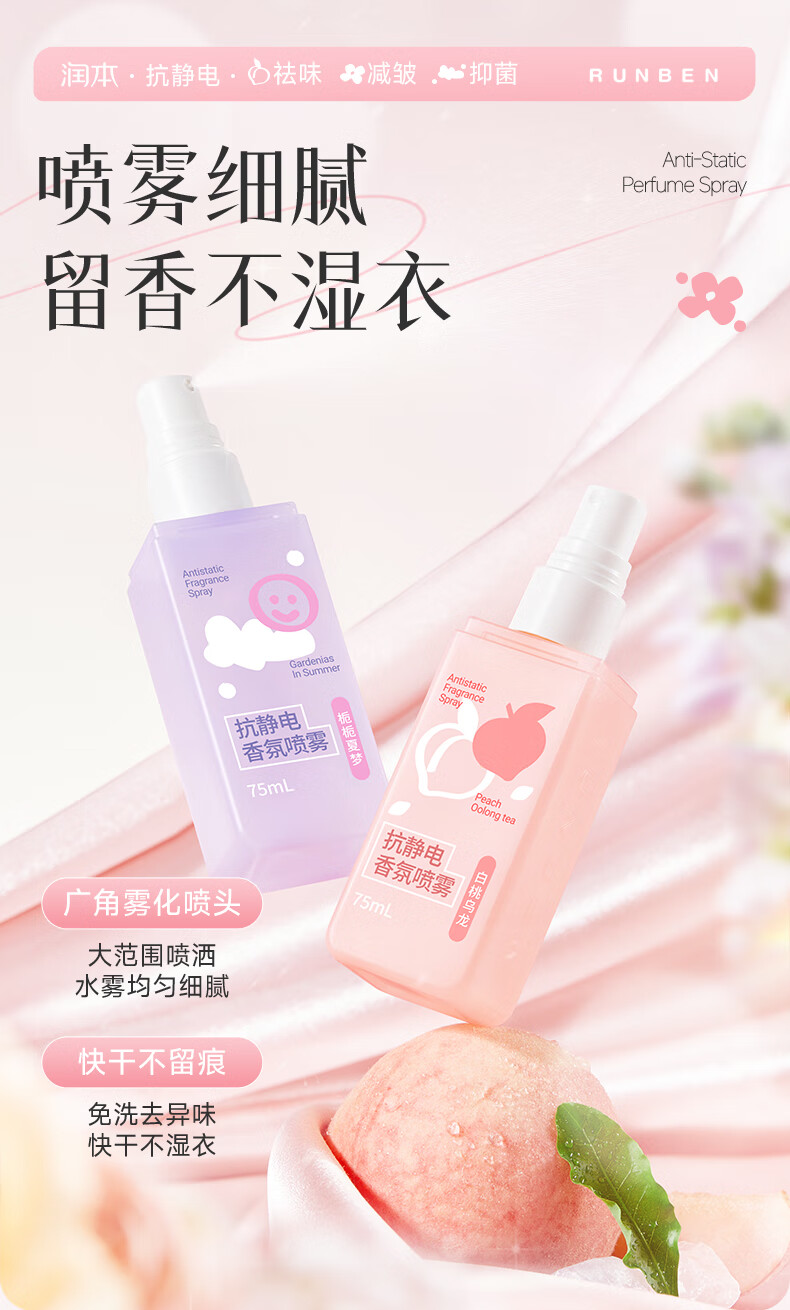 润本(RUNBEN)防静电喷雾毛衣物除静电衣服除菌祛味除皱柔顺剂香氛便携静电喷雾 【晨曦+白桃】 75ml*2瓶