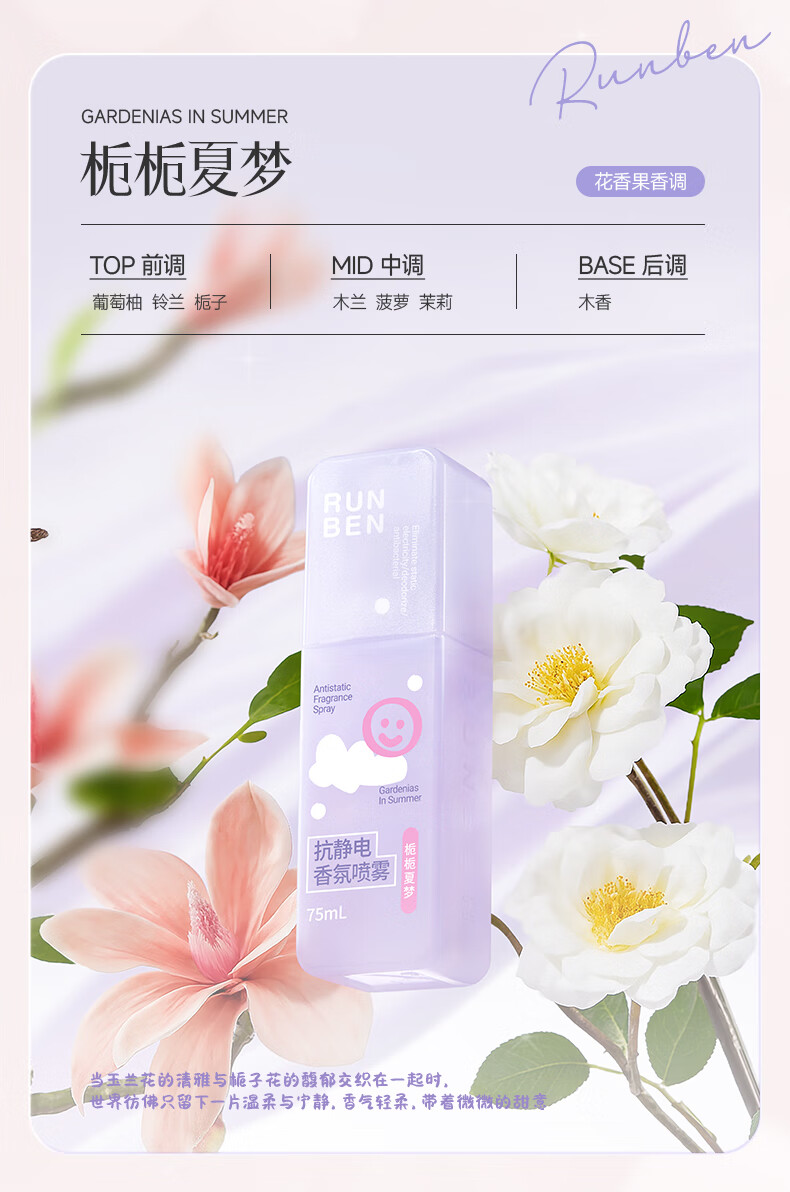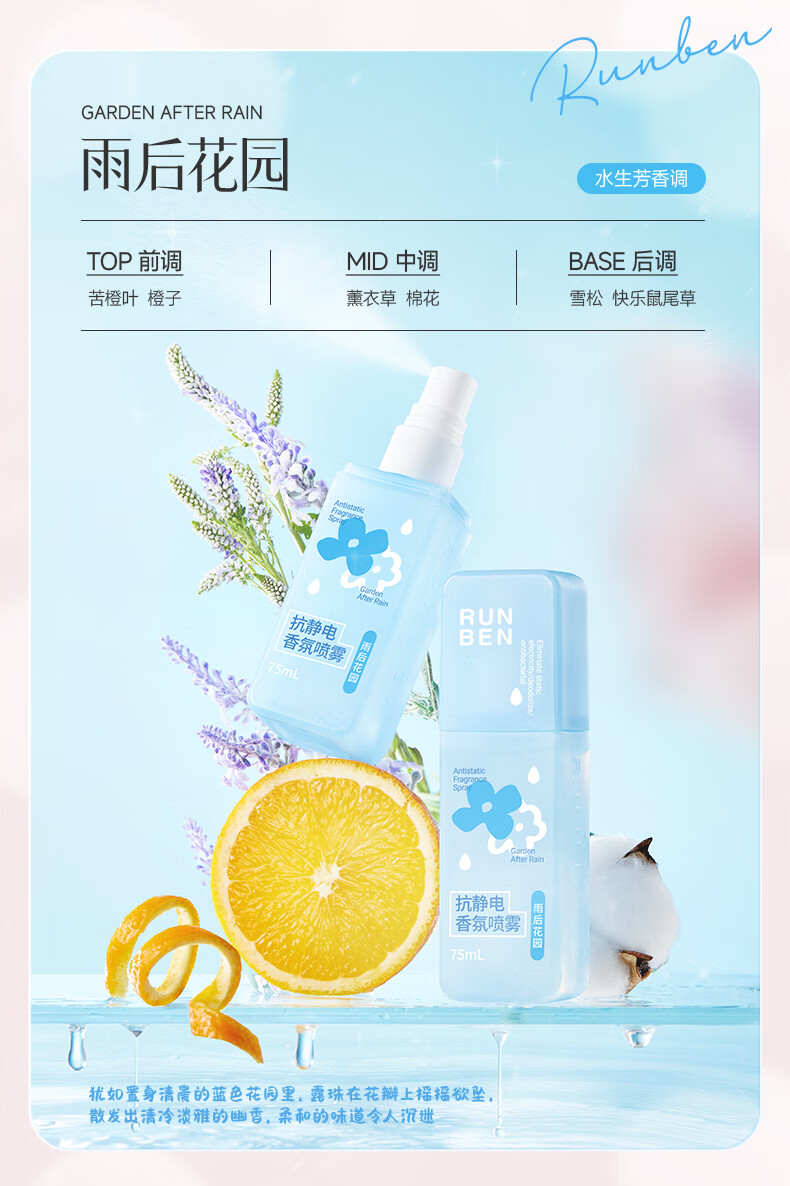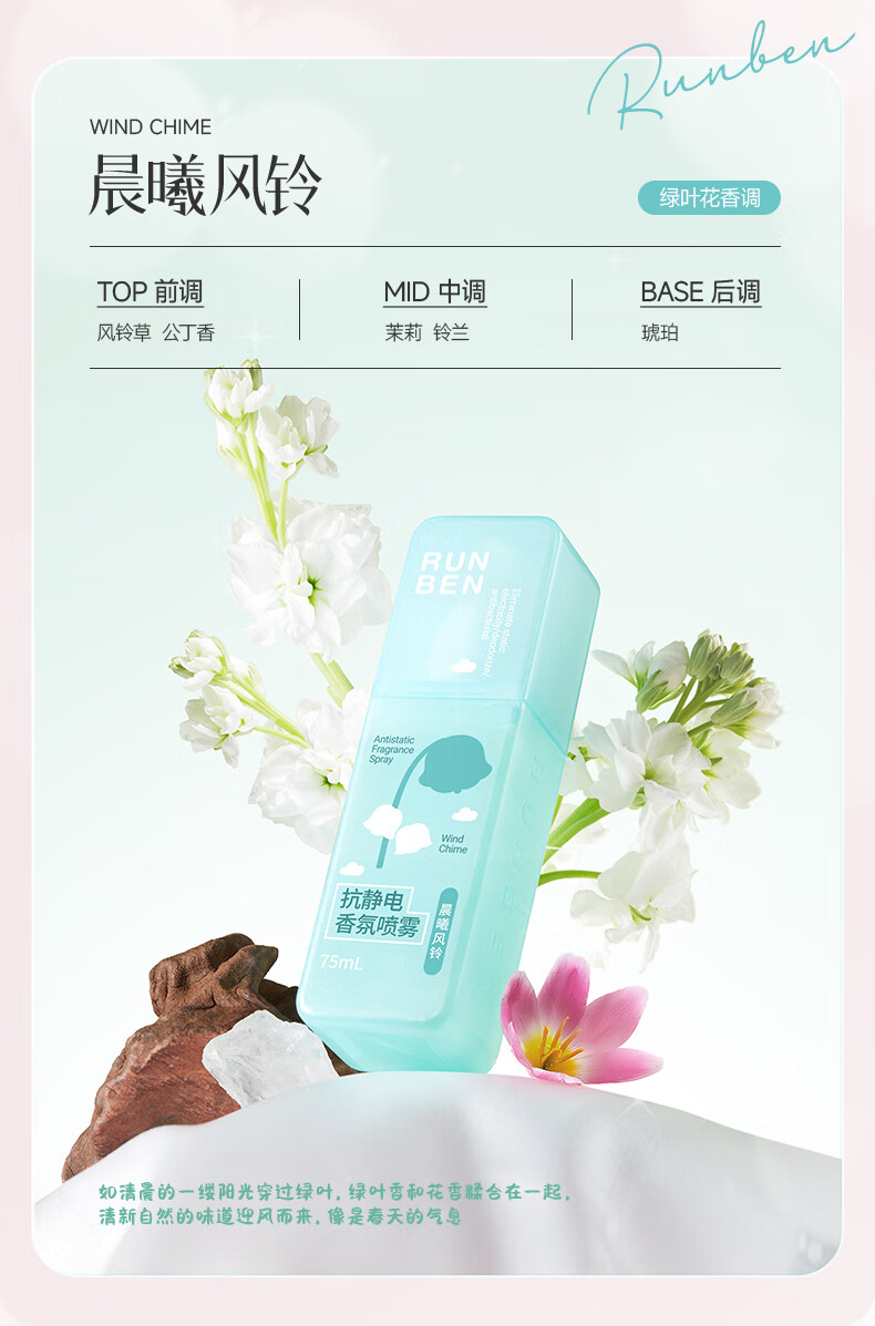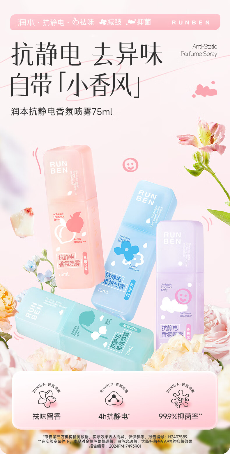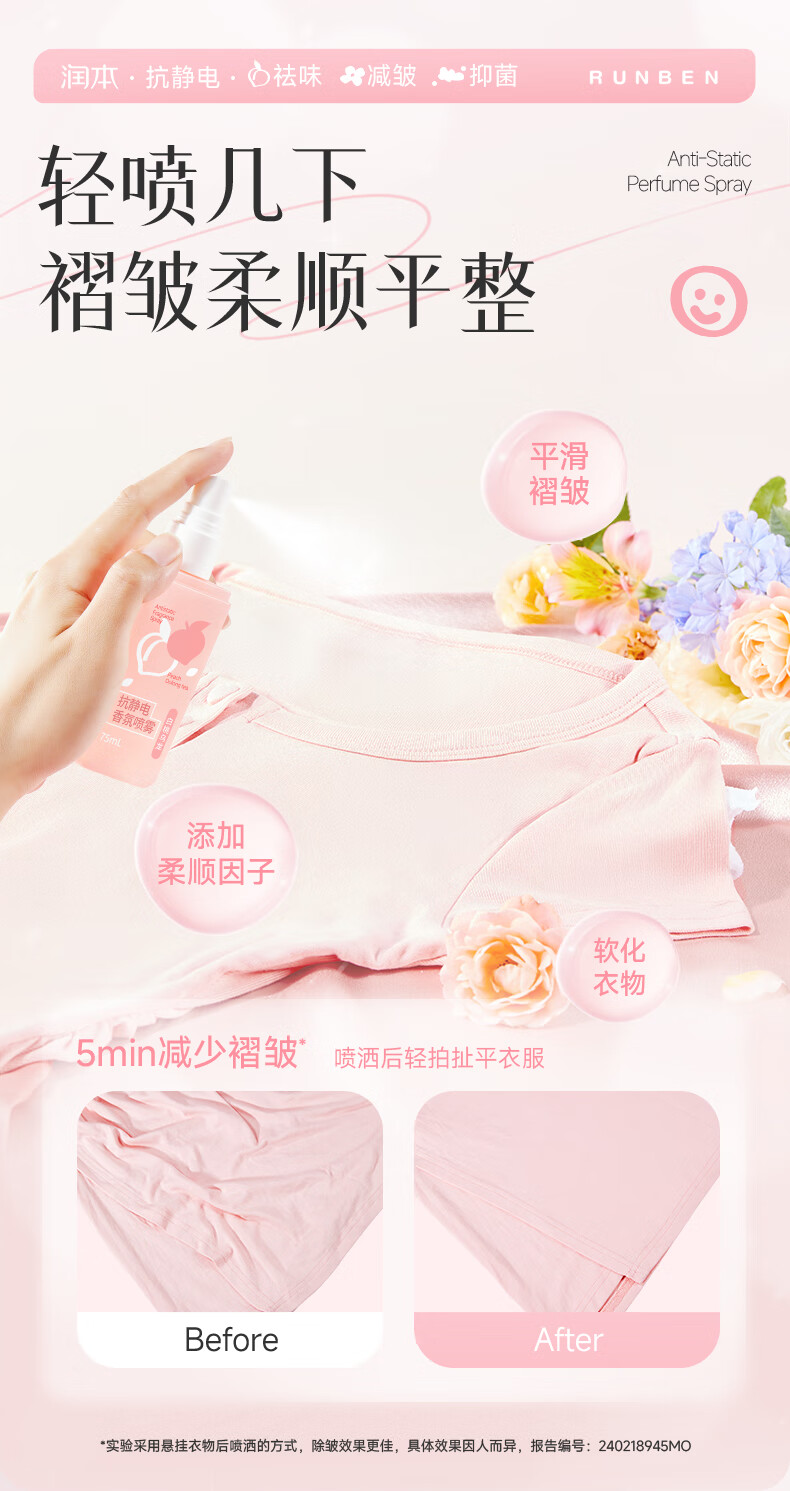 润本(RUNBEN)防静电喷雾毛衣物除静电衣服除菌祛味除皱柔顺剂香氛便携静电喷雾 【晨曦+白桃】 75ml*2瓶