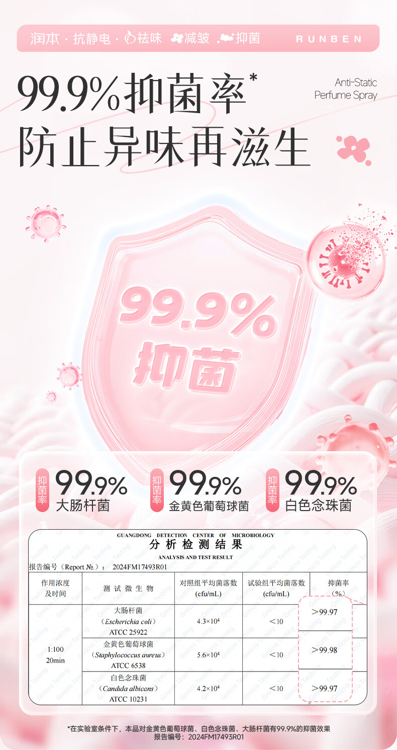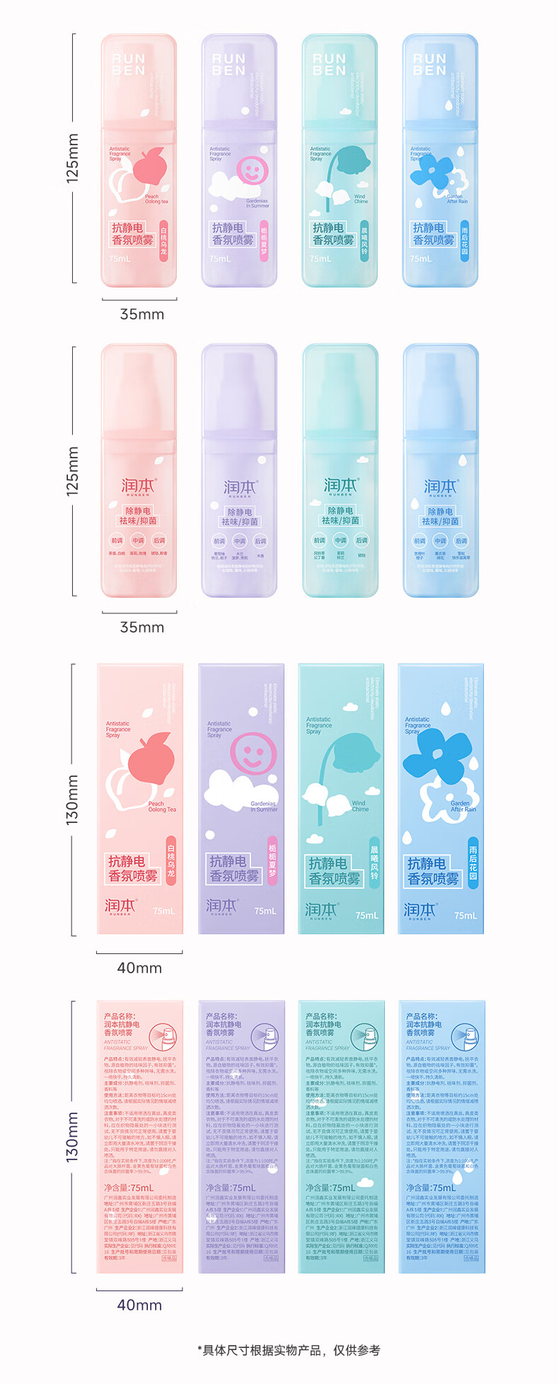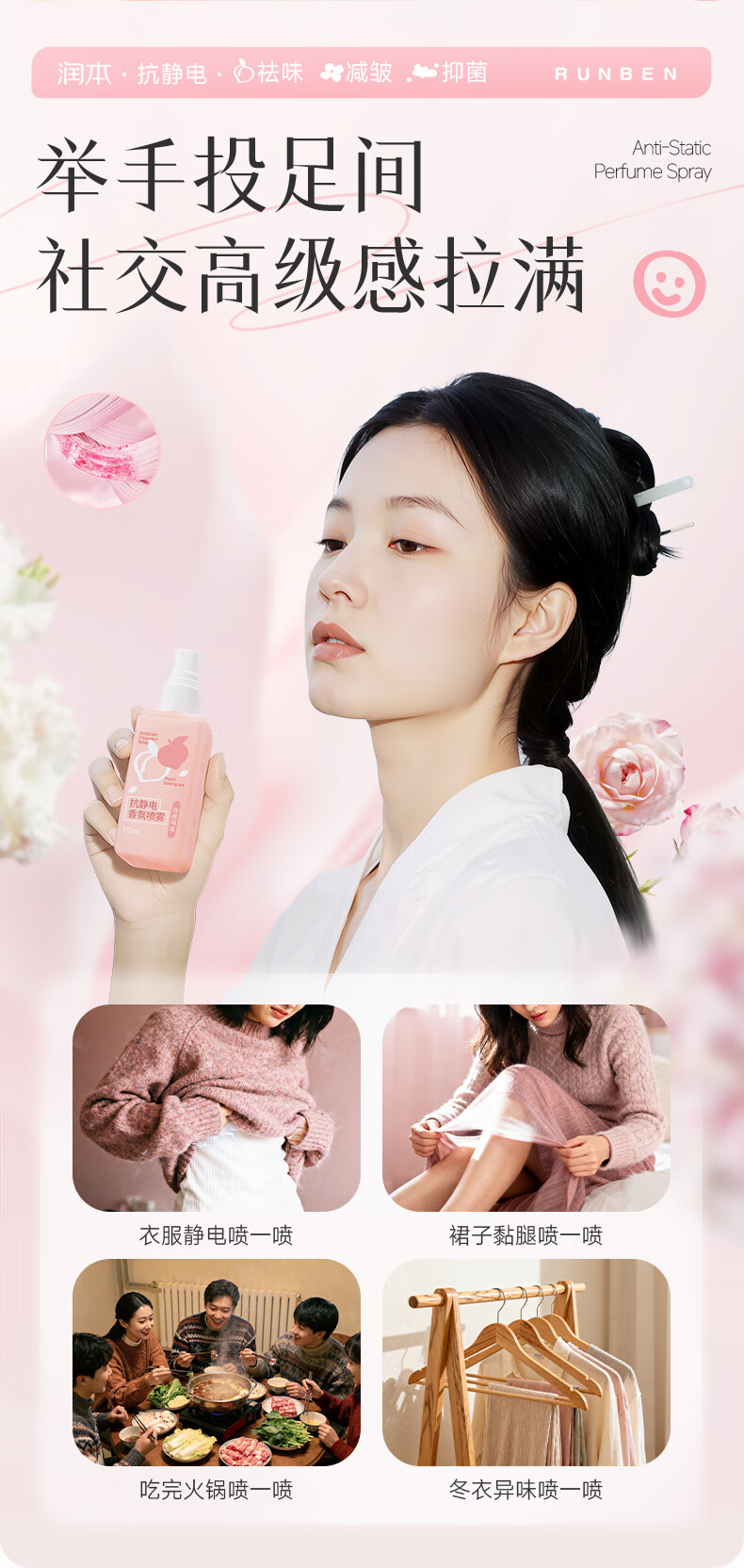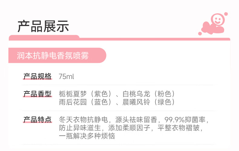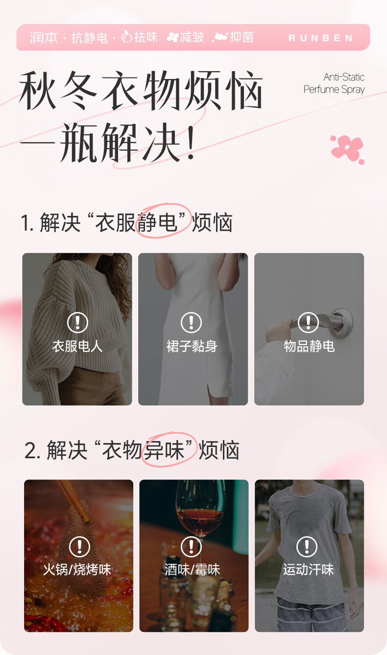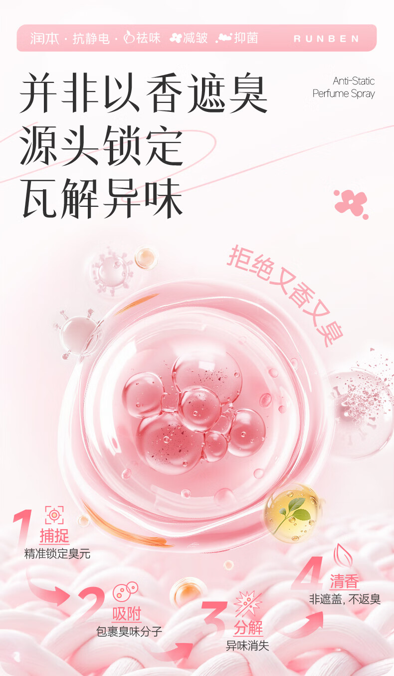 润本(RUNBEN)防静电喷雾毛衣物除静电衣服除菌祛味除皱柔顺剂香氛便携静电喷雾 【晨曦+白桃】 75ml*2瓶