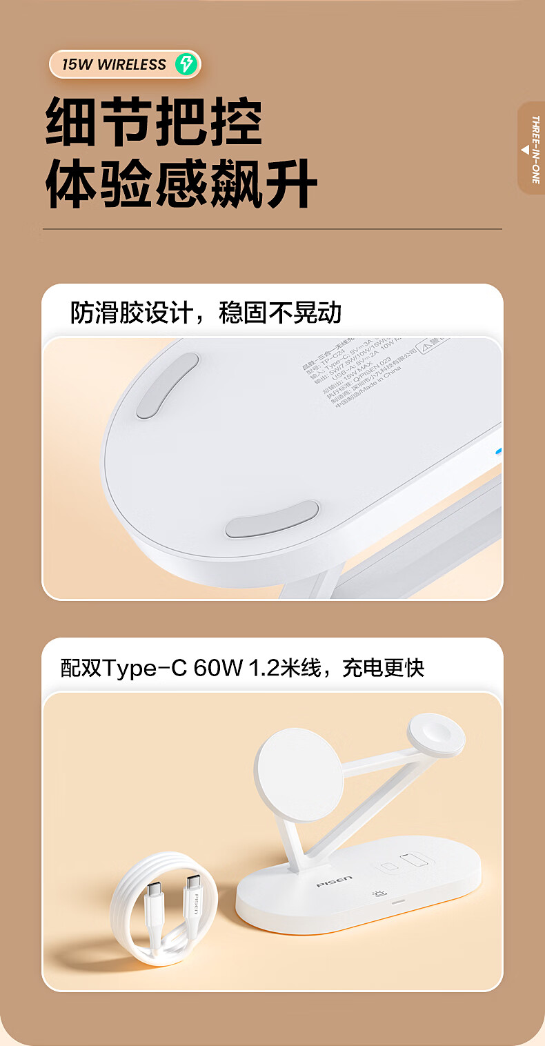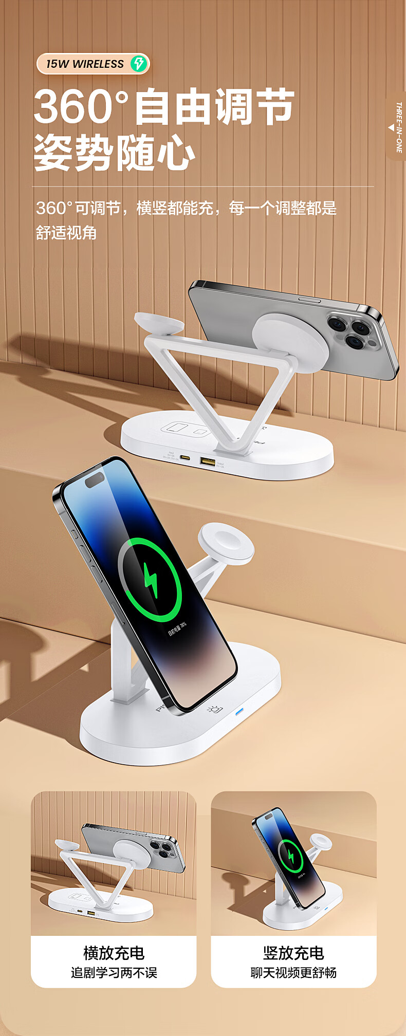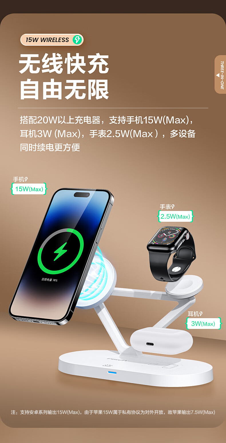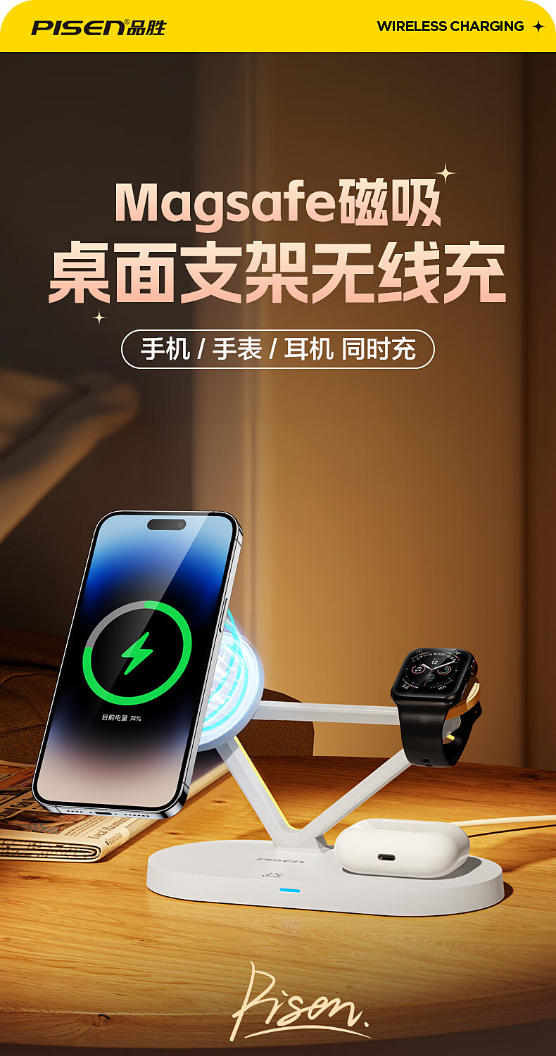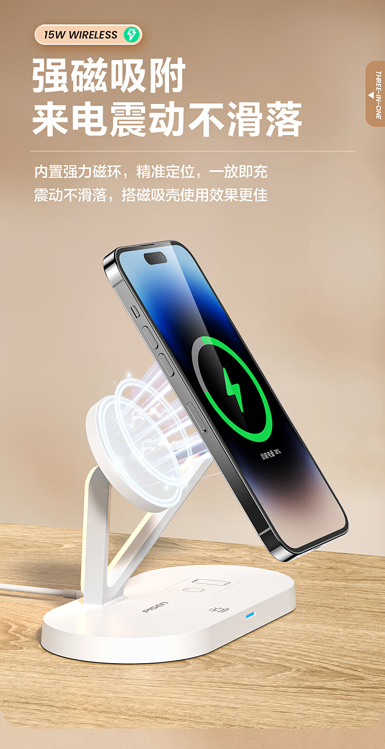 品胜苹果无线充电器三合一MagSafe磁吸15W适用iPhone17air/16华为小米手机苹果手表AirPods Pro3耳机