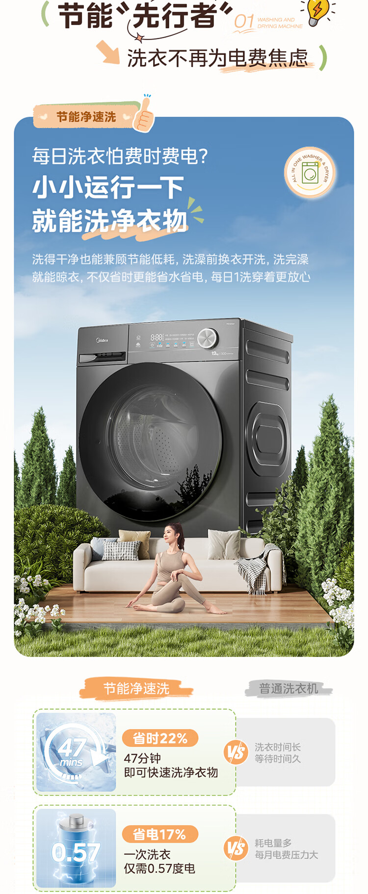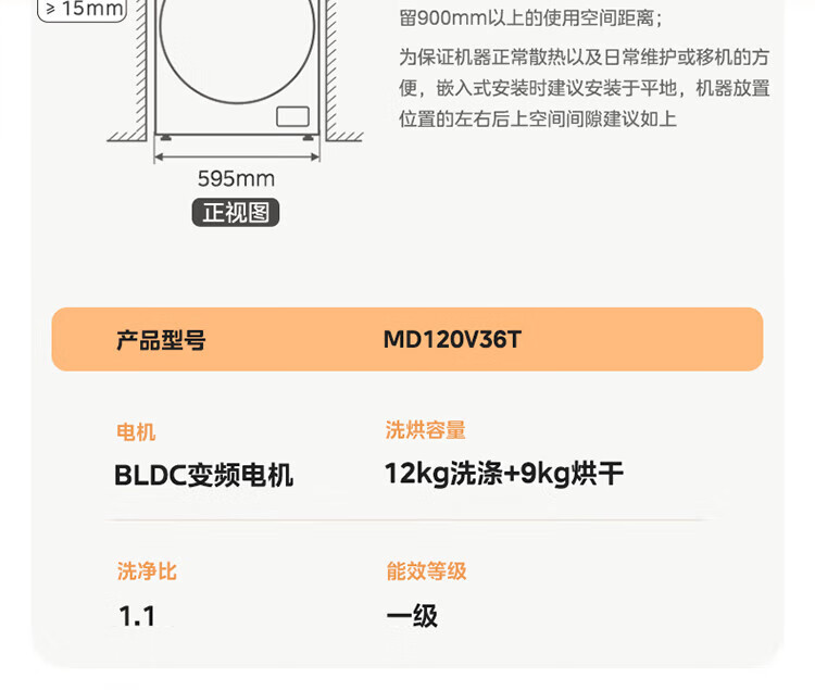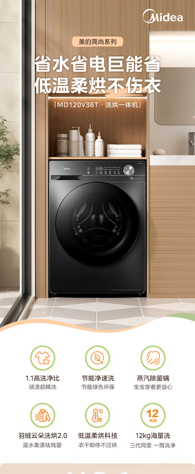 美的(Midea)滚筒洗衣机全自动家用 1.1洗净比MD120V36T 12公斤洗烘一体机 节能净速 以旧换新 家电国家补贴20%