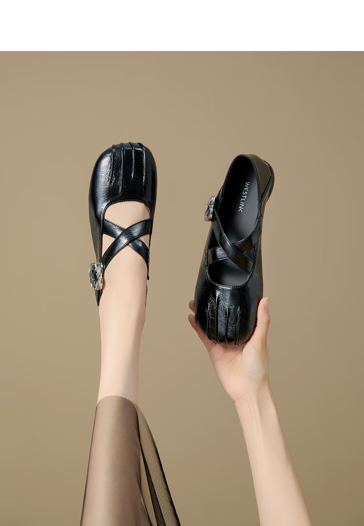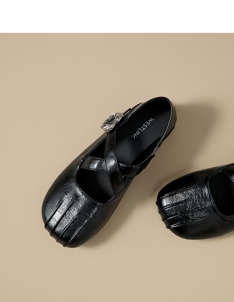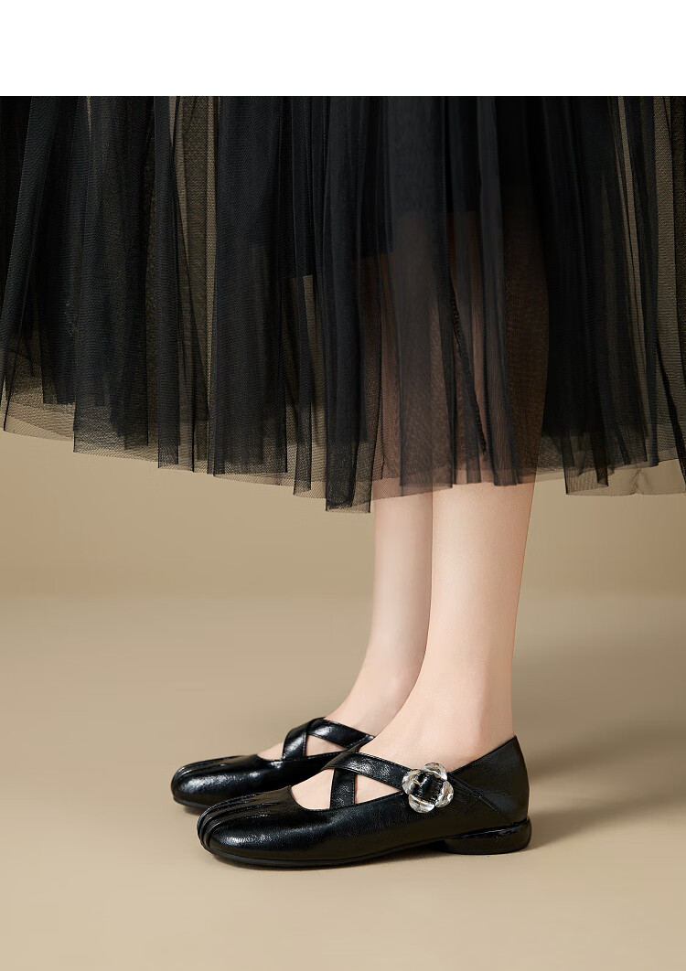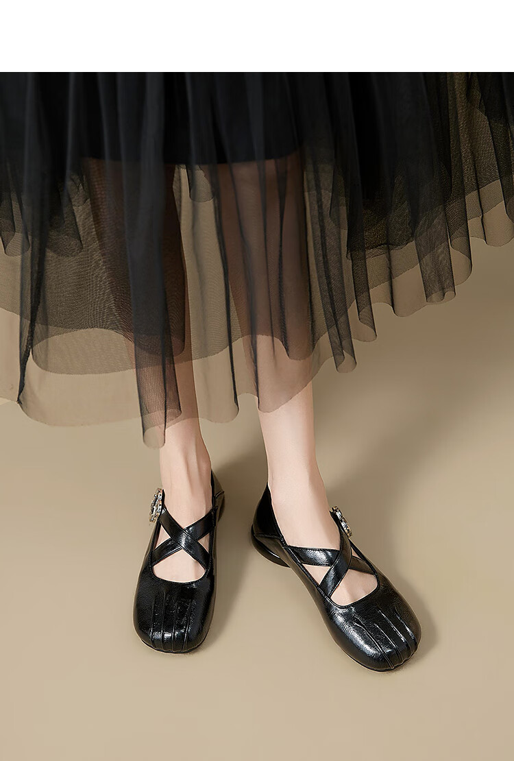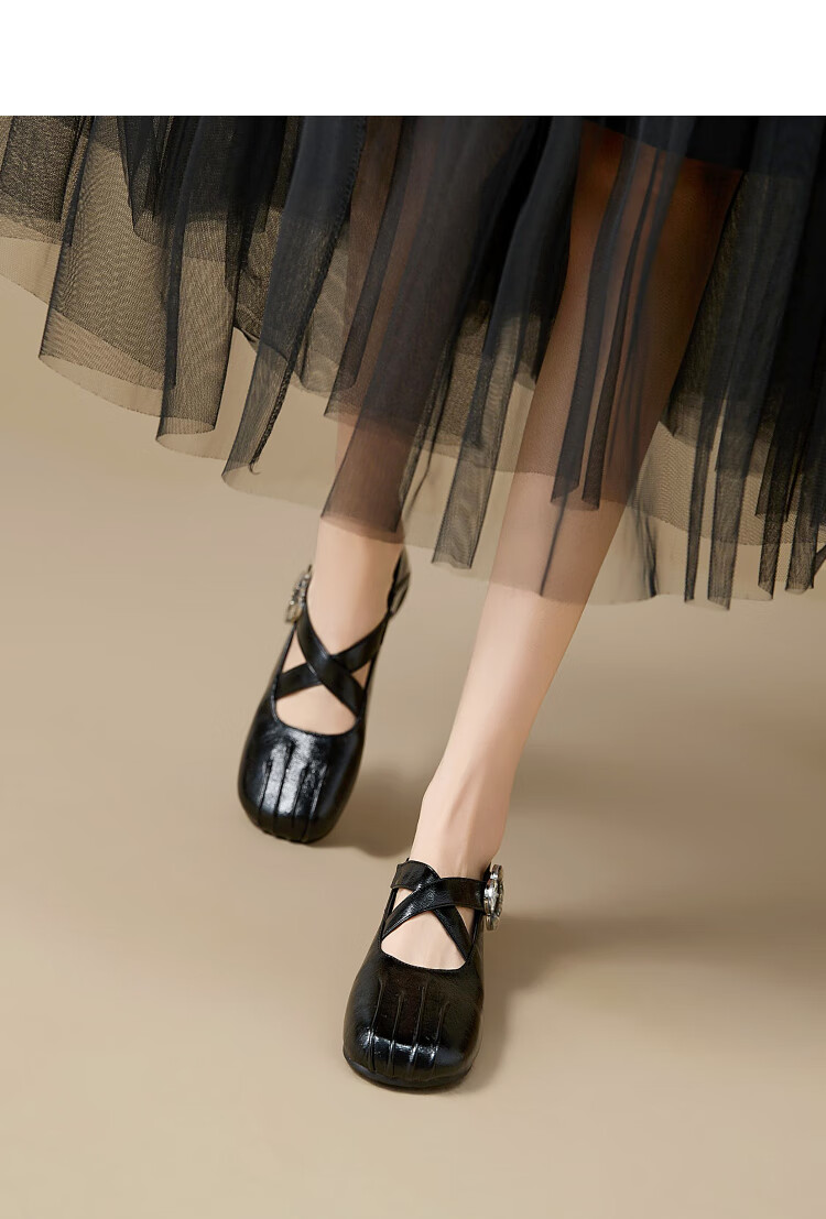 西遇平底玛丽珍鞋女2025新款秋季芭蕾风小皮鞋交叉带褶皱圆头单鞋 黑色 35 (225)