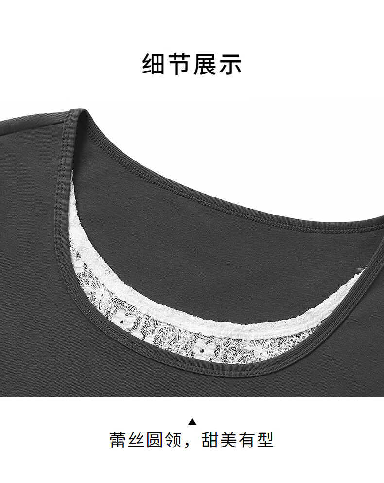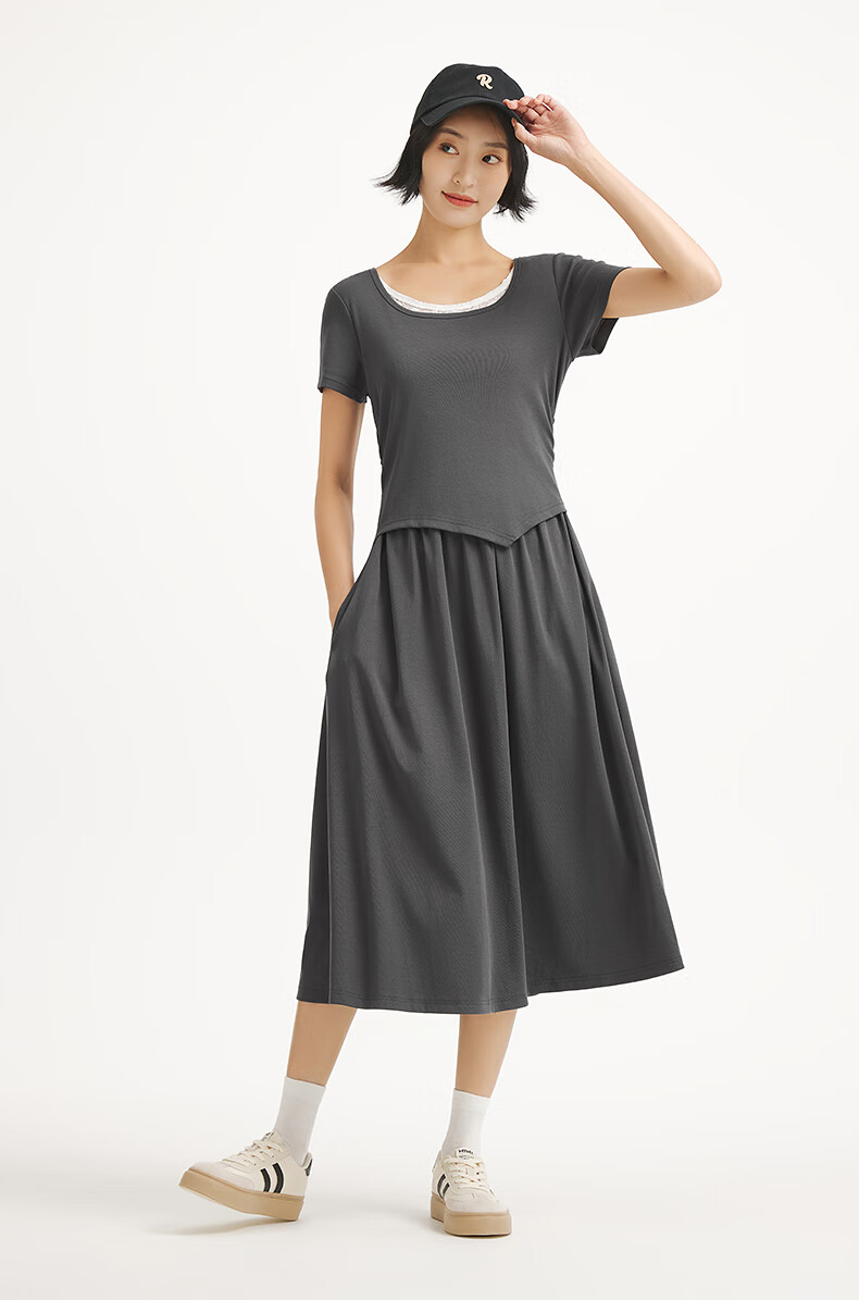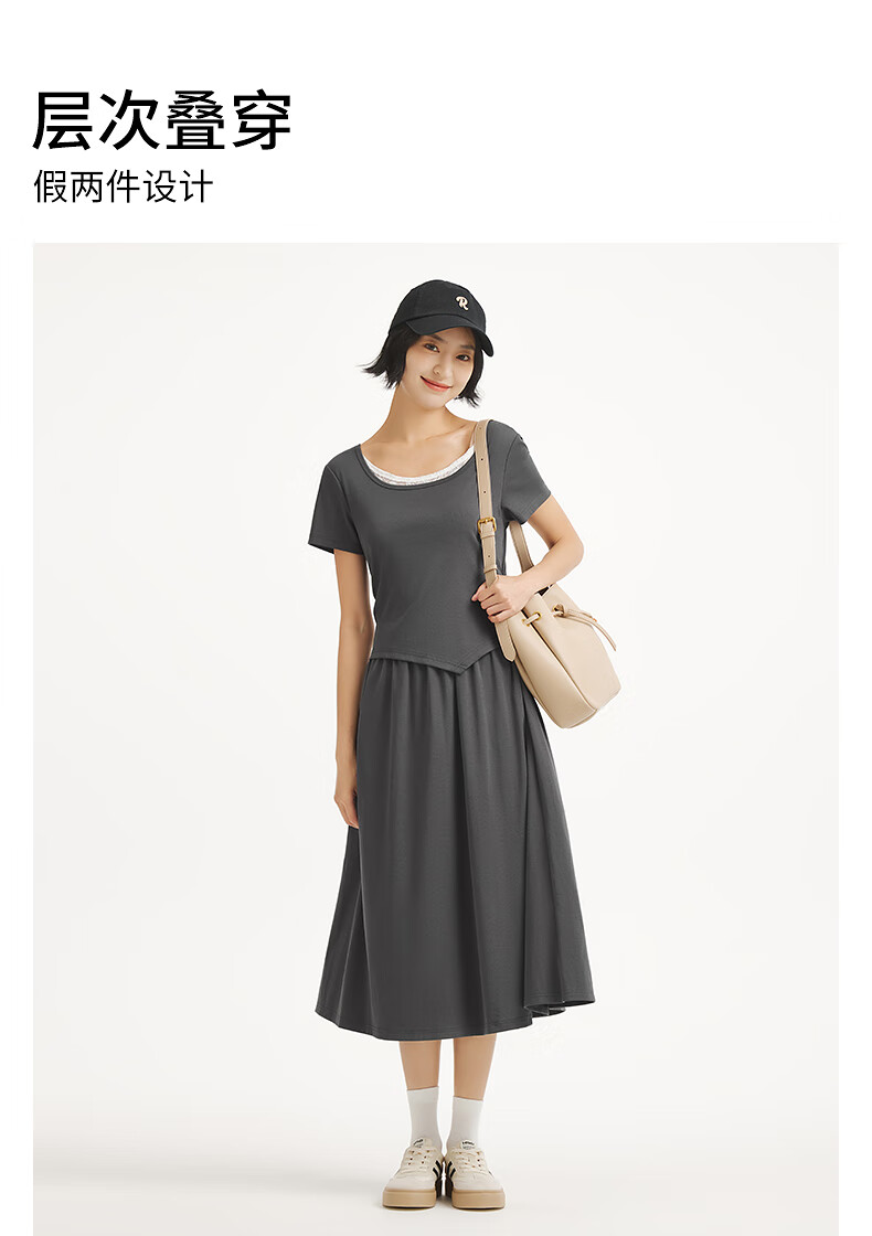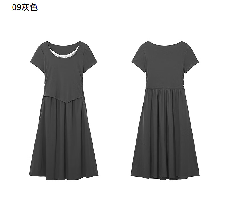 热风短袖连衣裙2025年秋季新款女士假两件蕾丝拼接圆领收腰显瘦连衣裙 09灰色 M