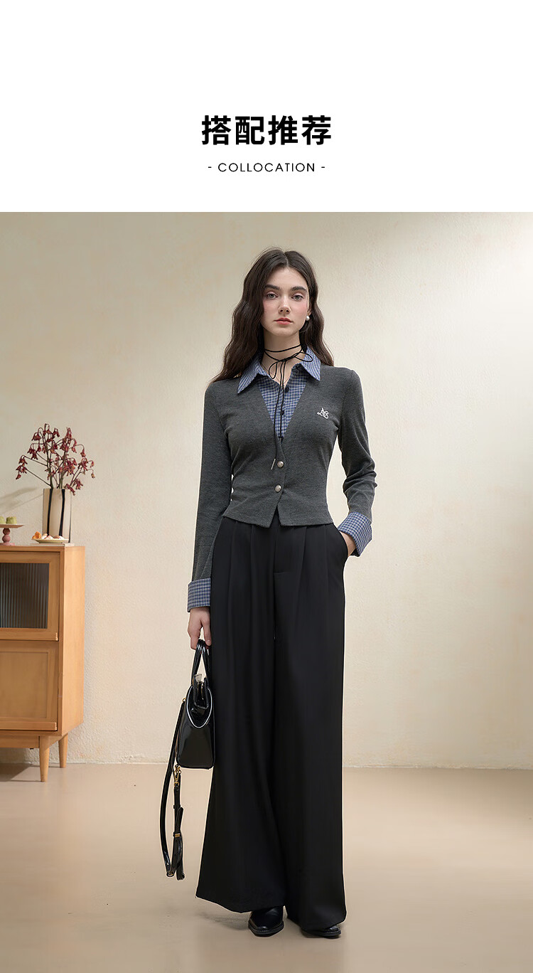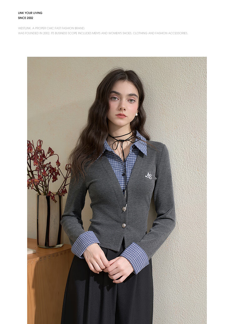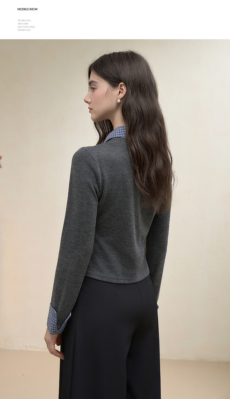 西遇学院假两件格纹拼接POLO领衬衫T恤女2025秋季百搭通勤针织衫 灰色 M/L/XL预售10月17日 M (160)