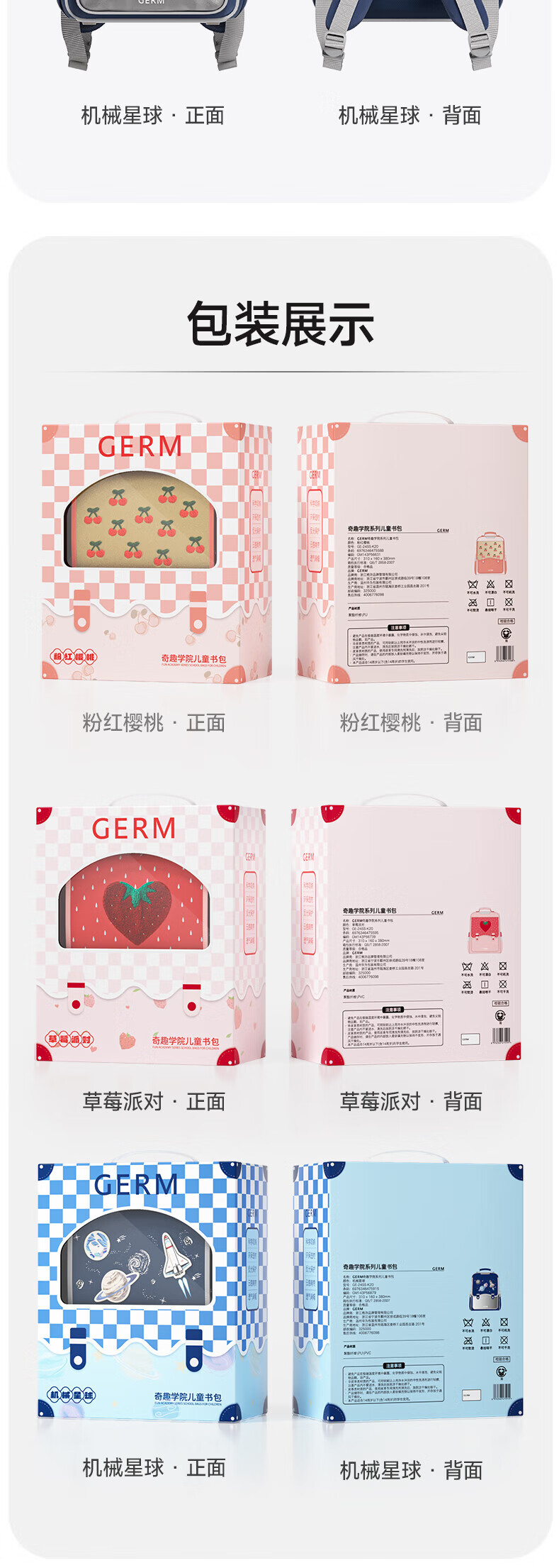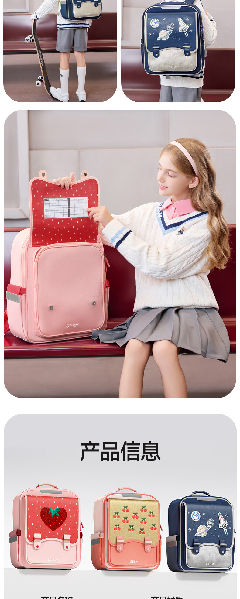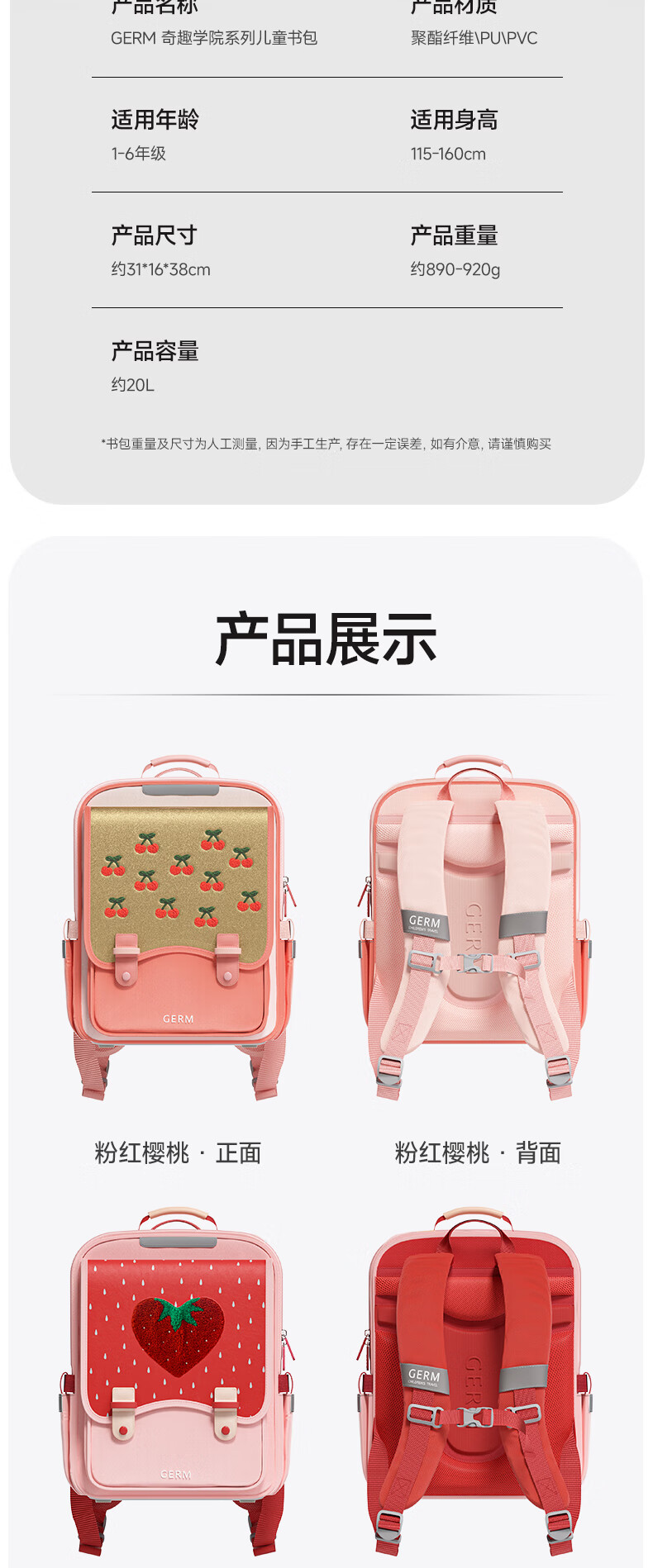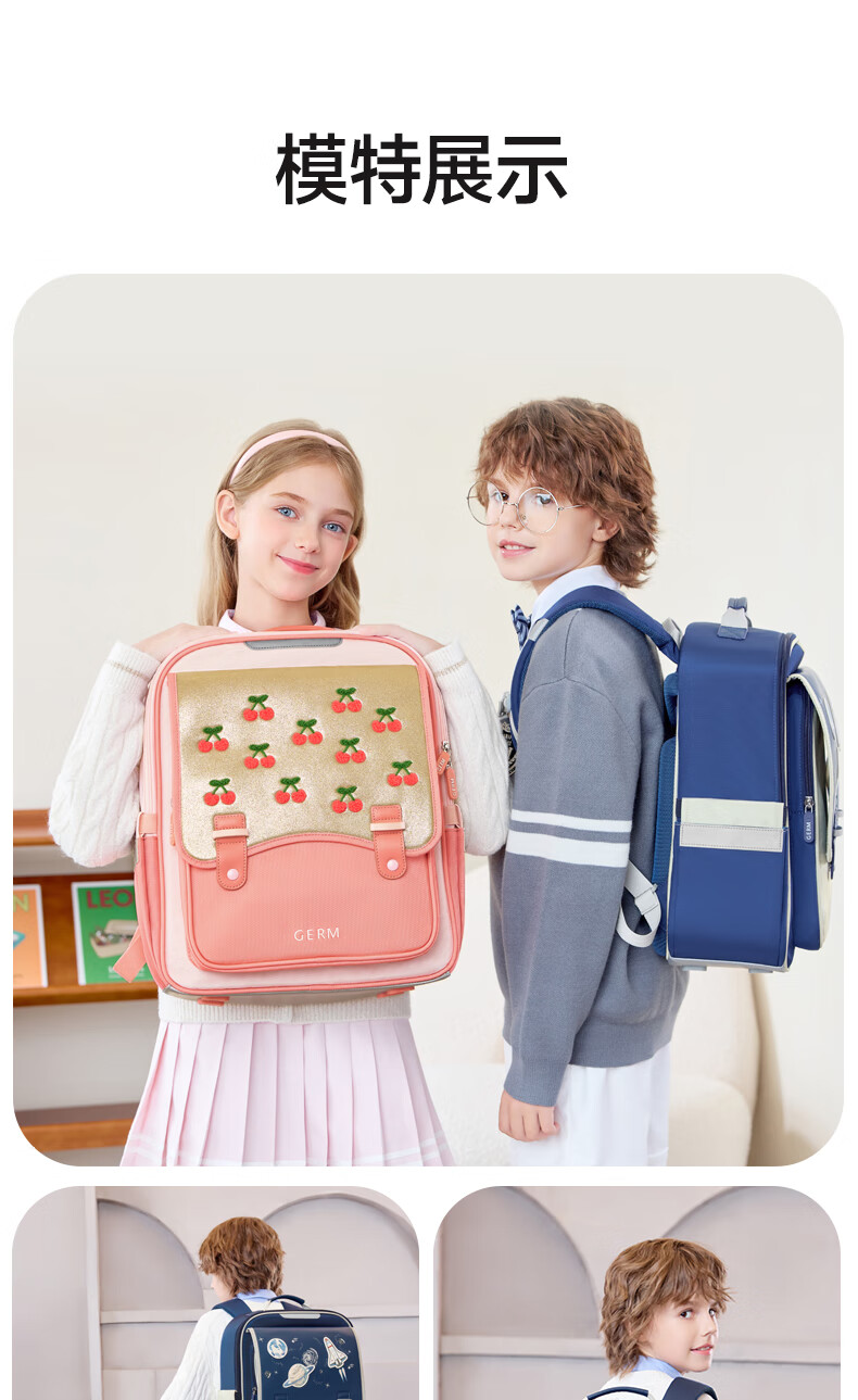 格米(germ)儿童书包小学生轻盈减压一到六年级女孩大容量书包 草莓派对