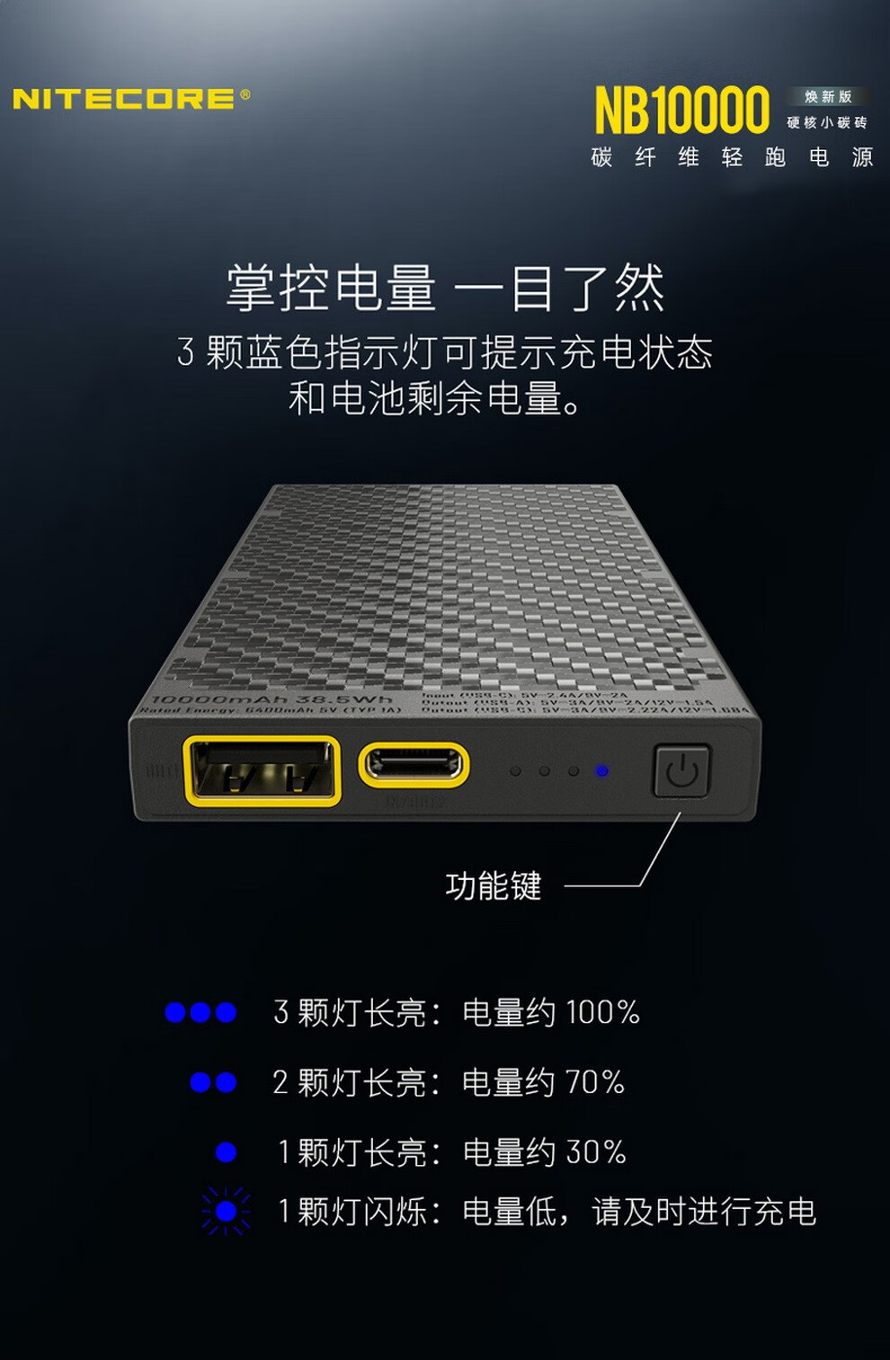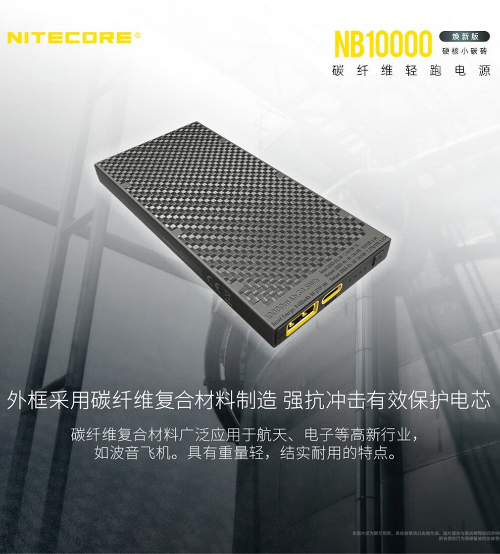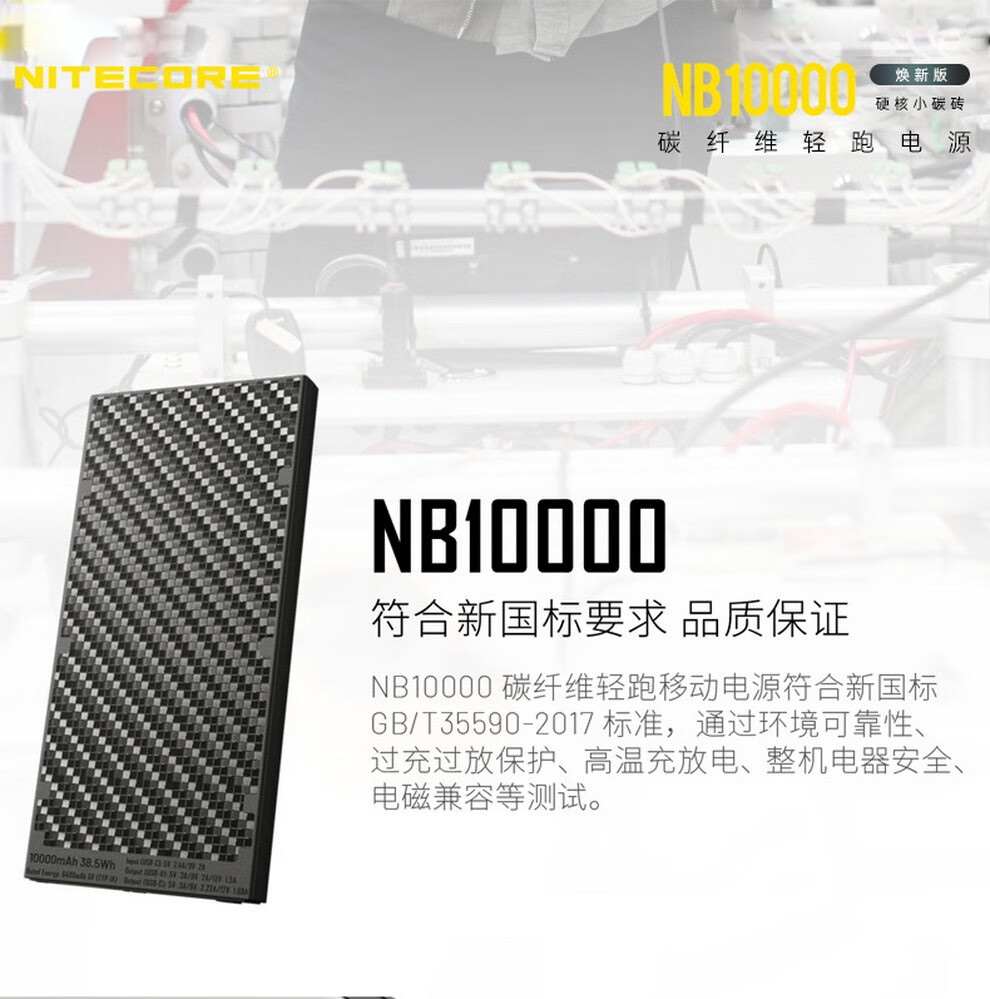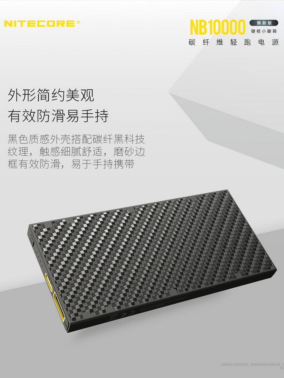 奈特科尔(NITECORE) 新3C认证NB10000 碳纤维户外轻跑18W快充移动电源轻薄便携充电宝 NB10000 焕新版轻跑充电宝