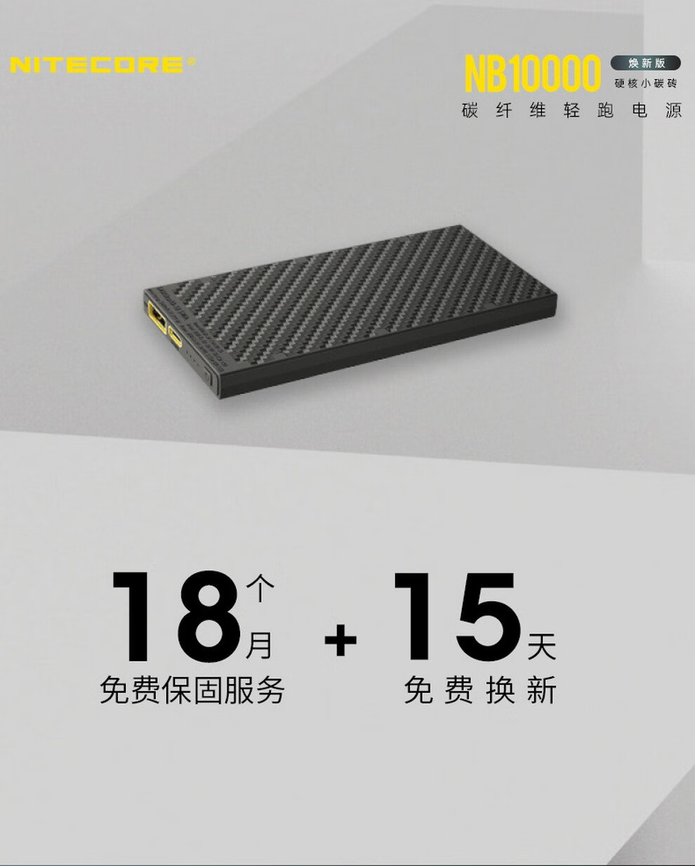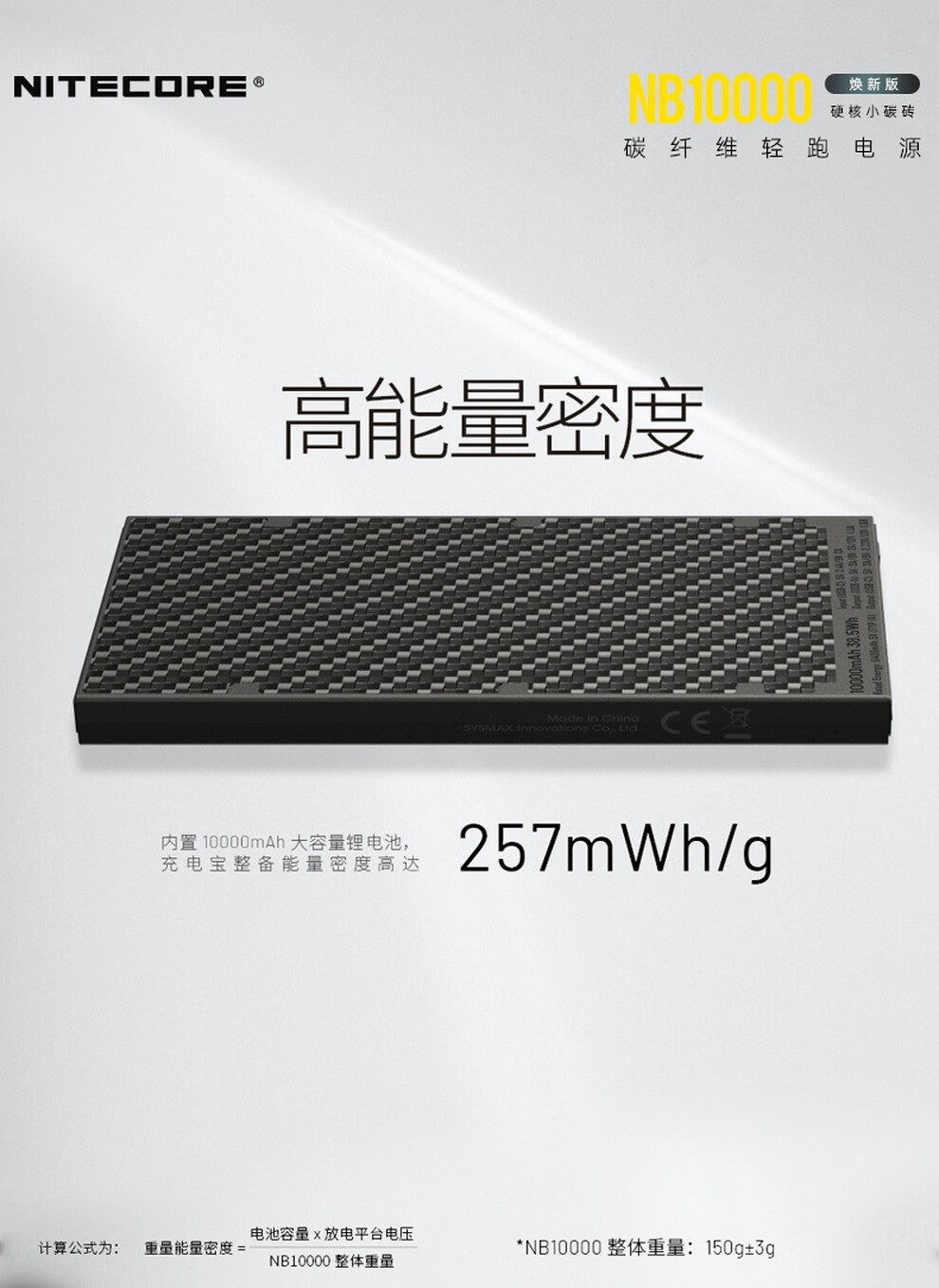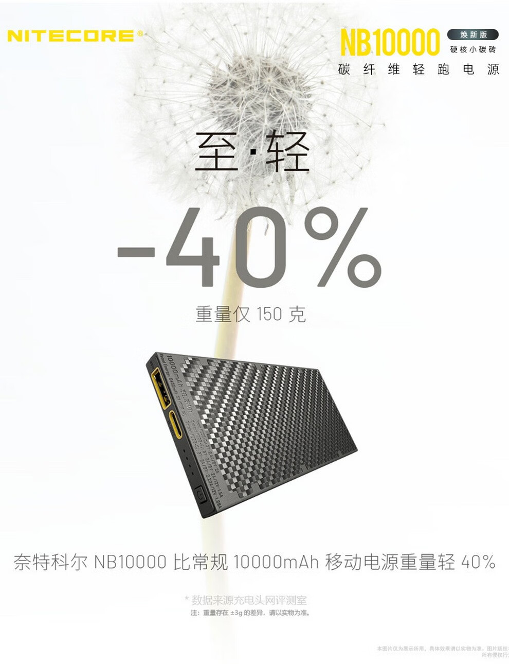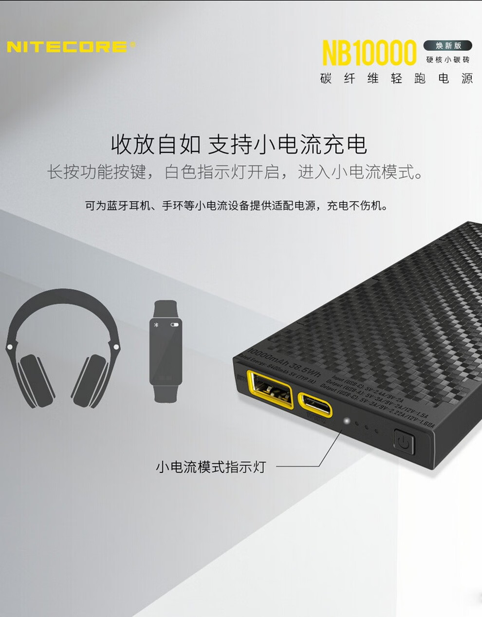 奈特科尔(NITECORE) 新3C认证NB10000 碳纤维户外轻跑18W快充移动电源轻薄便携充电宝 NB10000 焕新版轻跑充电宝