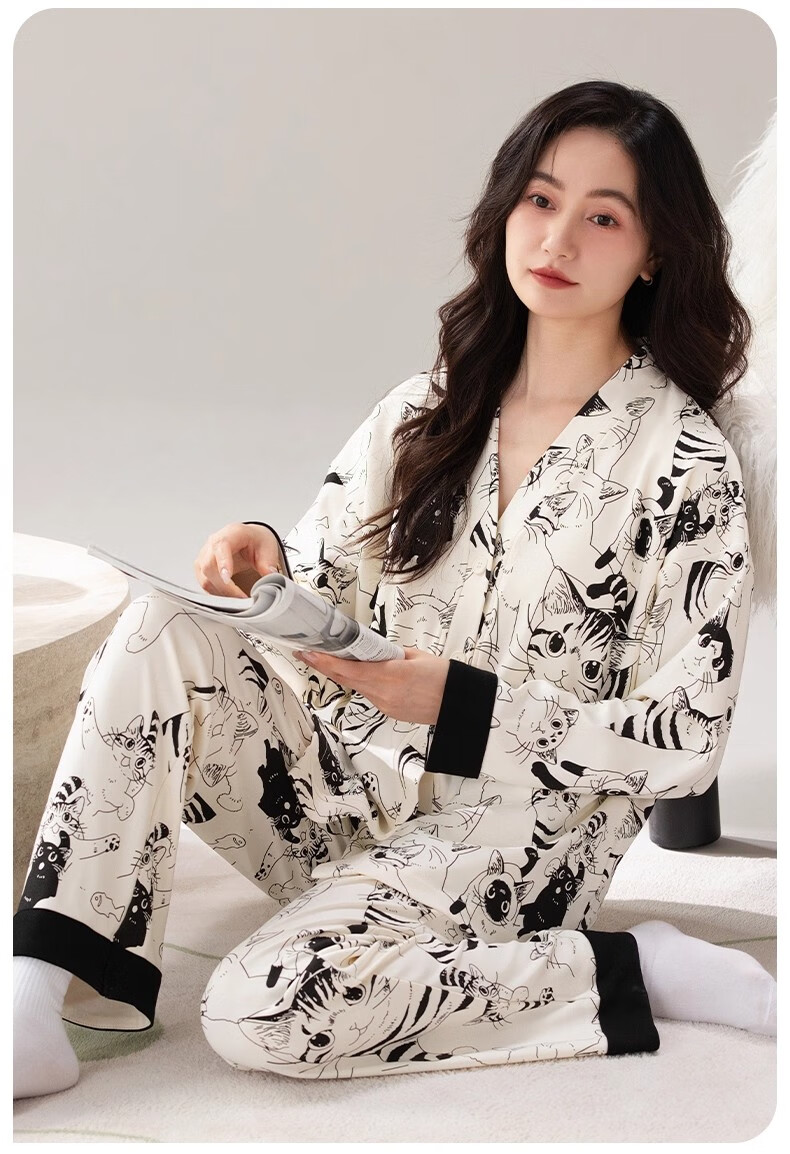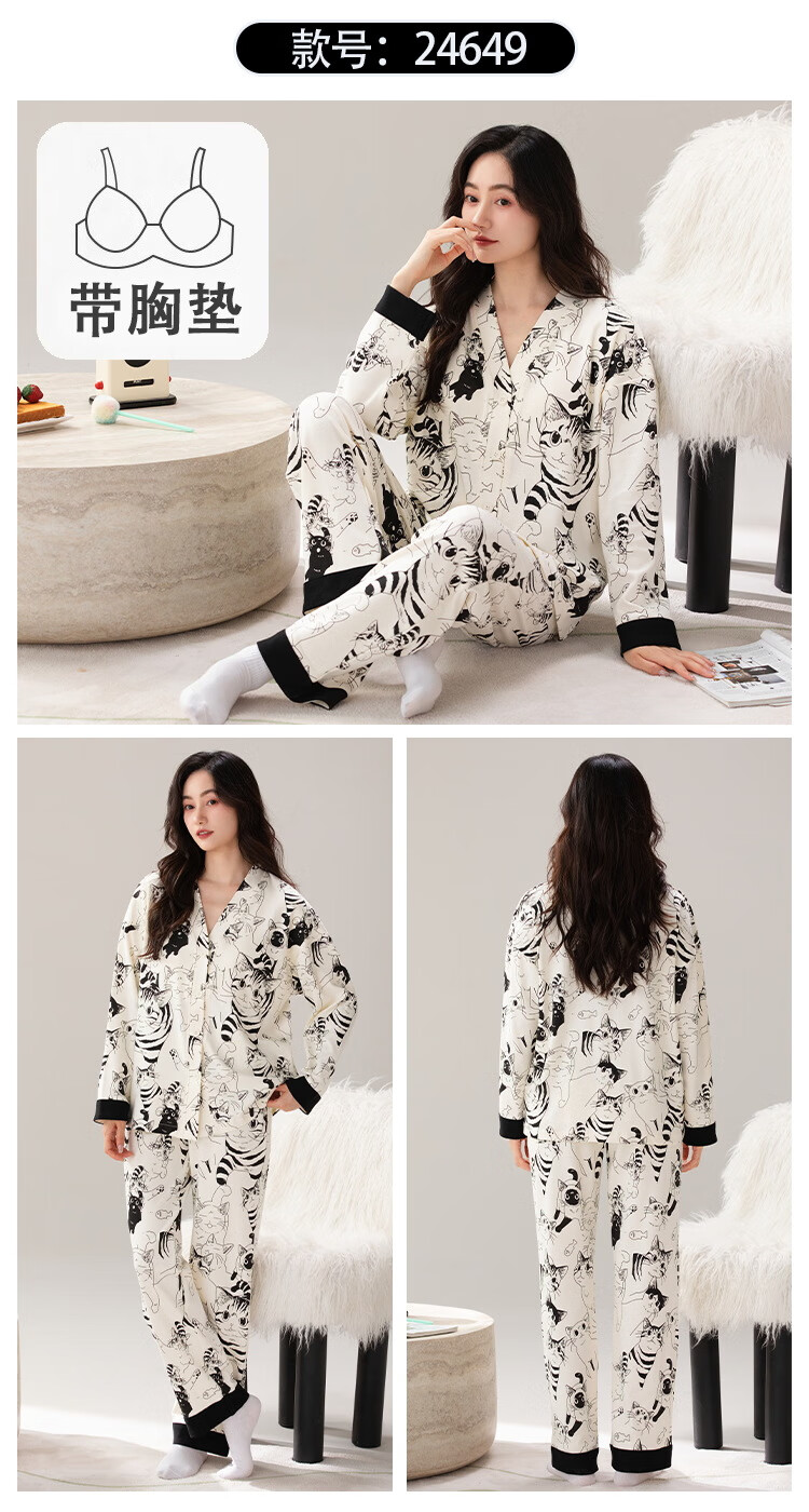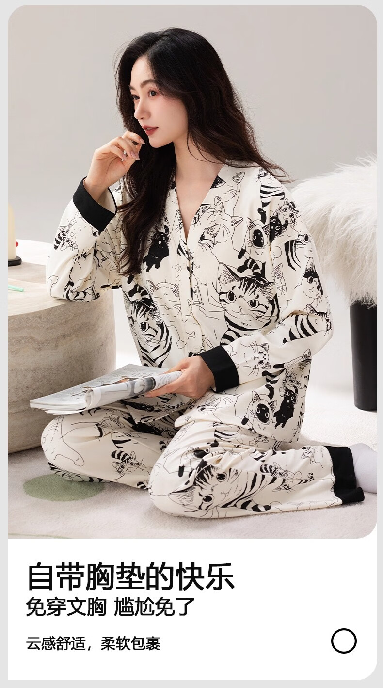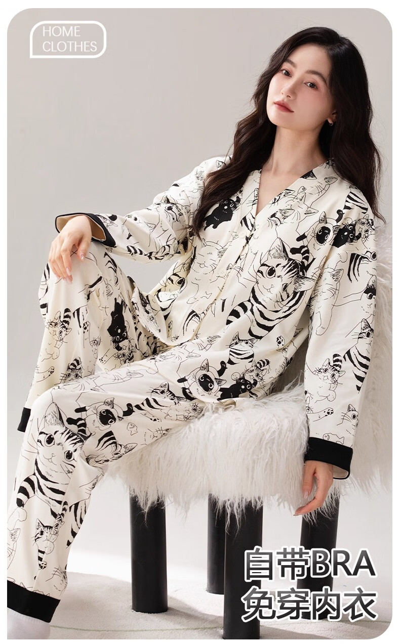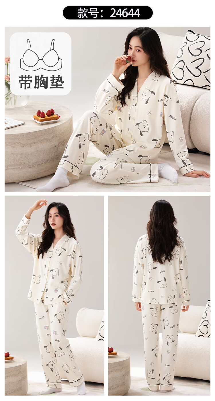 雅鹿睡衣女士带胸垫家居服套装长袖长裤春秋季薄款和服领开衫可外穿 H2282帕恰狗(带胸垫) XL 【建议110-130斤】