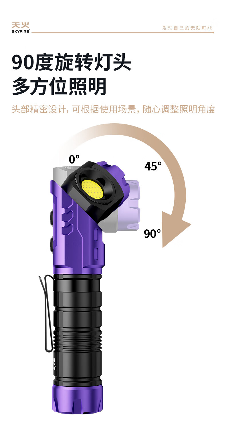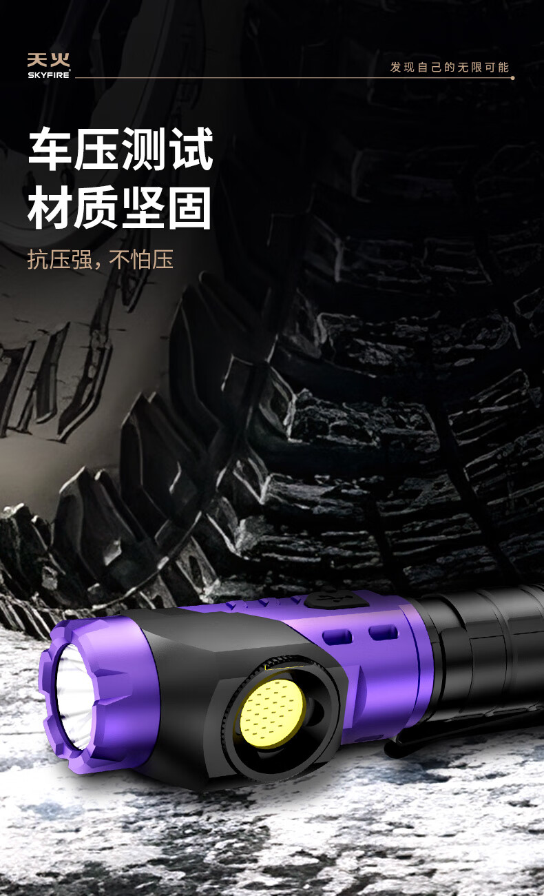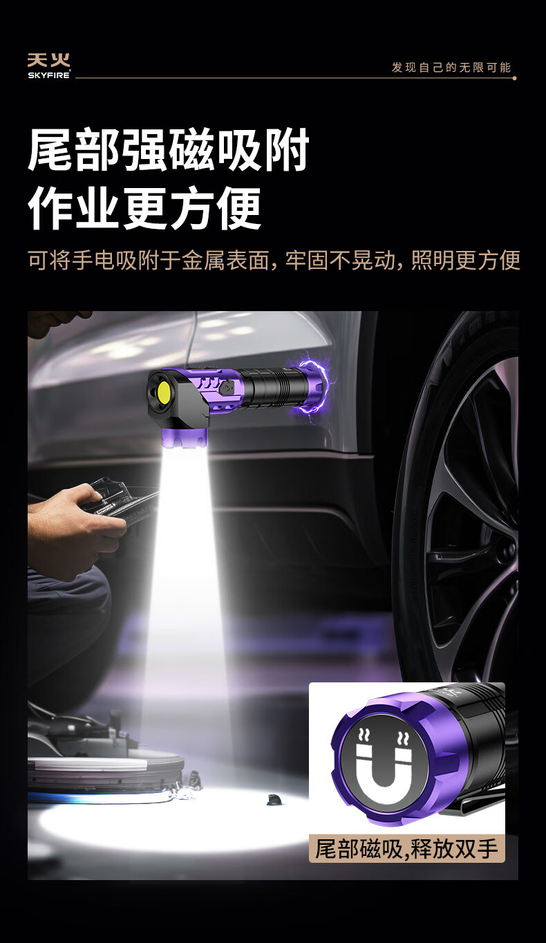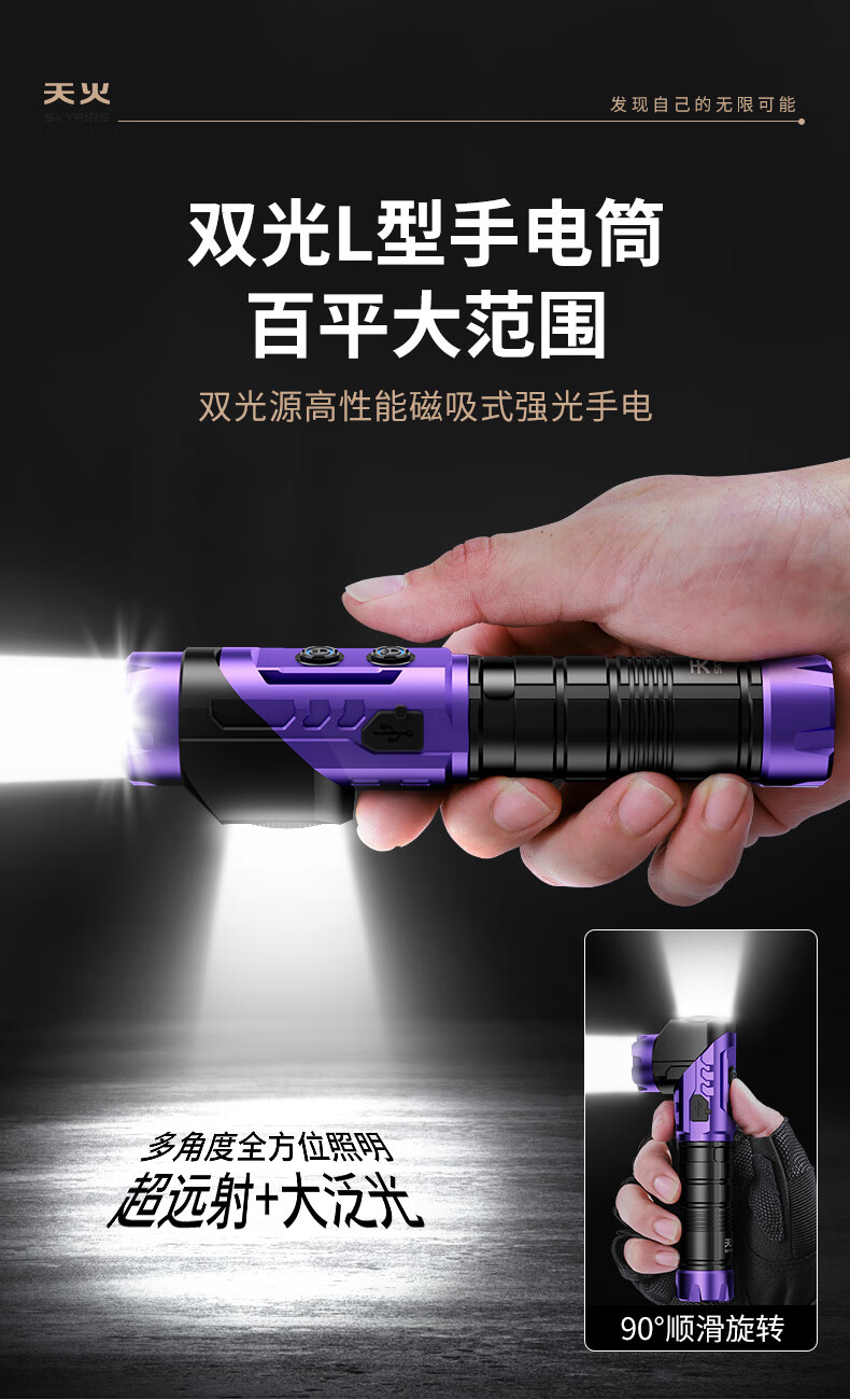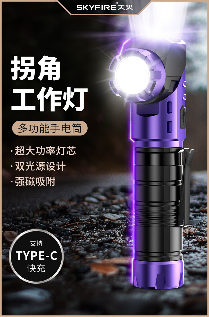 天火手电筒强光充电超亮户外登山小型便携远射战术磁吸工作灯汽修 紫-拐角双灯 强力磁吸丨单锂电