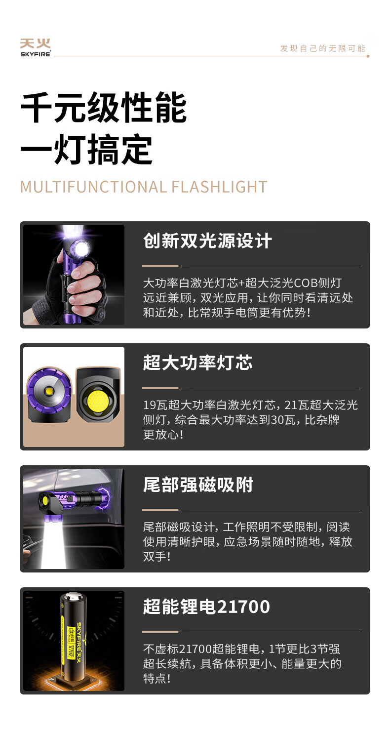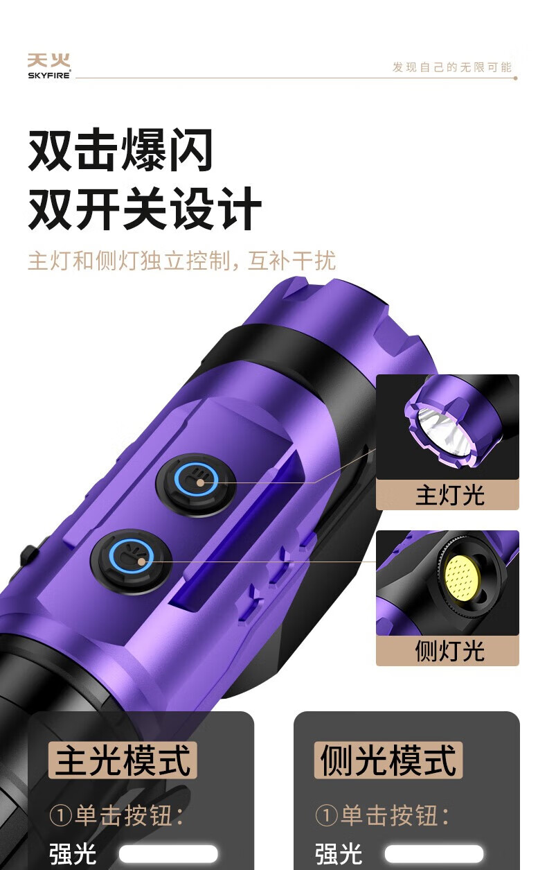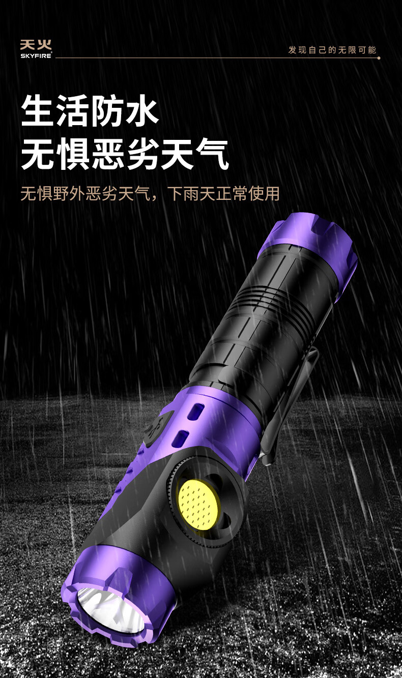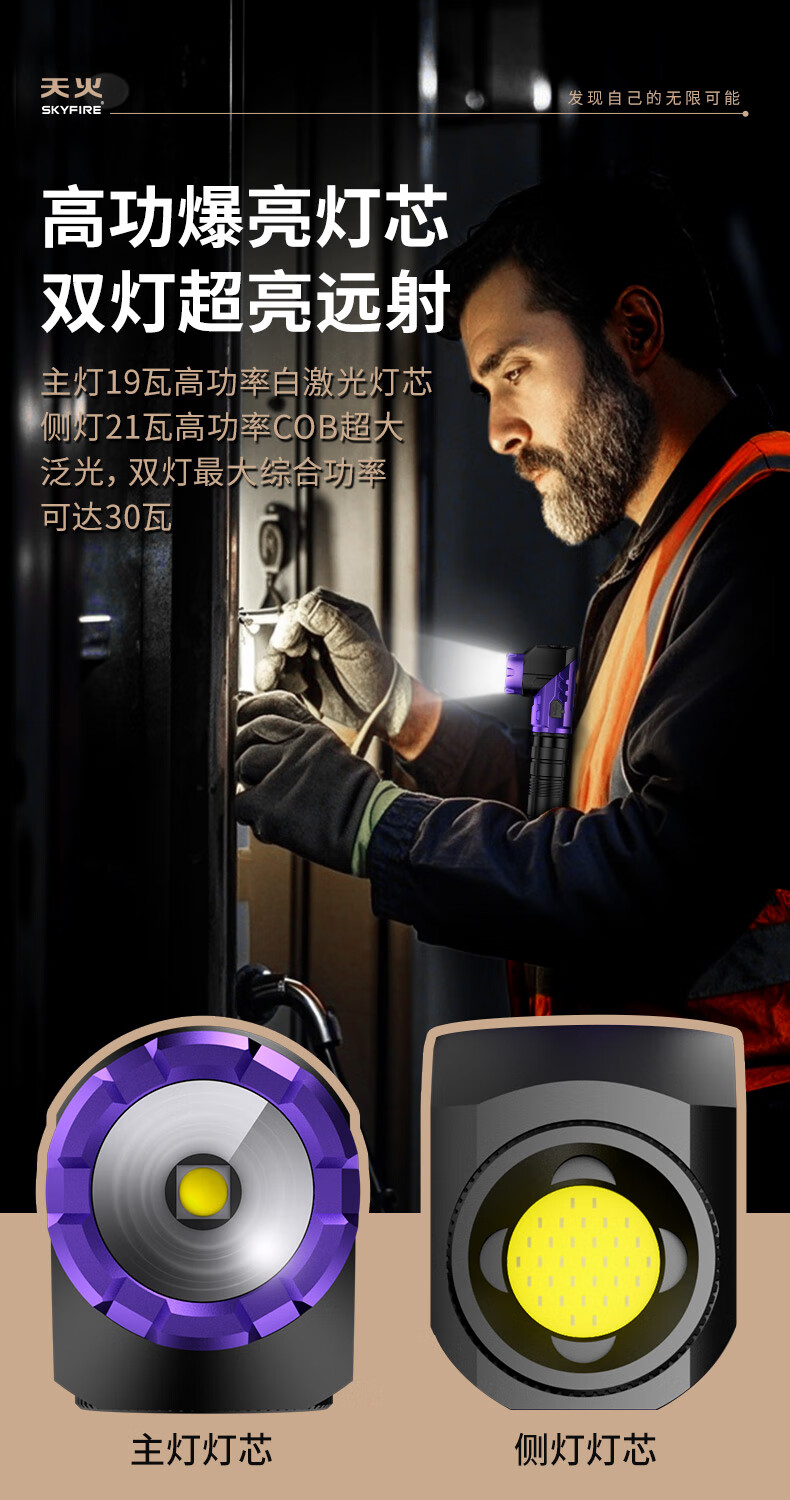 天火手电筒强光充电超亮户外登山小型便携远射战术磁吸工作灯汽修 紫-拐角双灯 强力磁吸丨单锂电