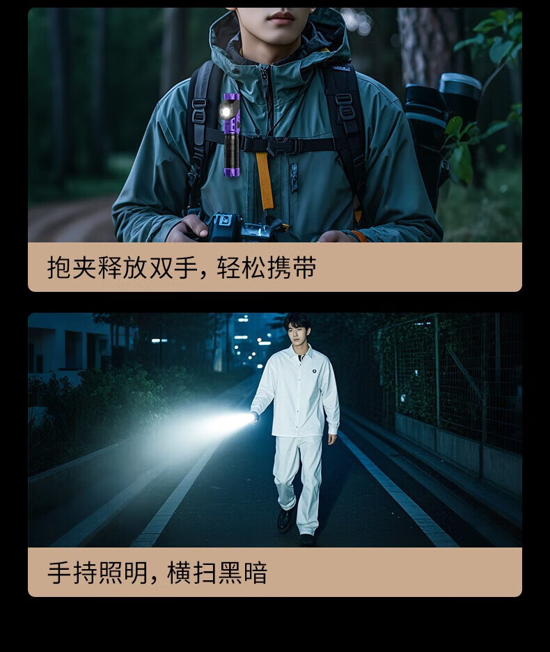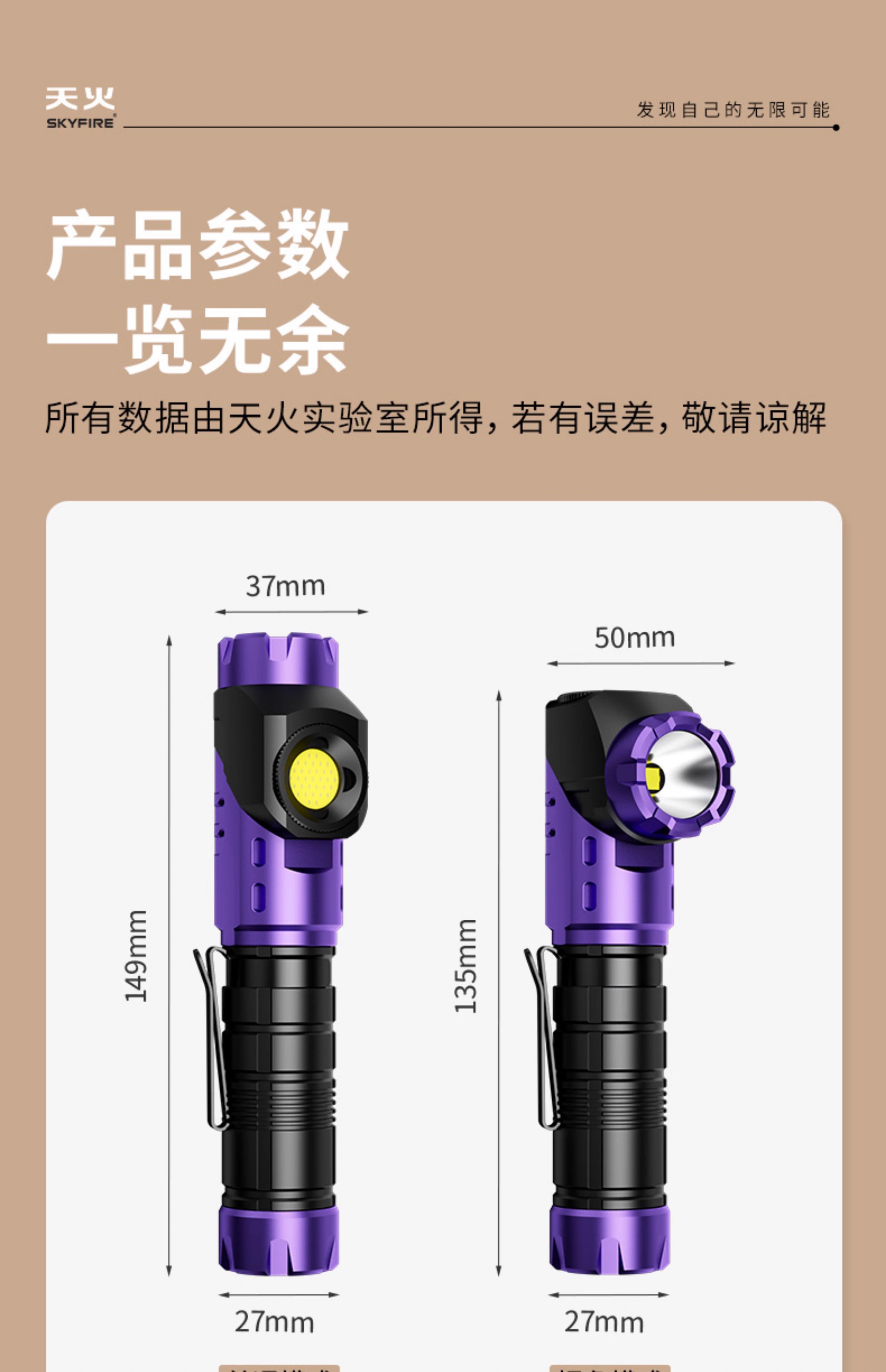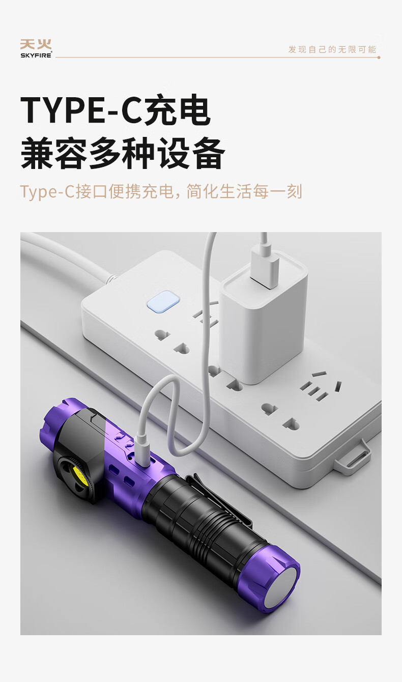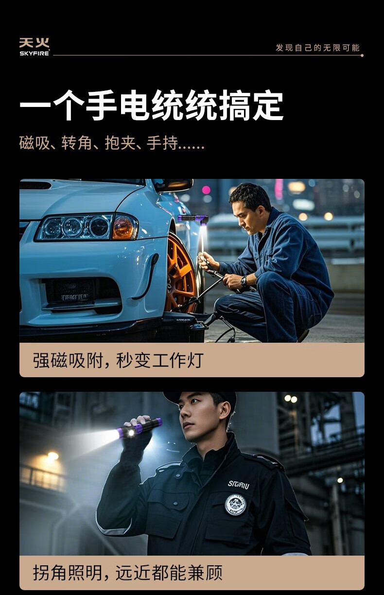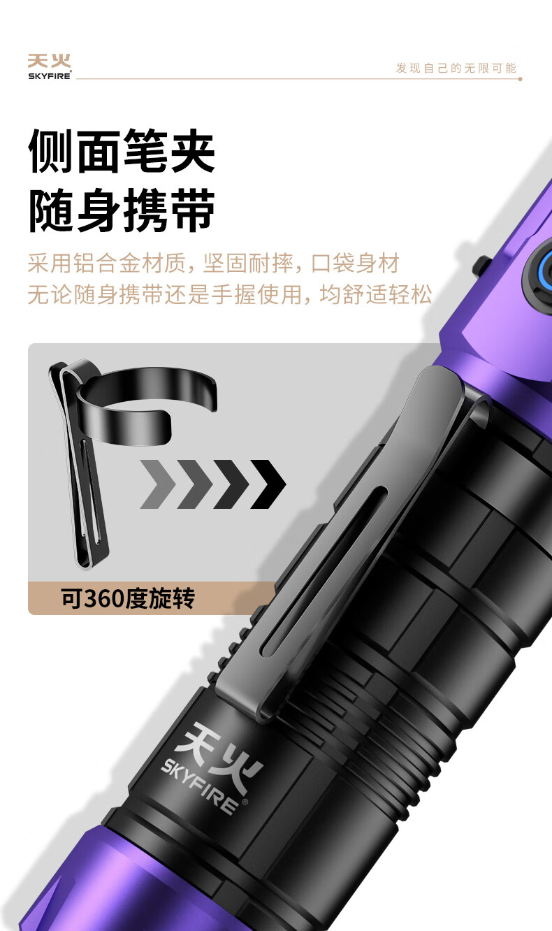 天火手电筒强光充电超亮户外登山小型便携远射战术磁吸工作灯汽修 紫-拐角双灯 强力磁吸丨单锂电