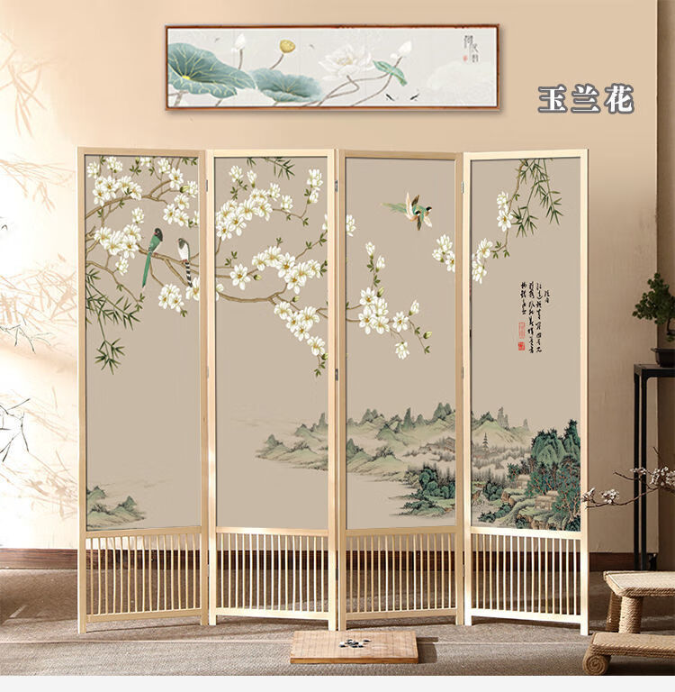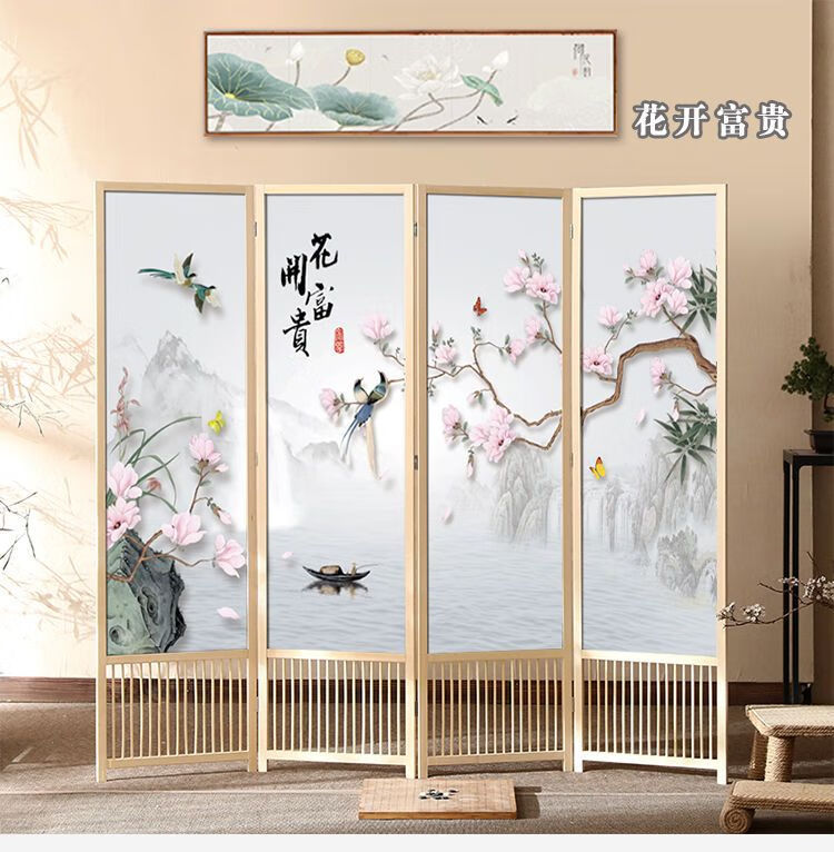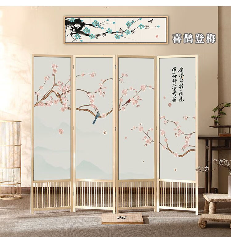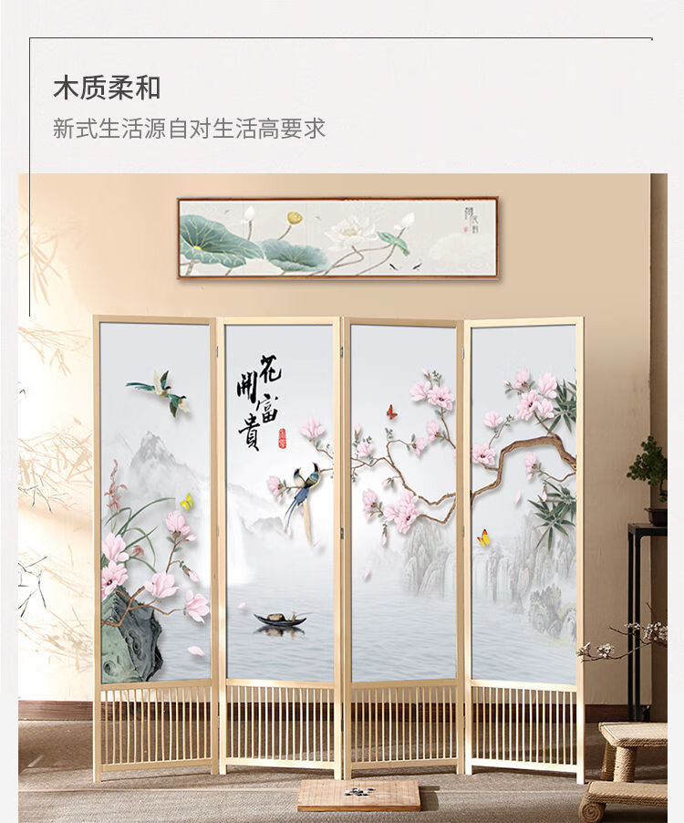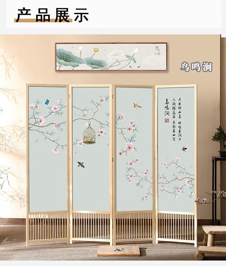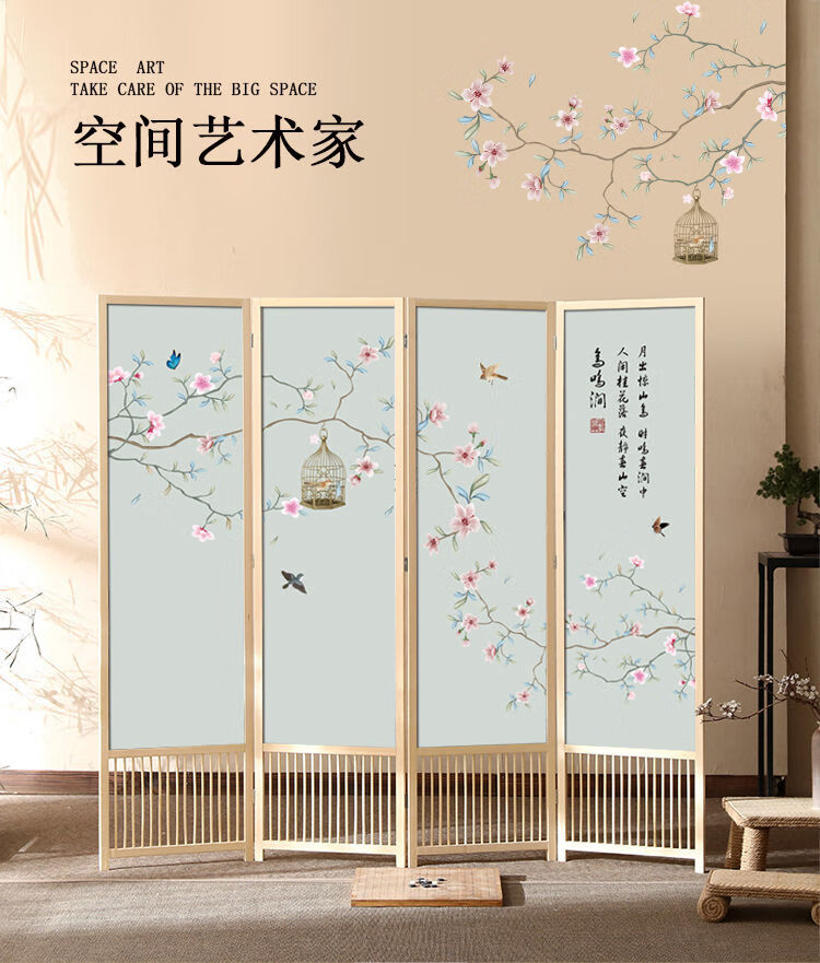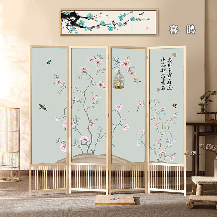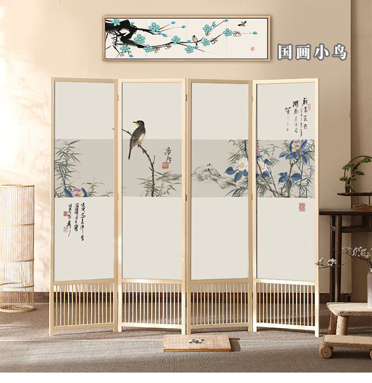倘然之家实木屏风隔断现代简约家用折叠移动客厅卧室书房遮挡屏酒店办公室 国画小鸟 1.8米高x0.48米宽*3扇