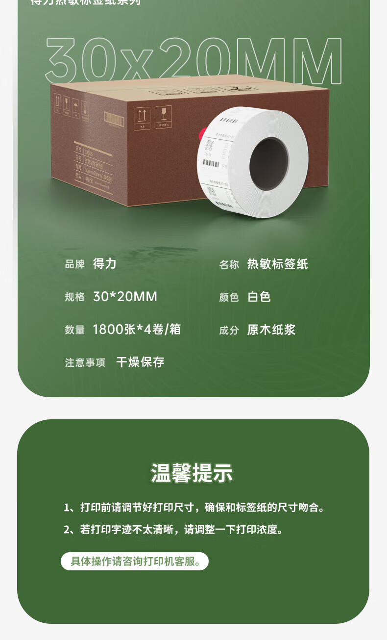 得力(deli)珊瑚海30*20mm 1800张*4卷 三防热敏标签打印纸 奶茶服饰 电子秤条码纸 不干胶打印纸12005
