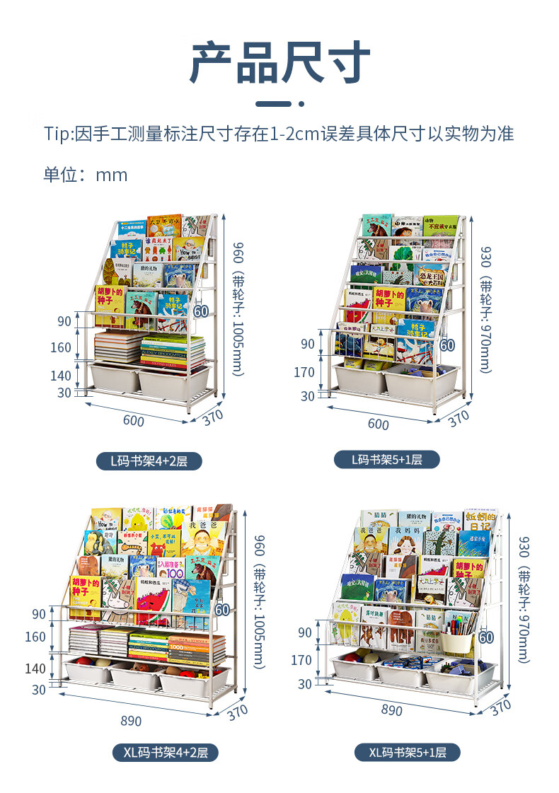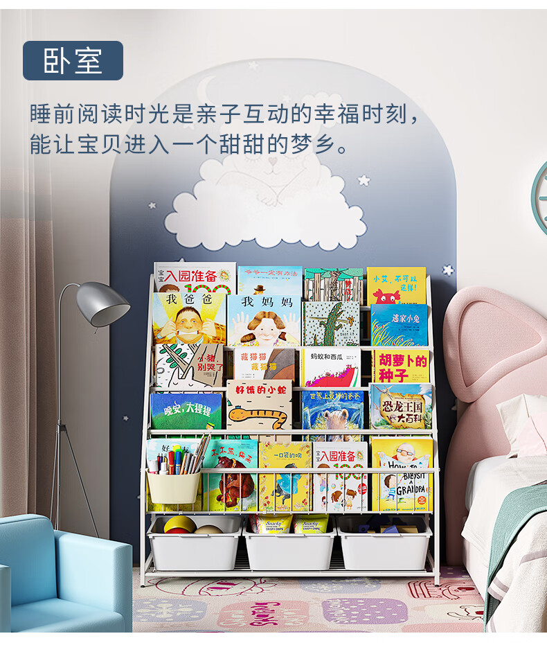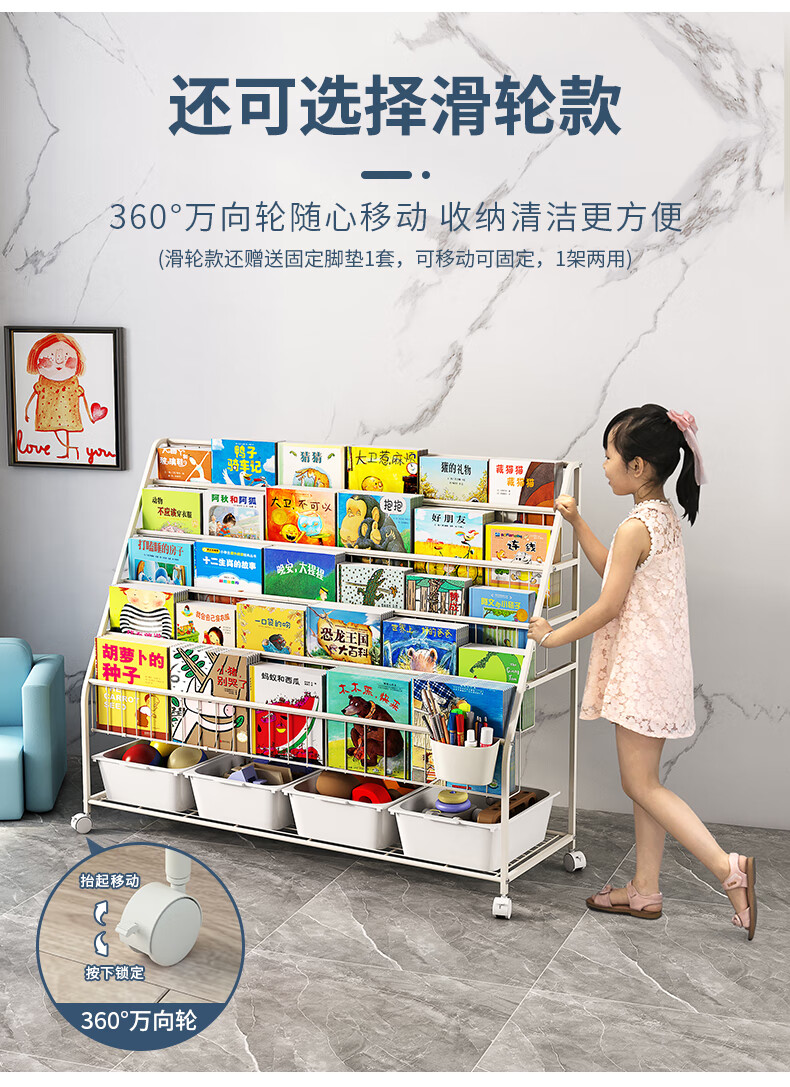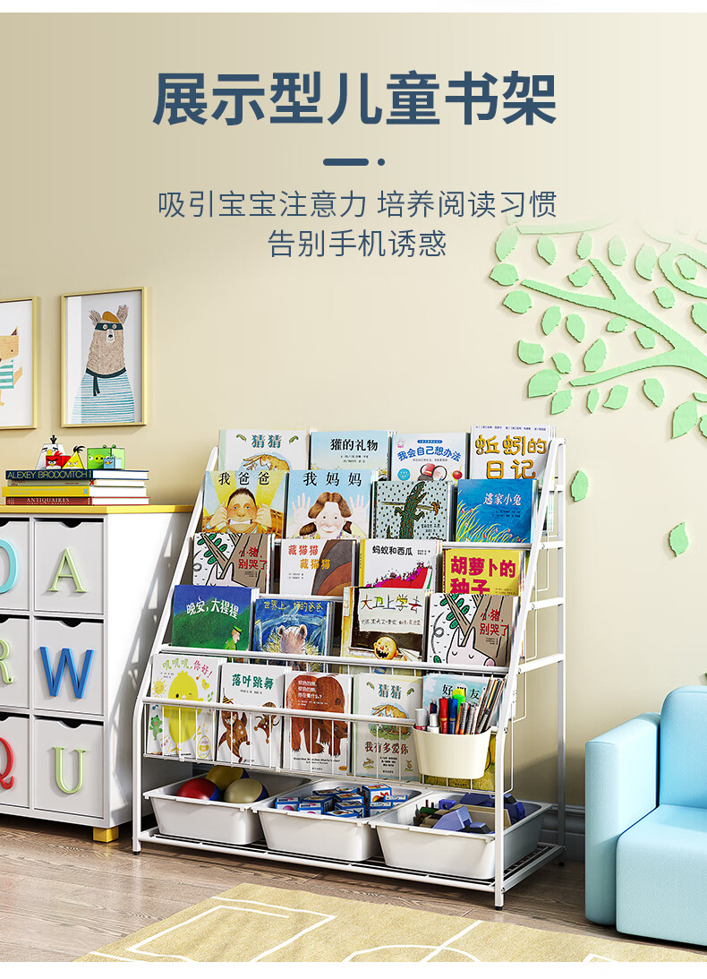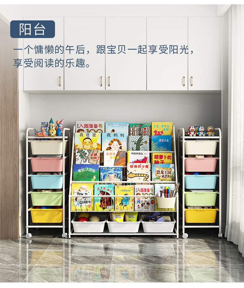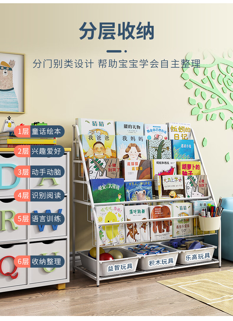 SOFS儿童书架落地宝宝绘本架书报置物架杂志架书本玩具收纳架一体幼儿铁艺小书柜 L码(4+2)层2盒无轮子