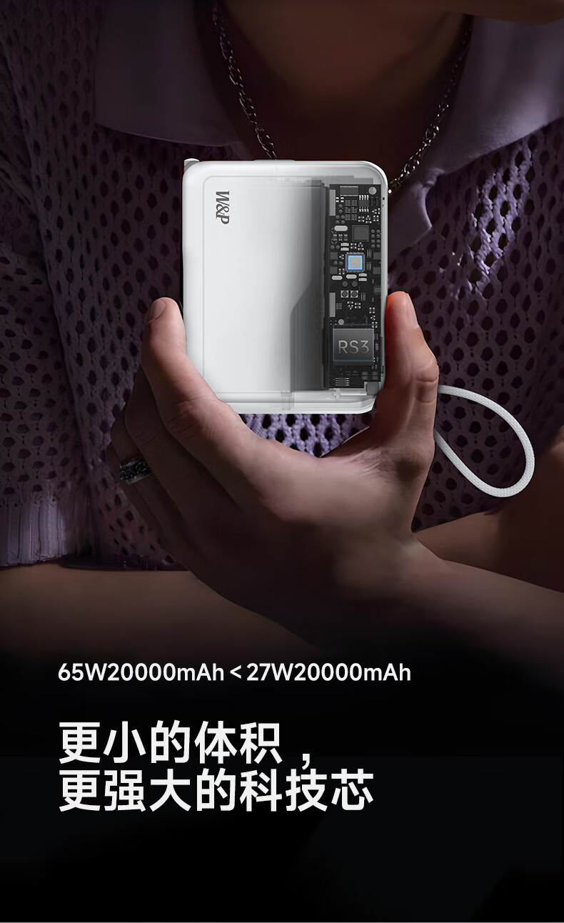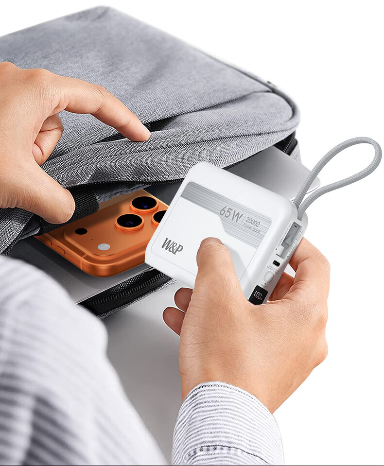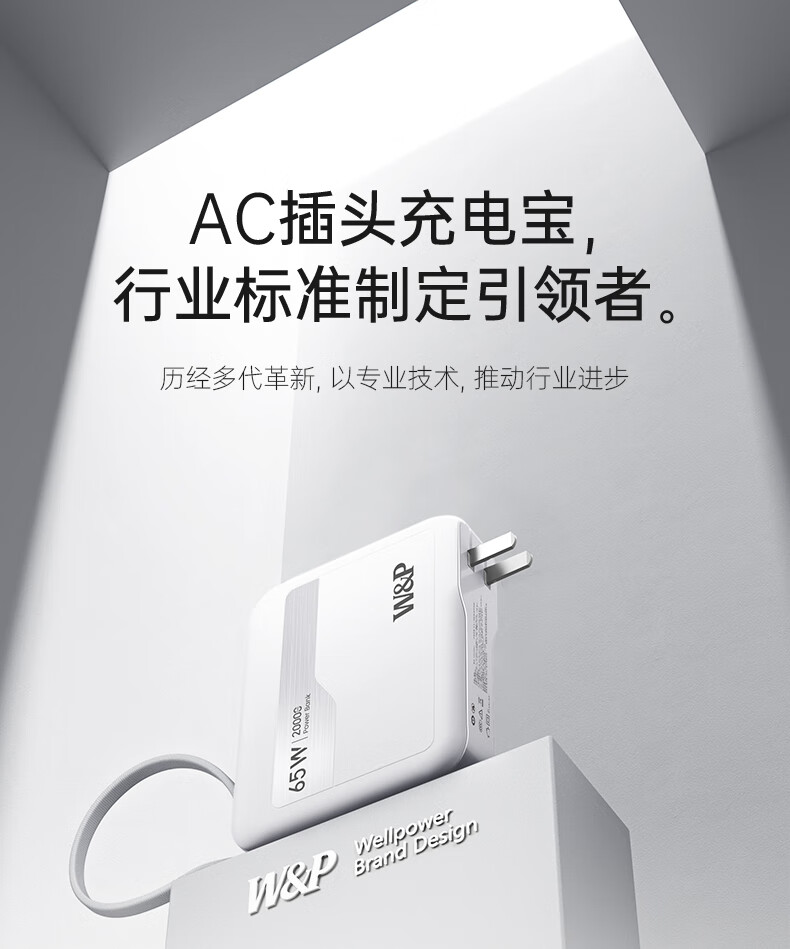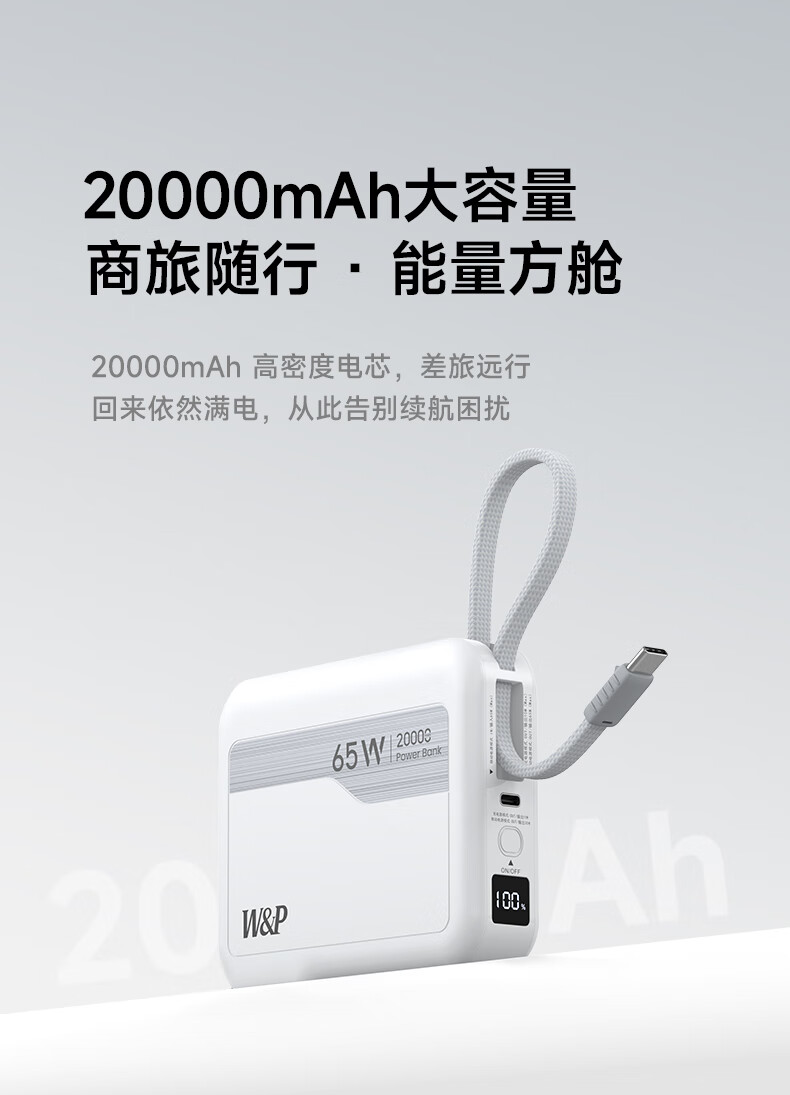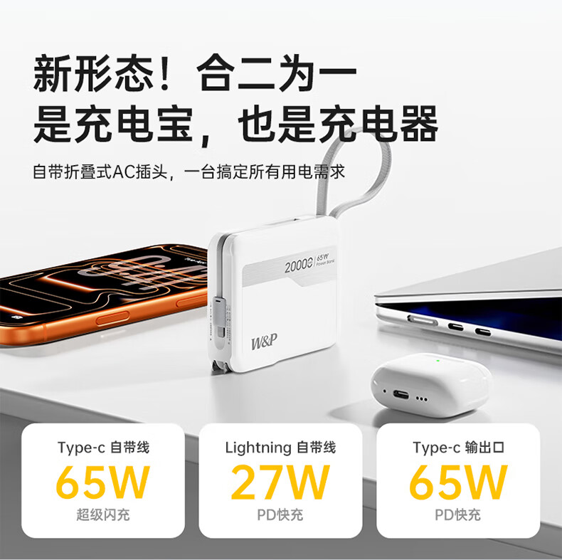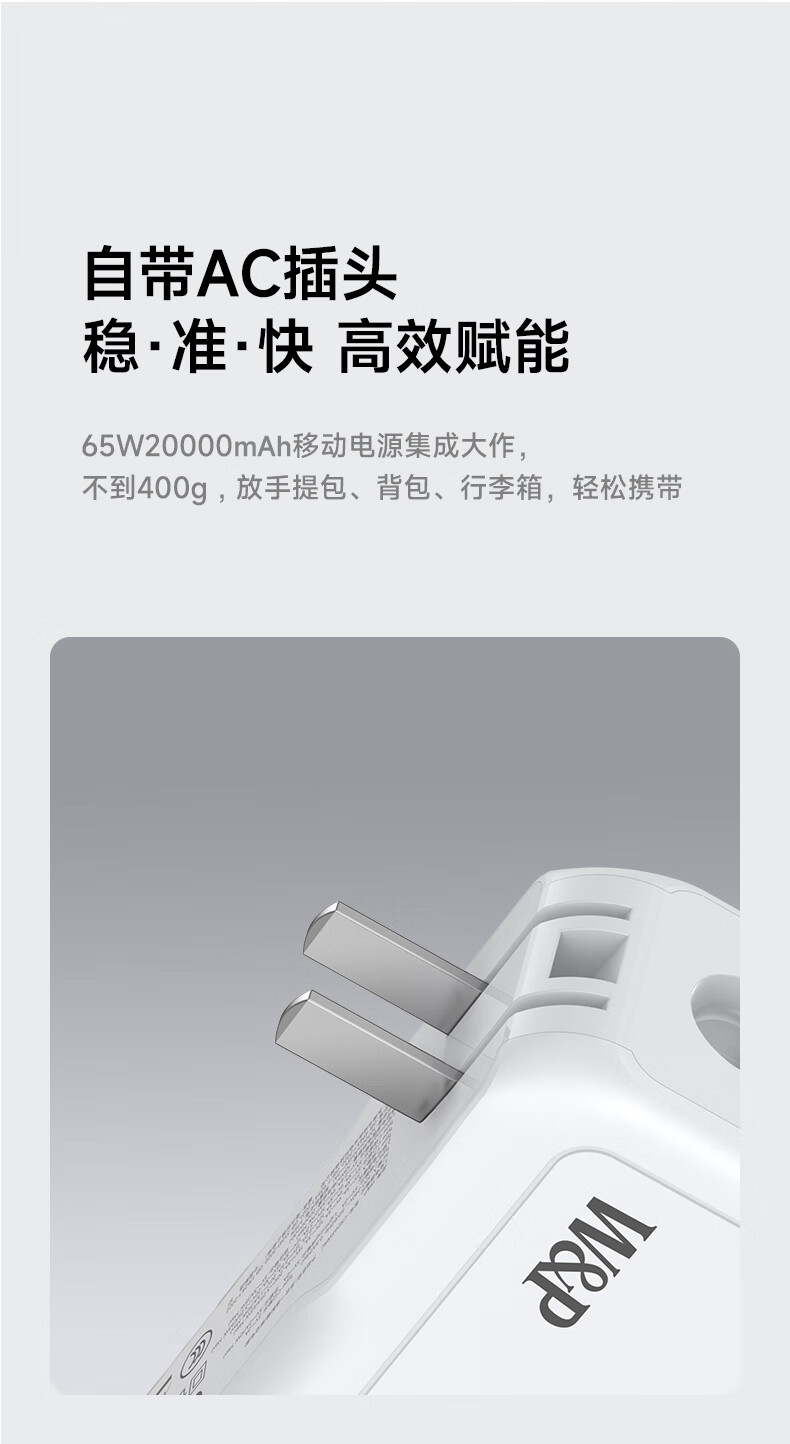 W&P新国标3C认证可上飞机65W充电宝20000毫安自带双线AC插头快充三合一移动电源适用苹果17华为小米wp