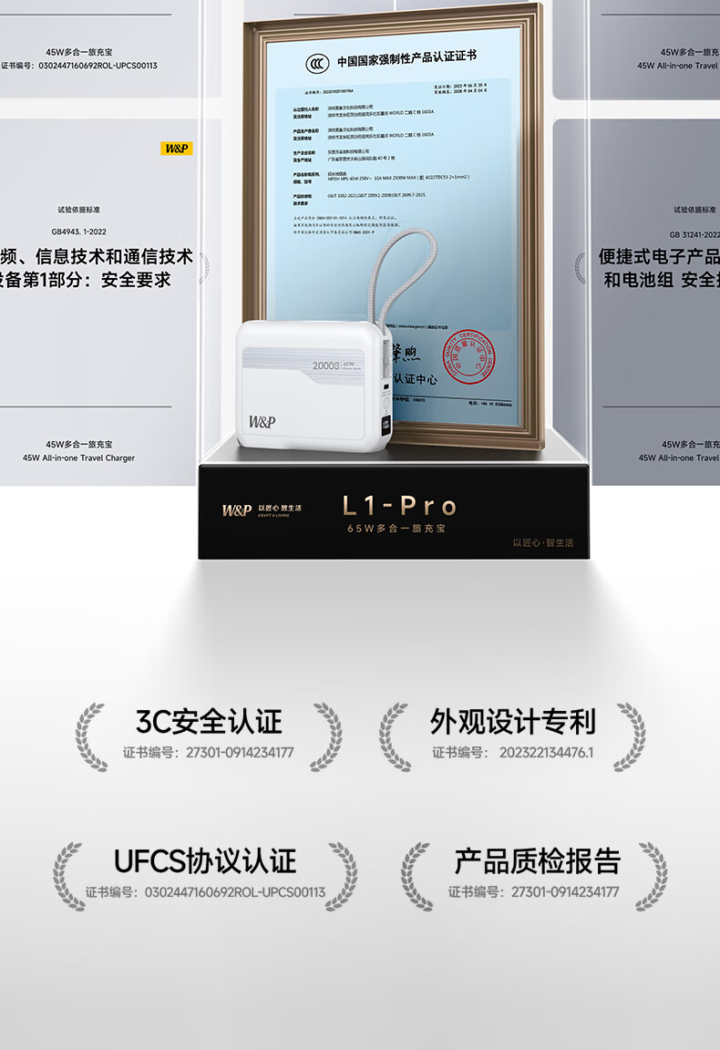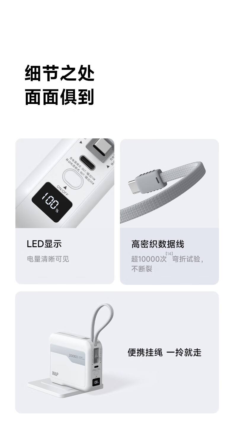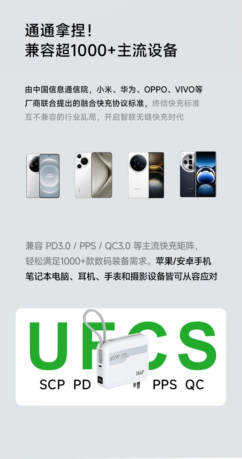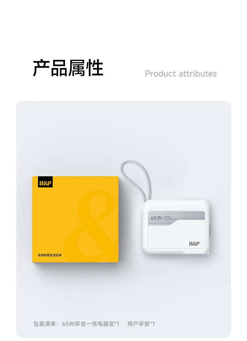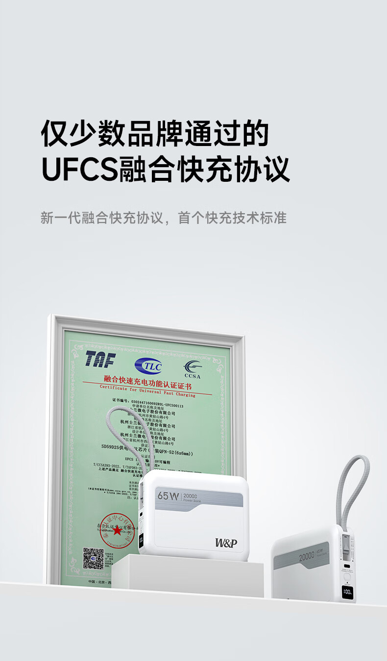 W&P新国标3C认证可上飞机65W充电宝20000毫安自带双线AC插头快充三合一移动电源适用苹果17华为小米wp