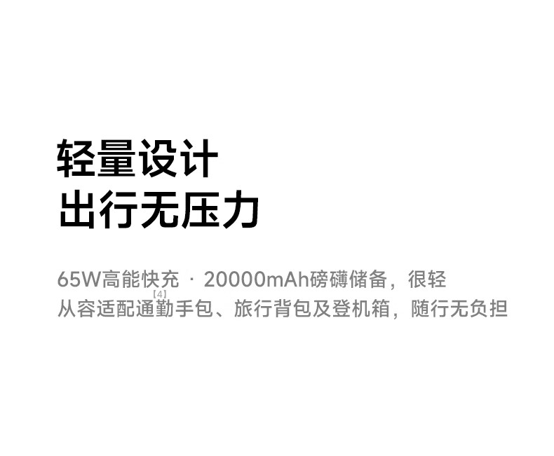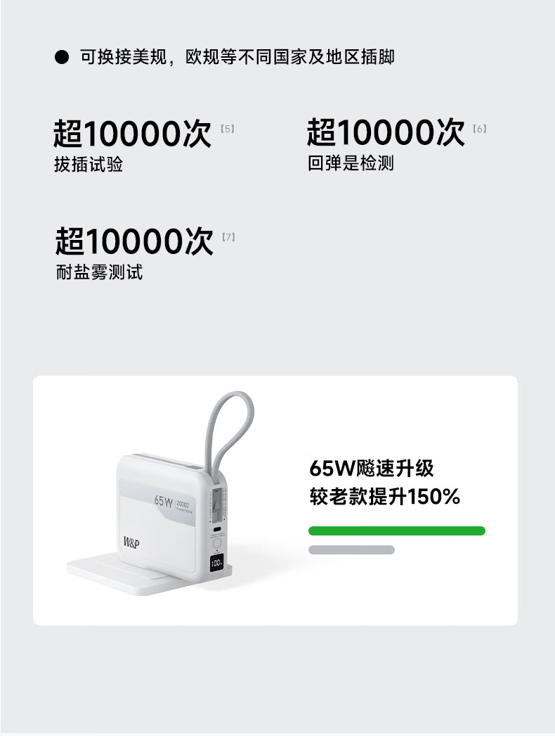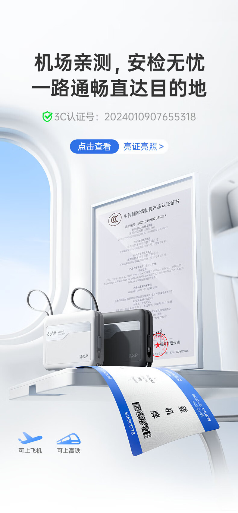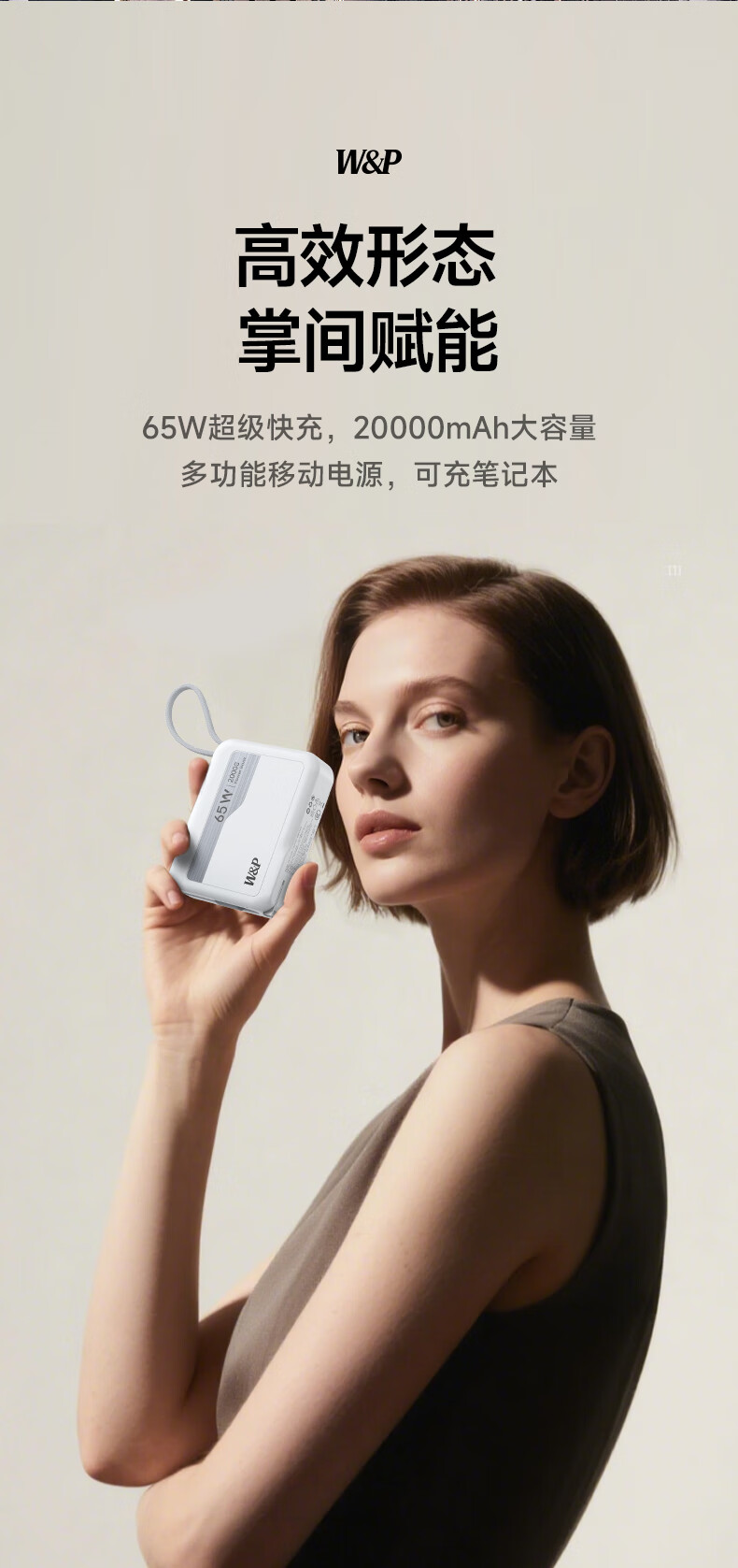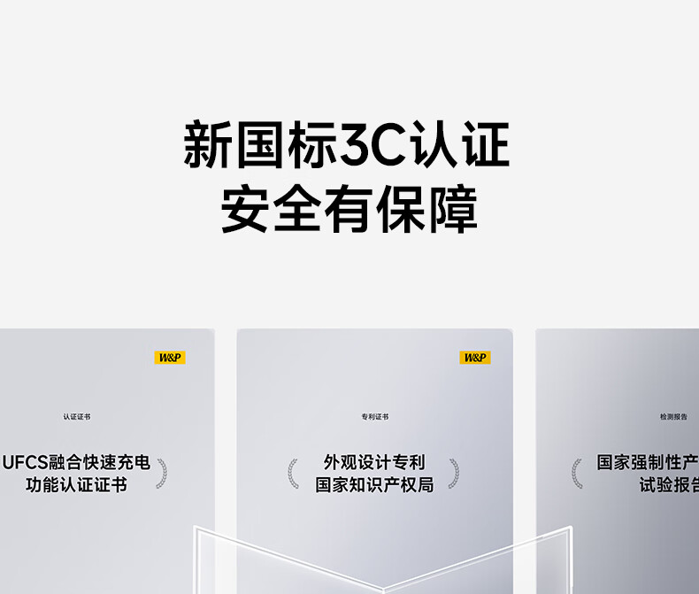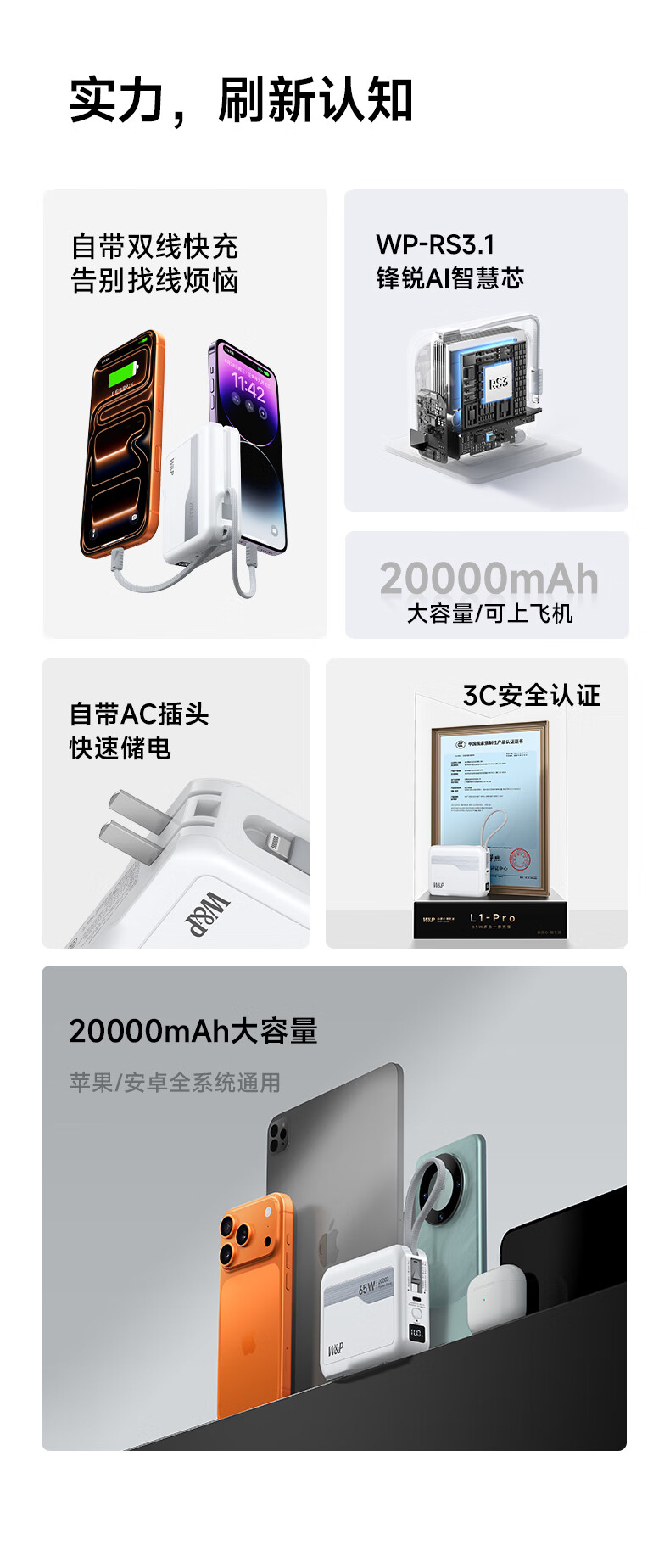 W&P新国标3C认证可上飞机65W充电宝20000毫安自带双线AC插头快充三合一移动电源适用苹果17华为小米wp