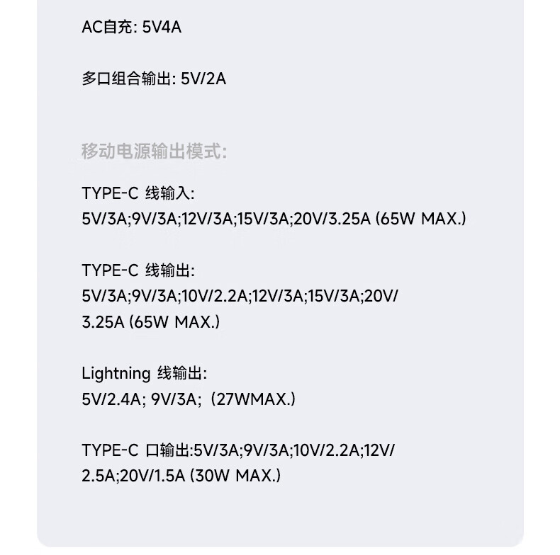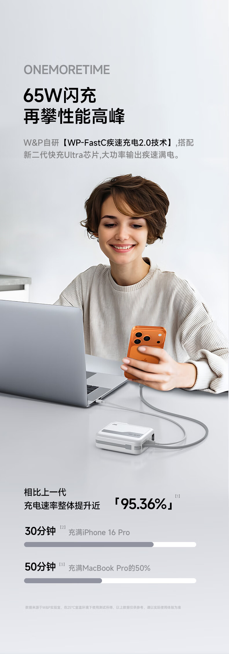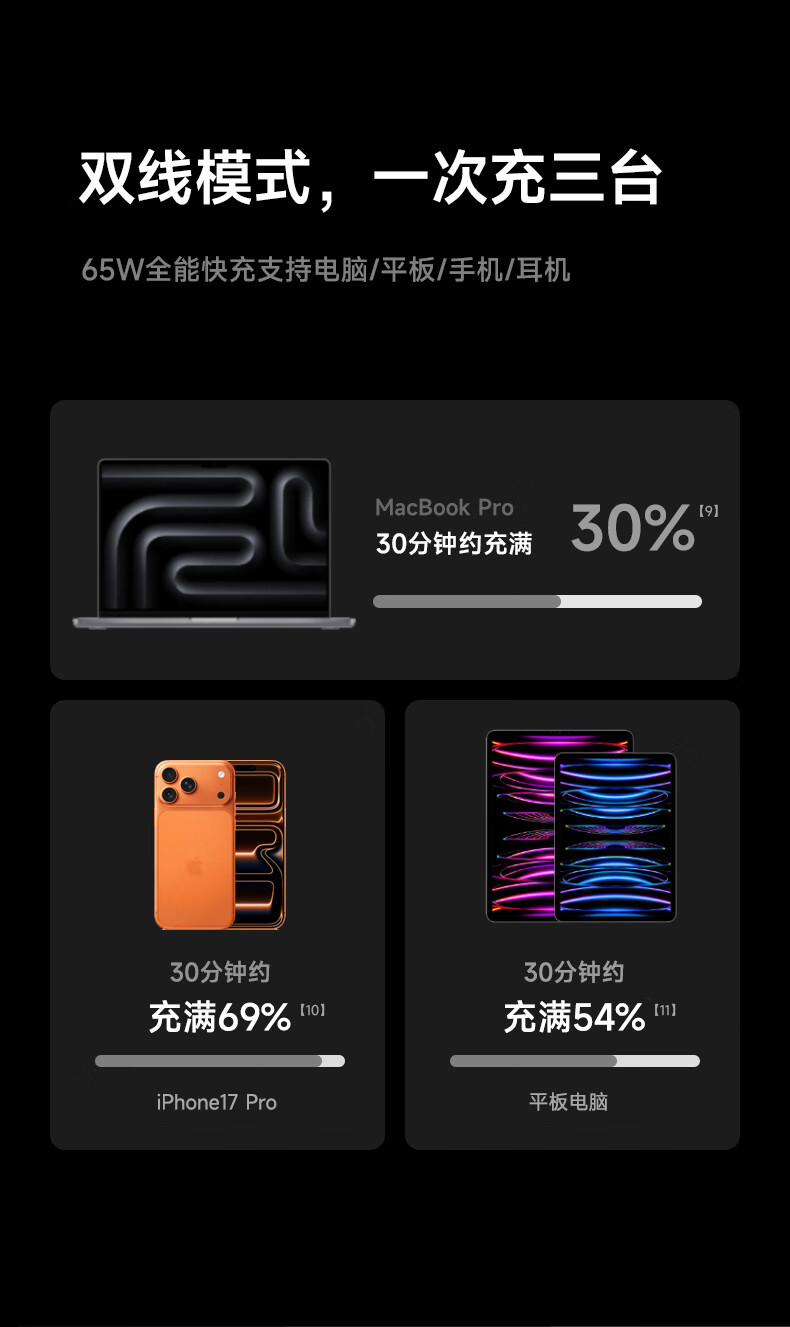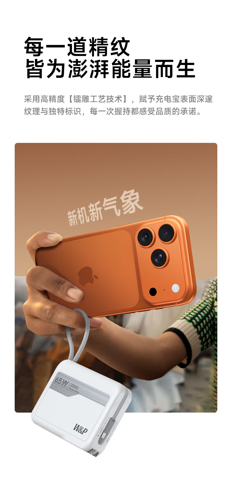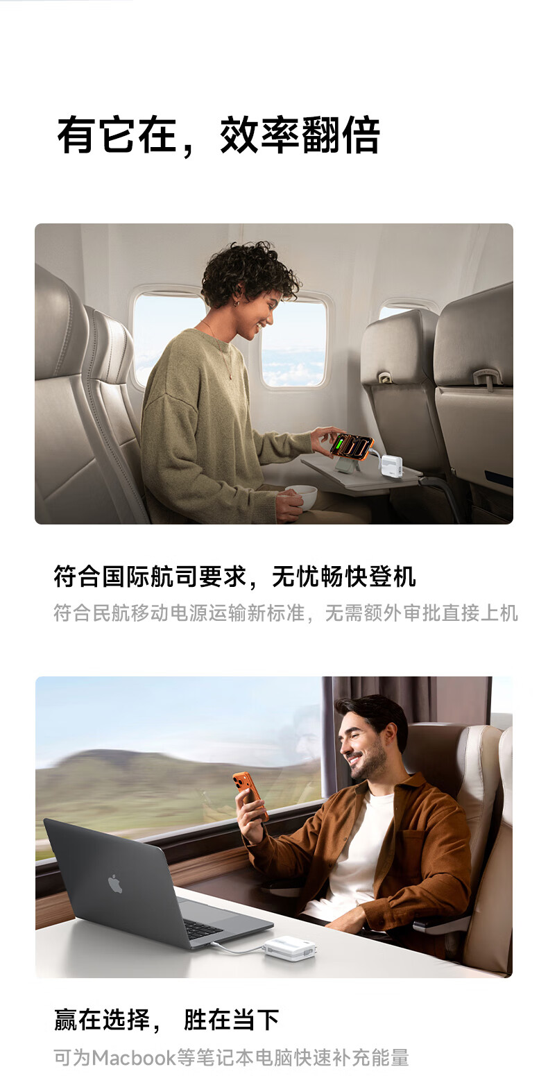 W&P新国标3C认证可上飞机65W充电宝20000毫安自带双线AC插头快充三合一移动电源适用苹果17华为小米wp