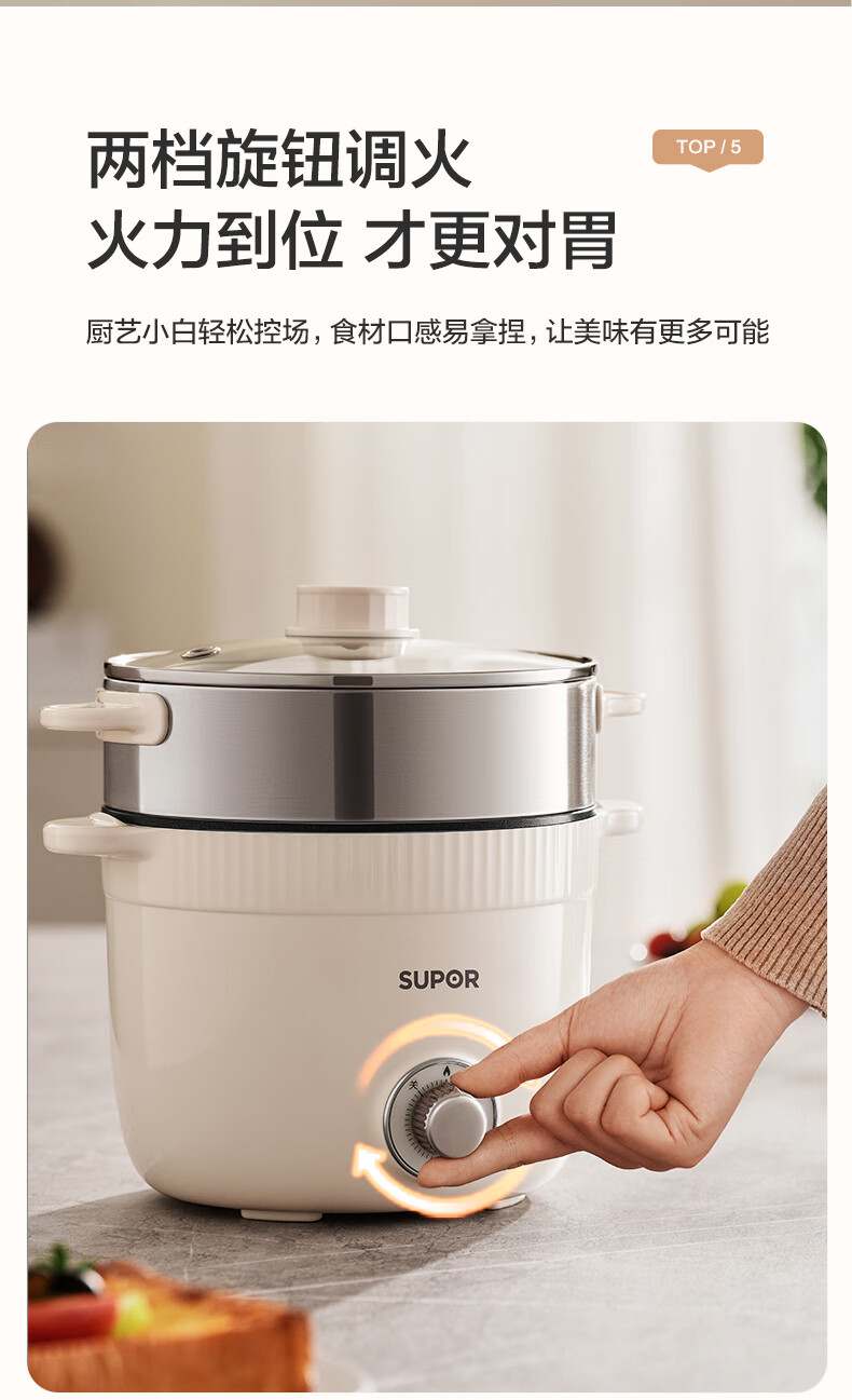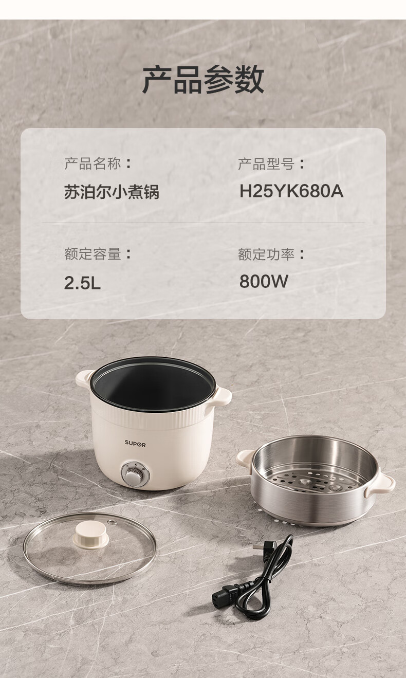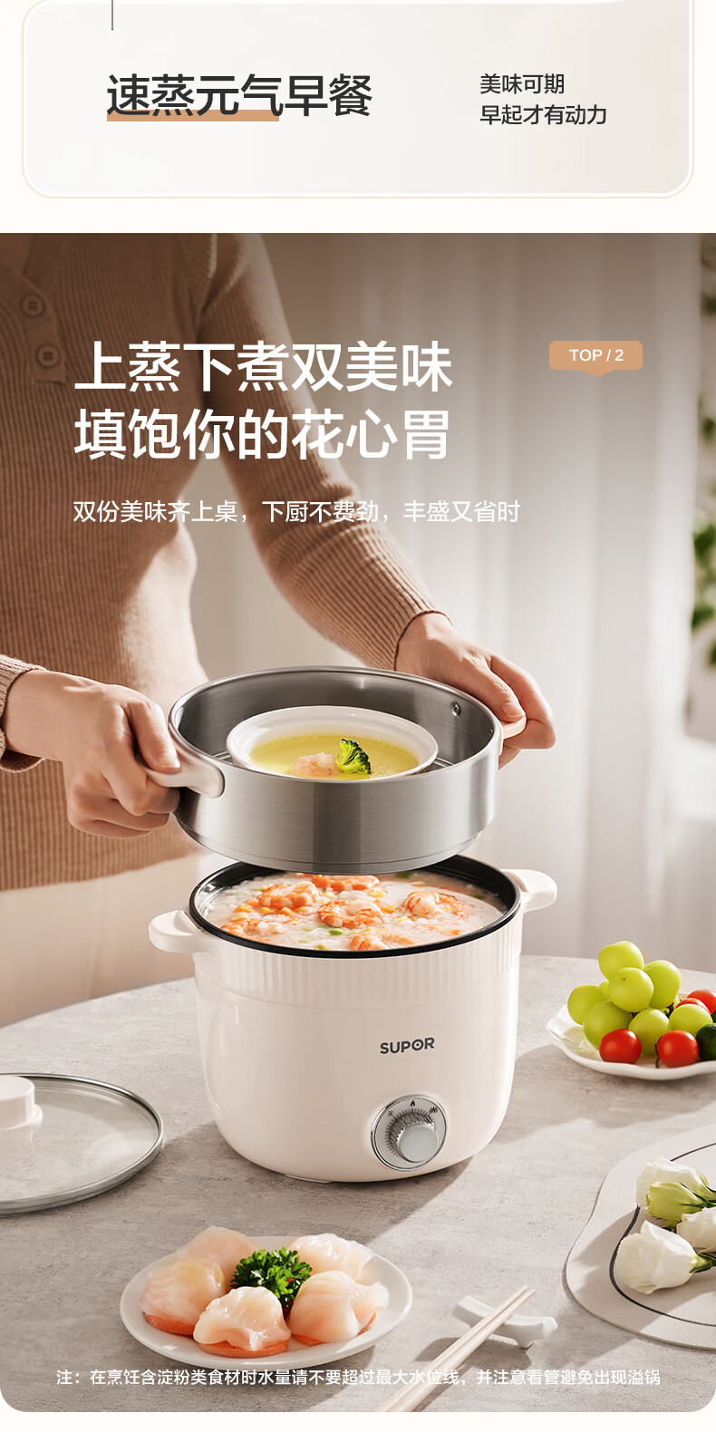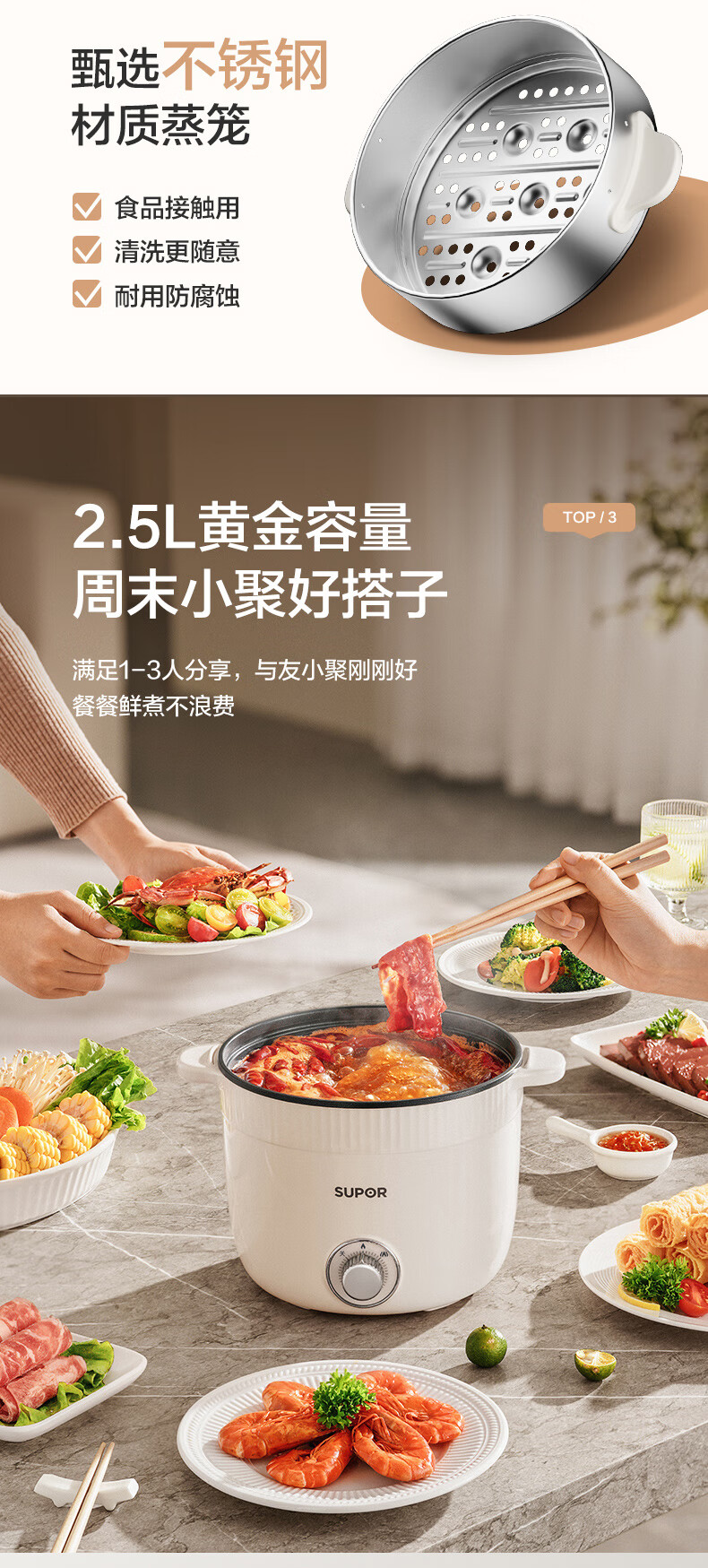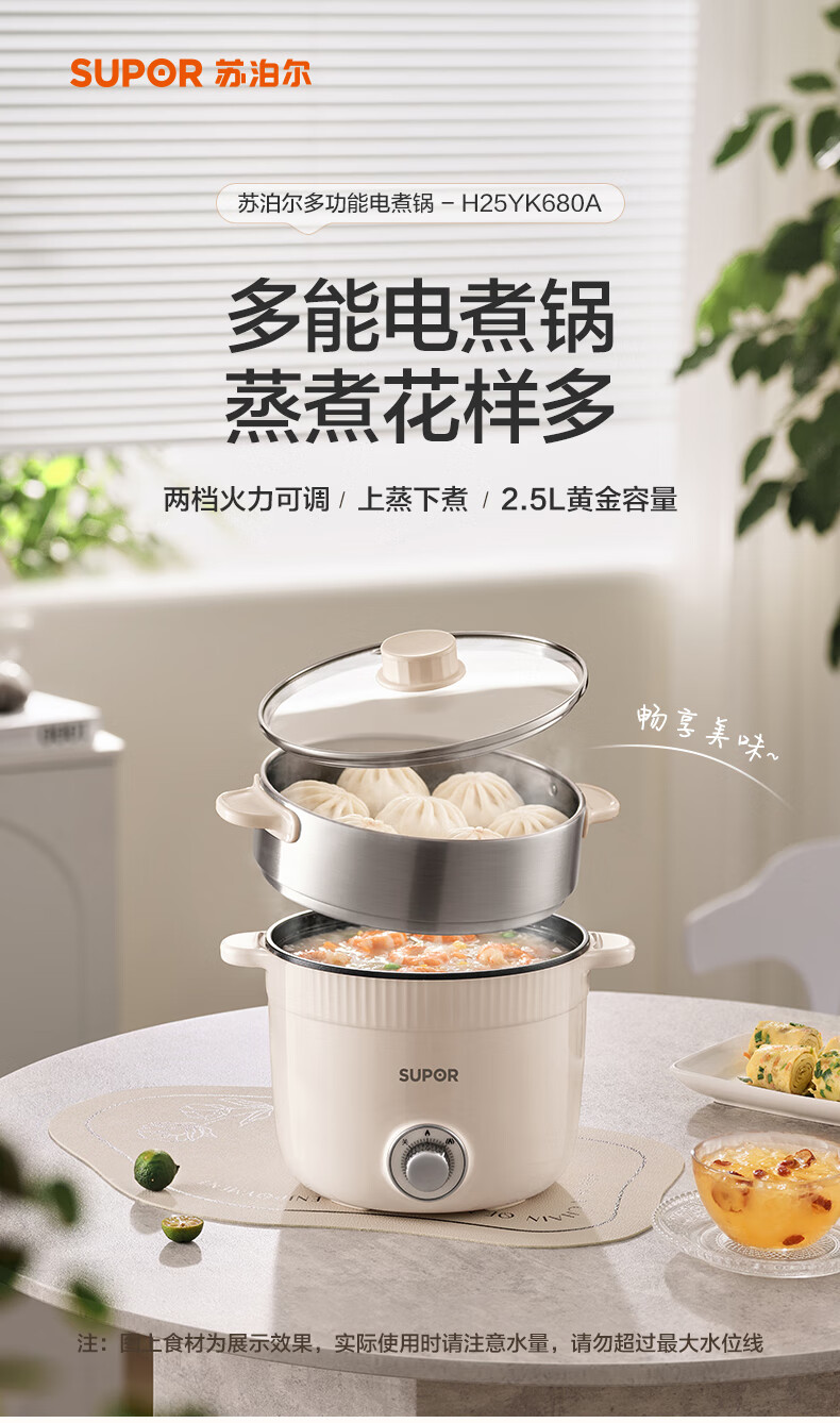 苏泊尔(SUPOR)电煮锅 电蒸锅 多功能泡面宿舍小火锅 2.5L带蒸屉电炖锅 蒸煮一体电热锅H25YK680A