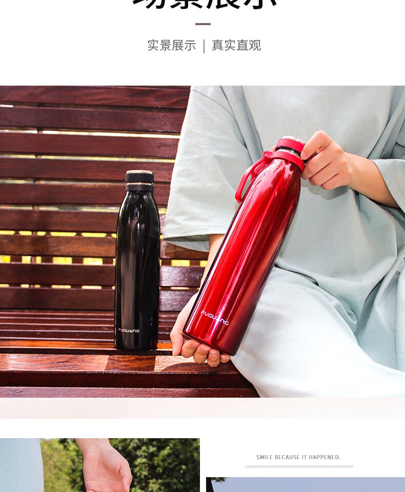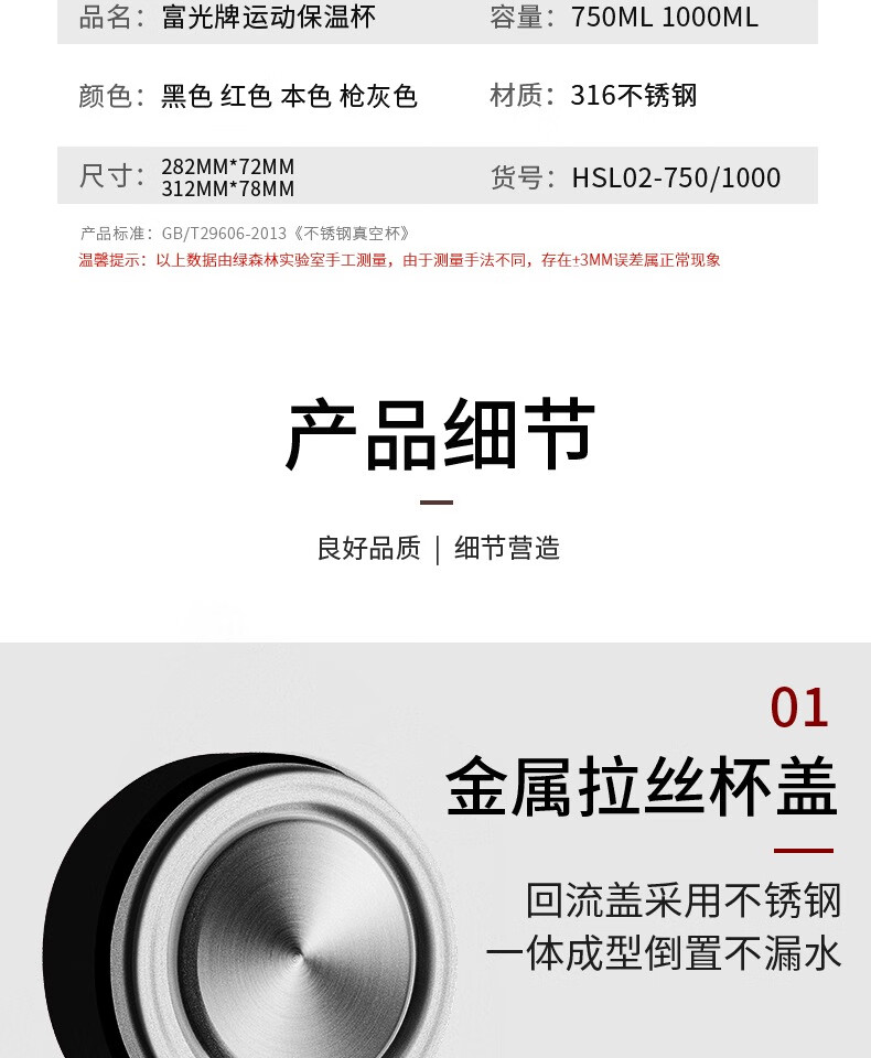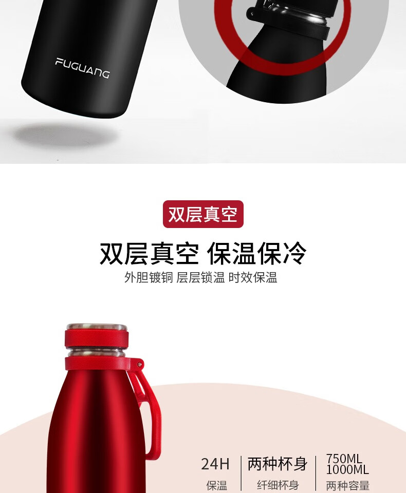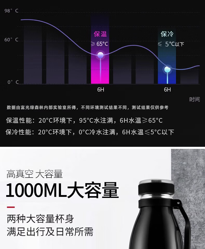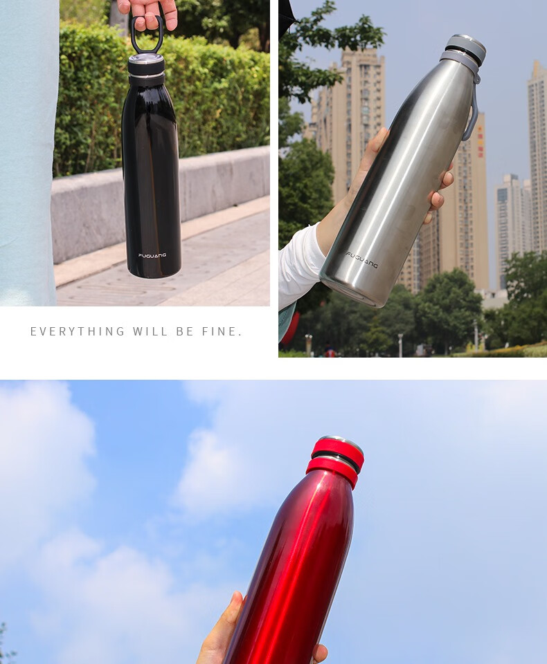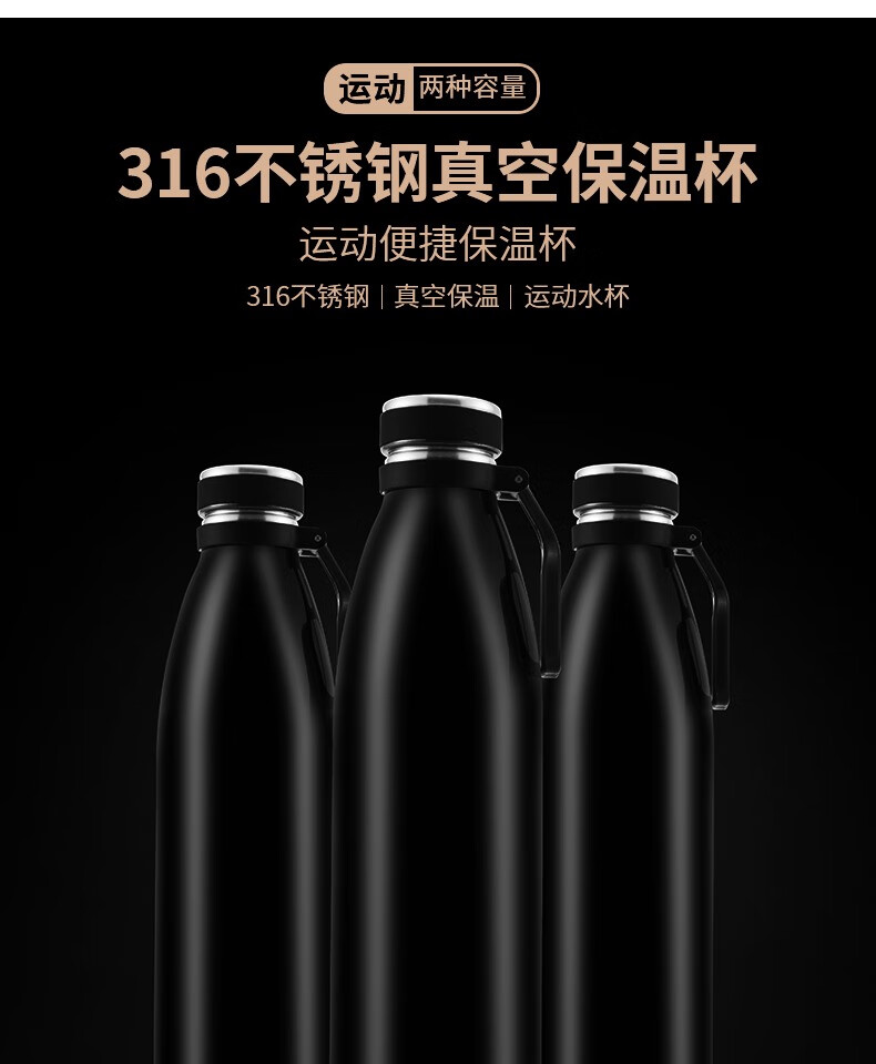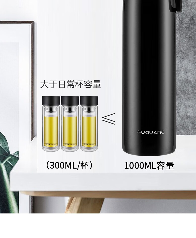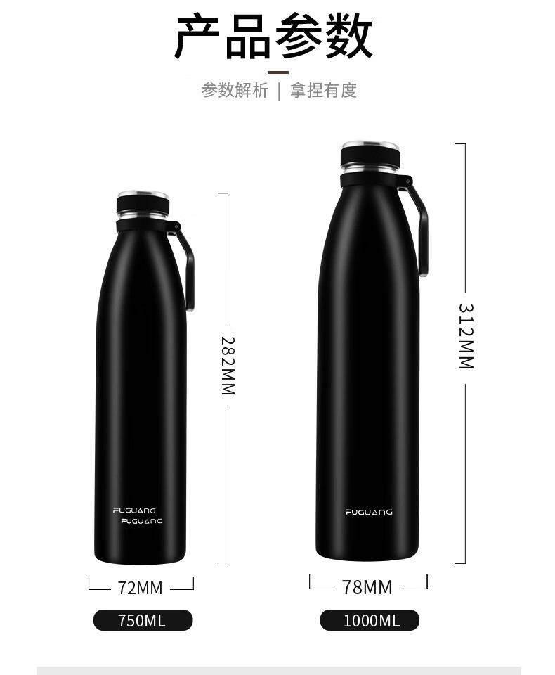 富光保温杯大容量男士316不锈钢水杯学生户外运动便携水壶1000ml杯子 黑色-750ML