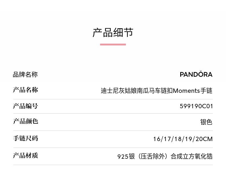 潘多拉(PANDORA)迪士尼南瓜马车链扣手链599190C01童话生日礼物送女友 17cm