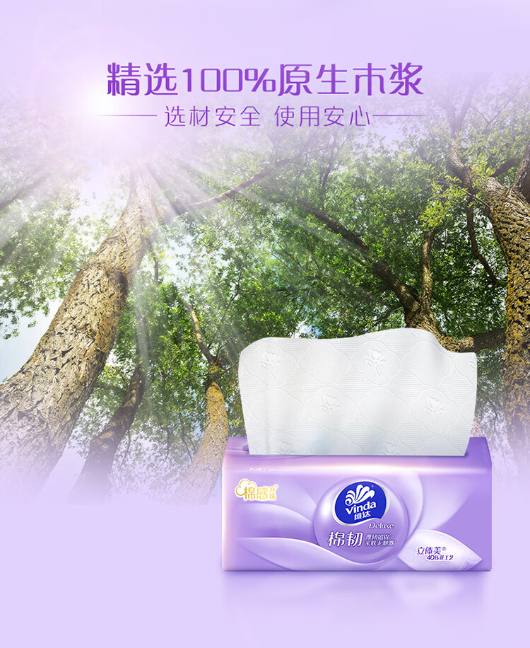 维达(Vinda)【孙颖莎同款】抽纸 棉韧压花立体3层M码大尺寸 擦手餐巾纸面巾 厚韧如棉 3层 100抽*20包 整箱装