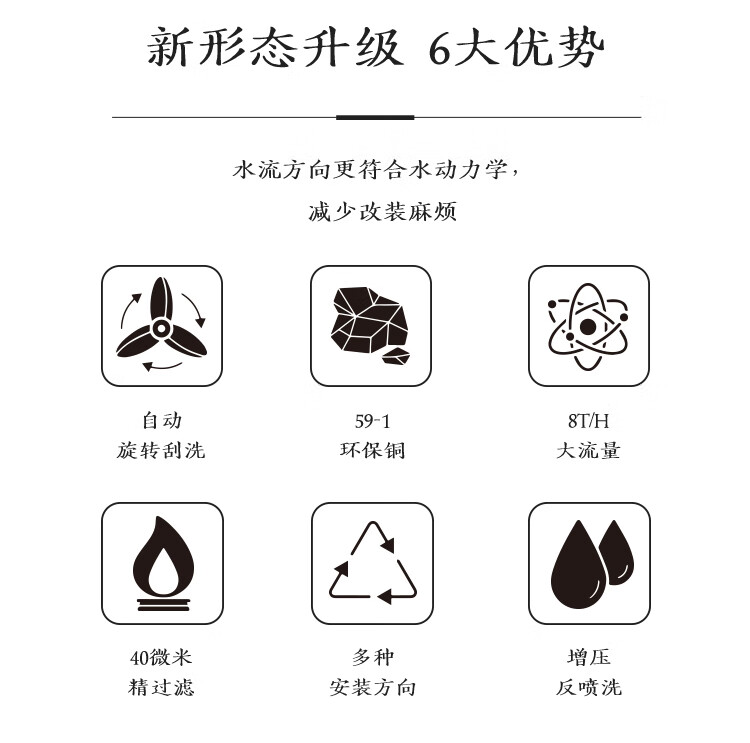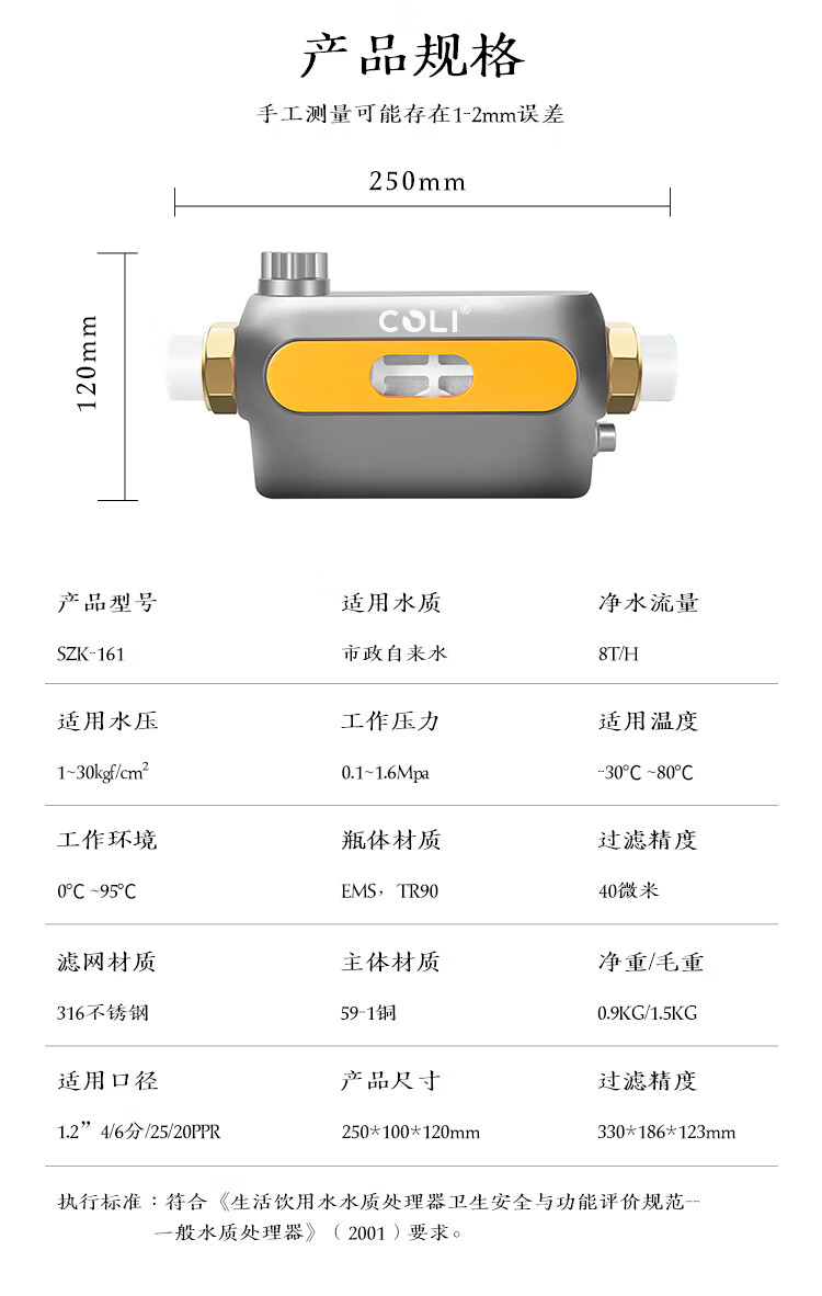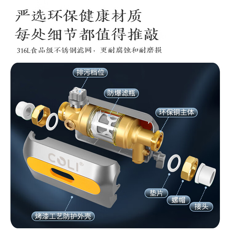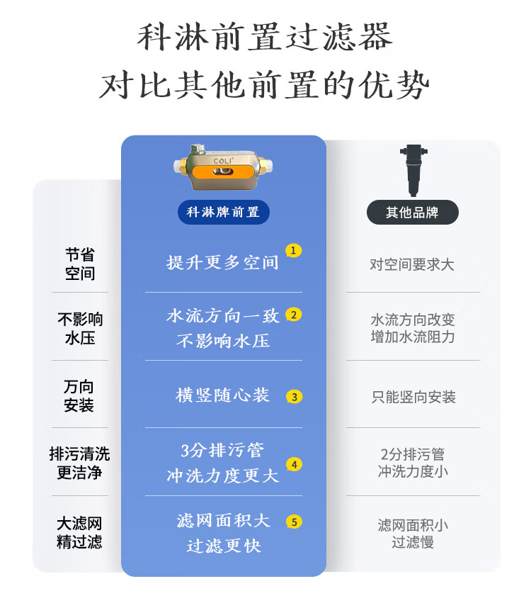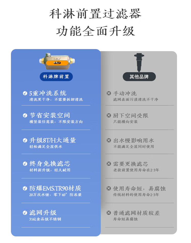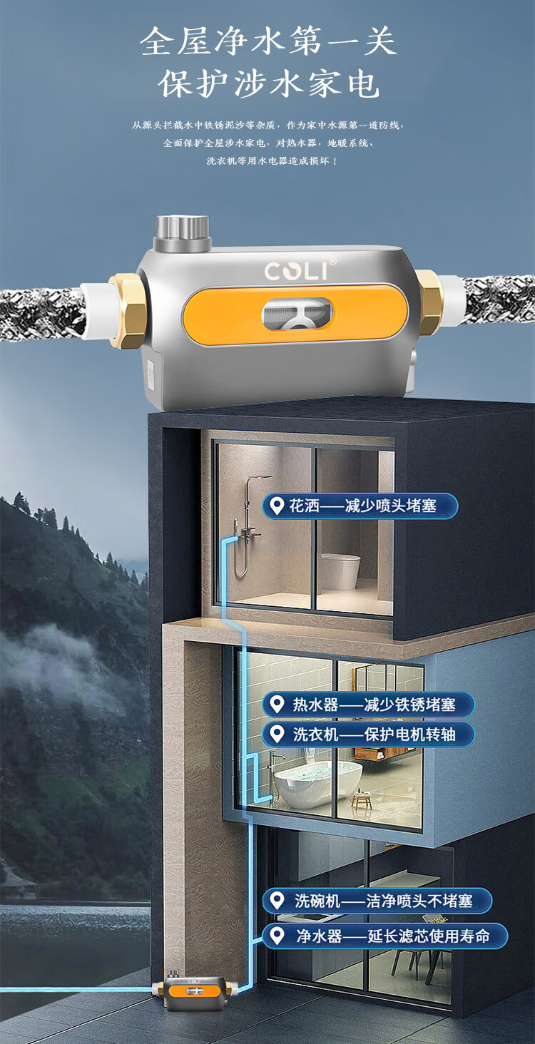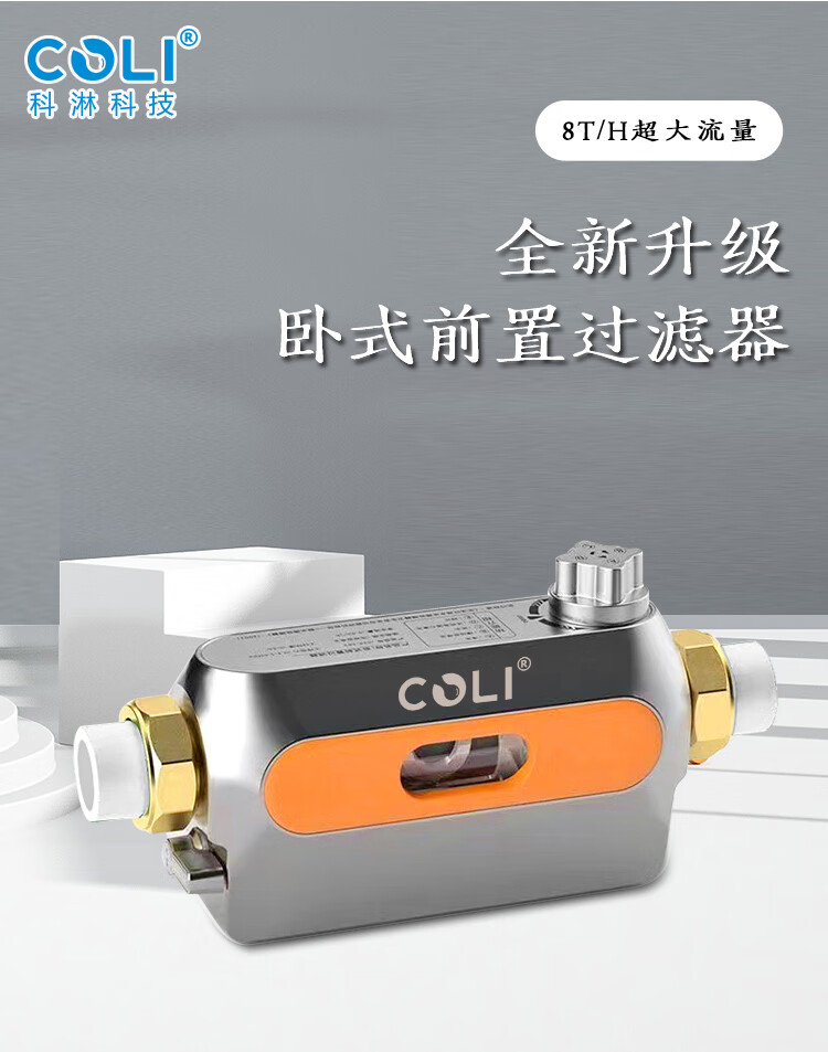 COLI卧式前置过滤器8T/H大通量中央净水器家用净水40微米过滤增压反喷洗自动旋转刮洗