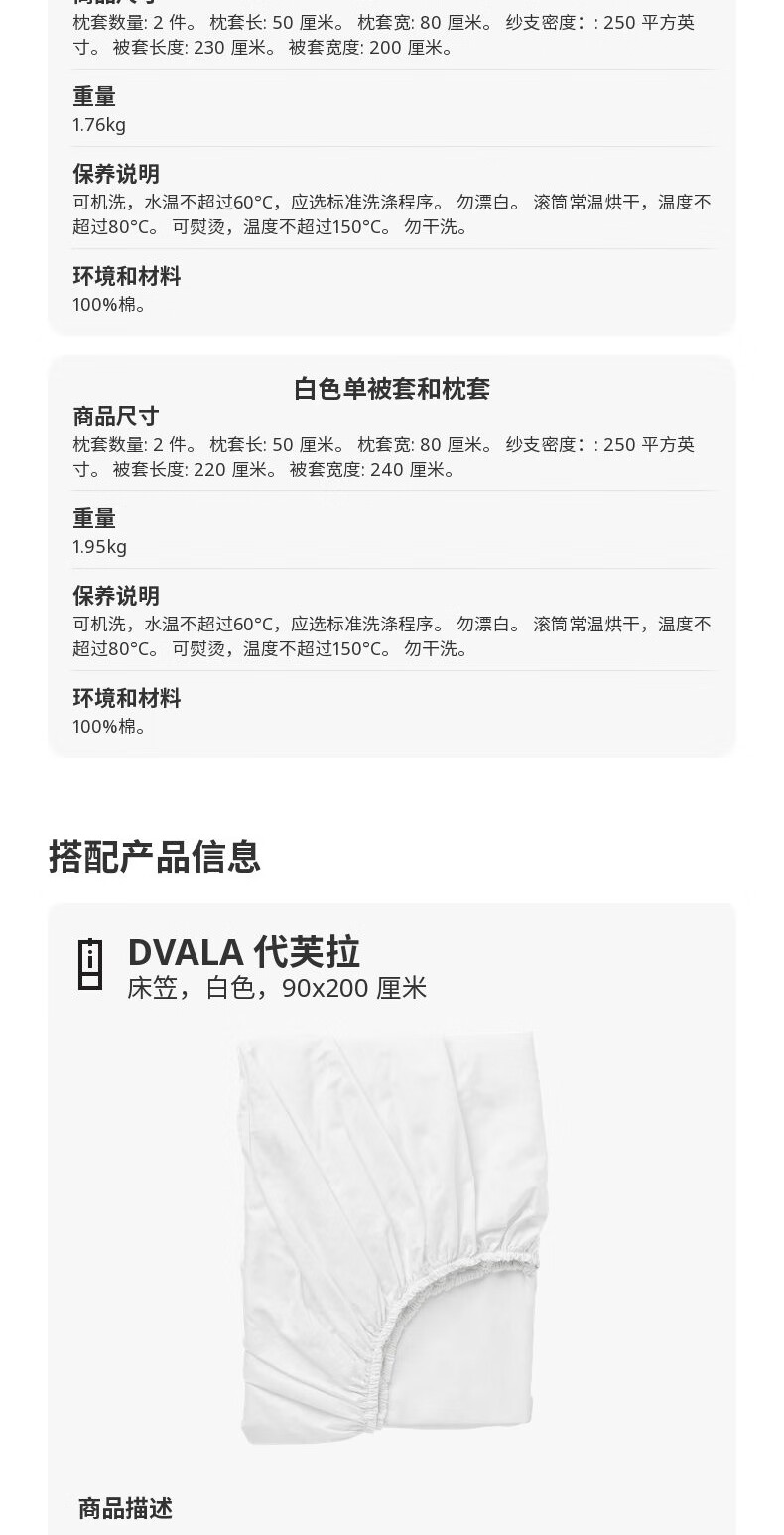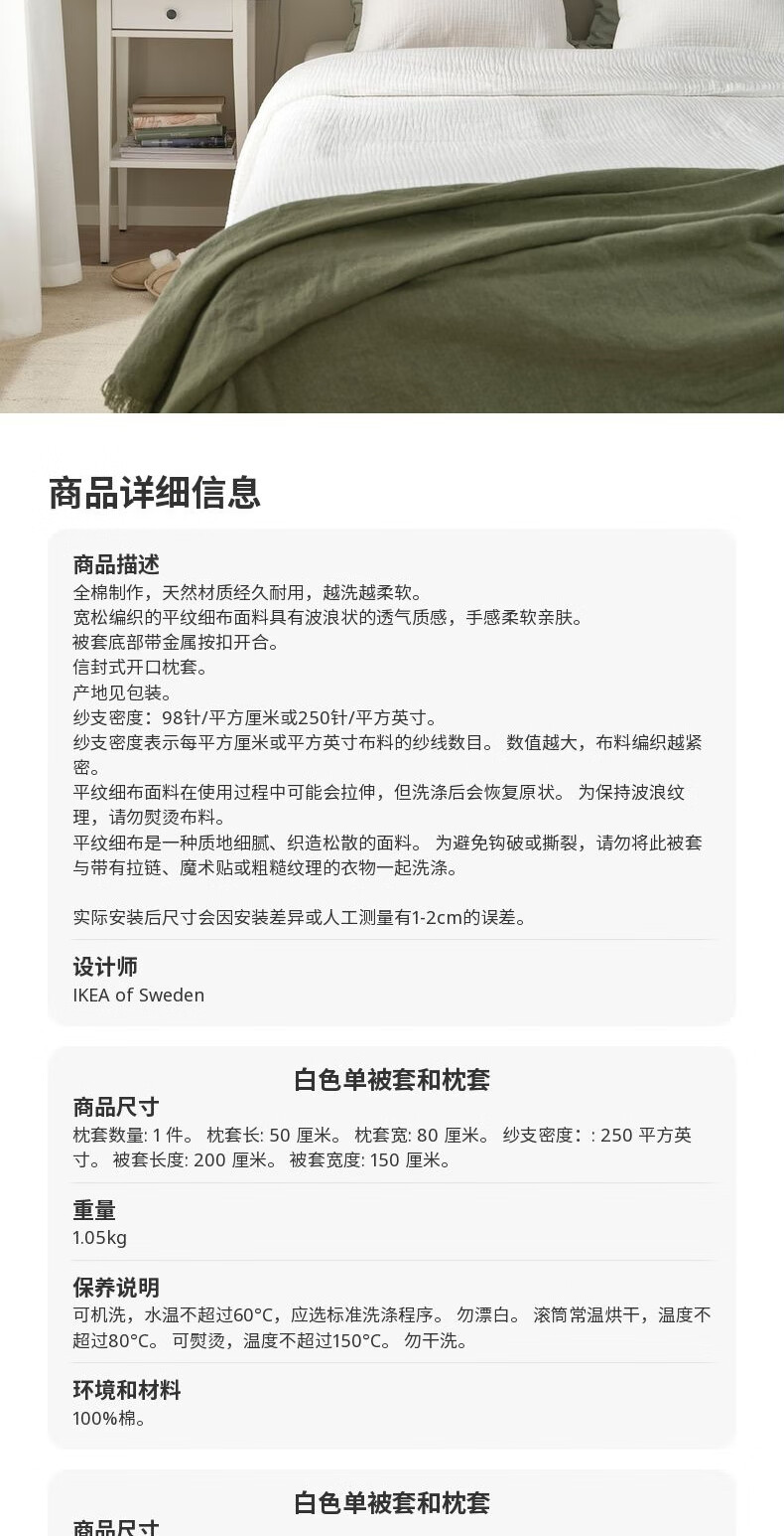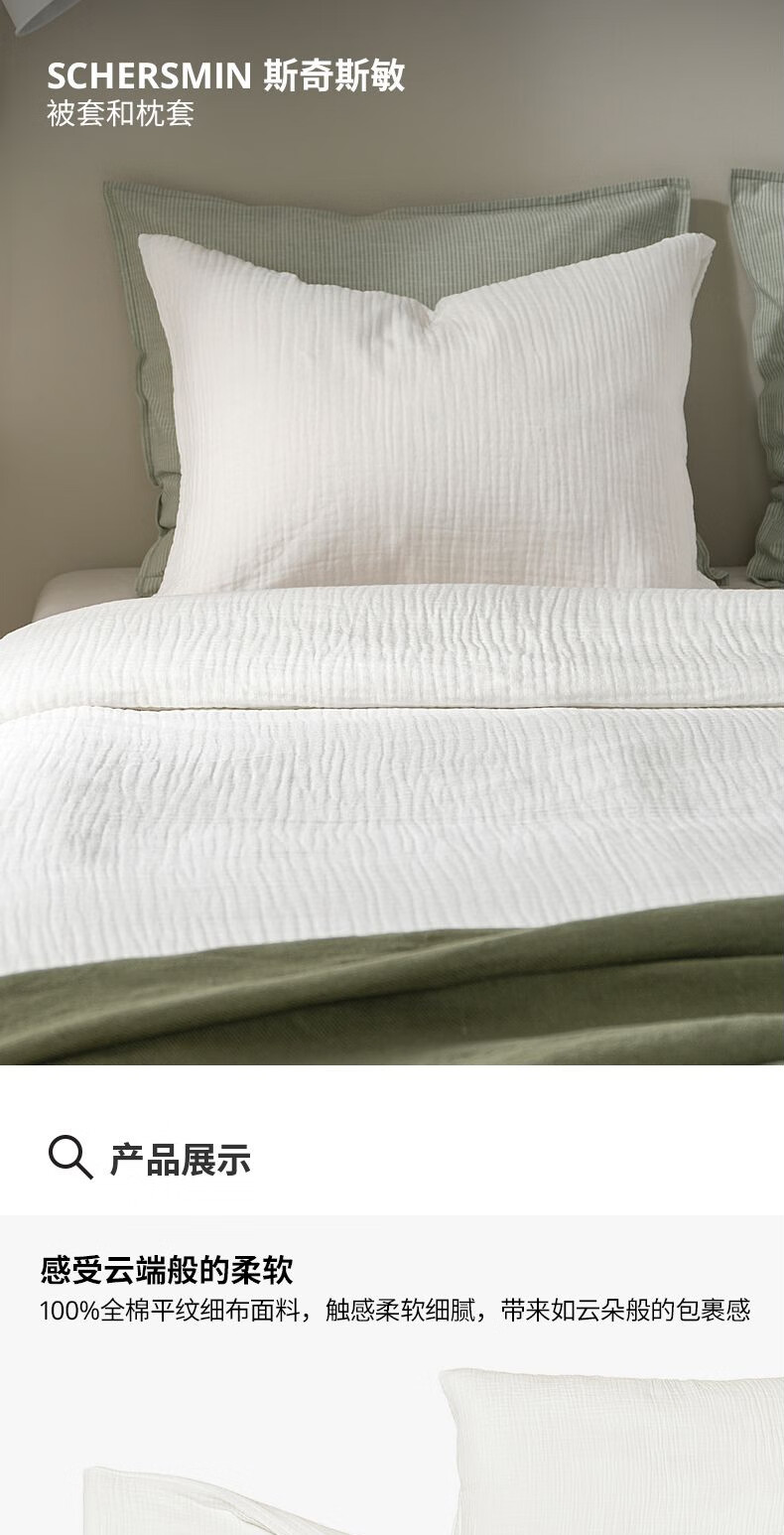 宜家(IKEA)【新品】SCHERSMIN斯奇斯敏被套枕套被套单件纯棉被罩 白色单被套和枕套150X200cm+床笠0.9m床