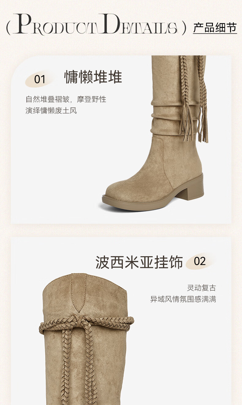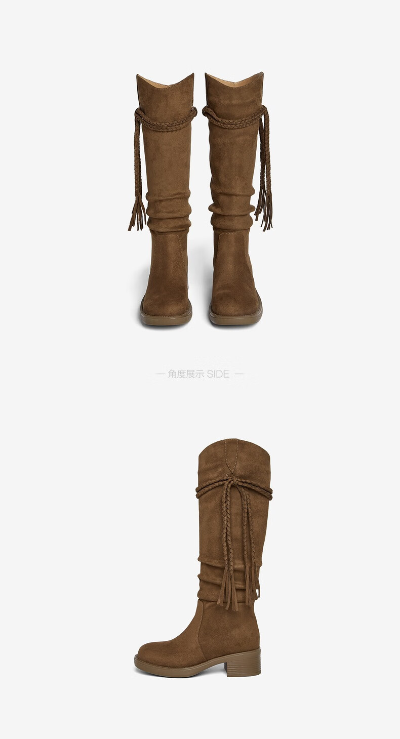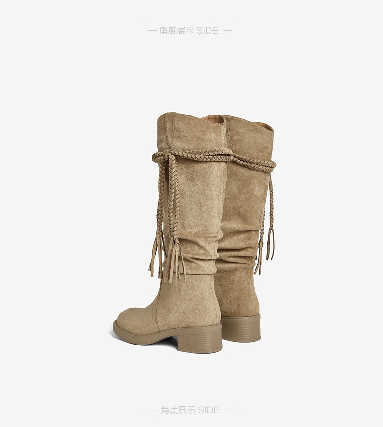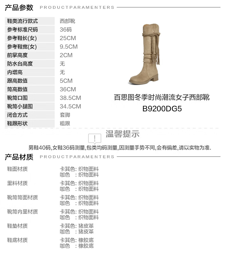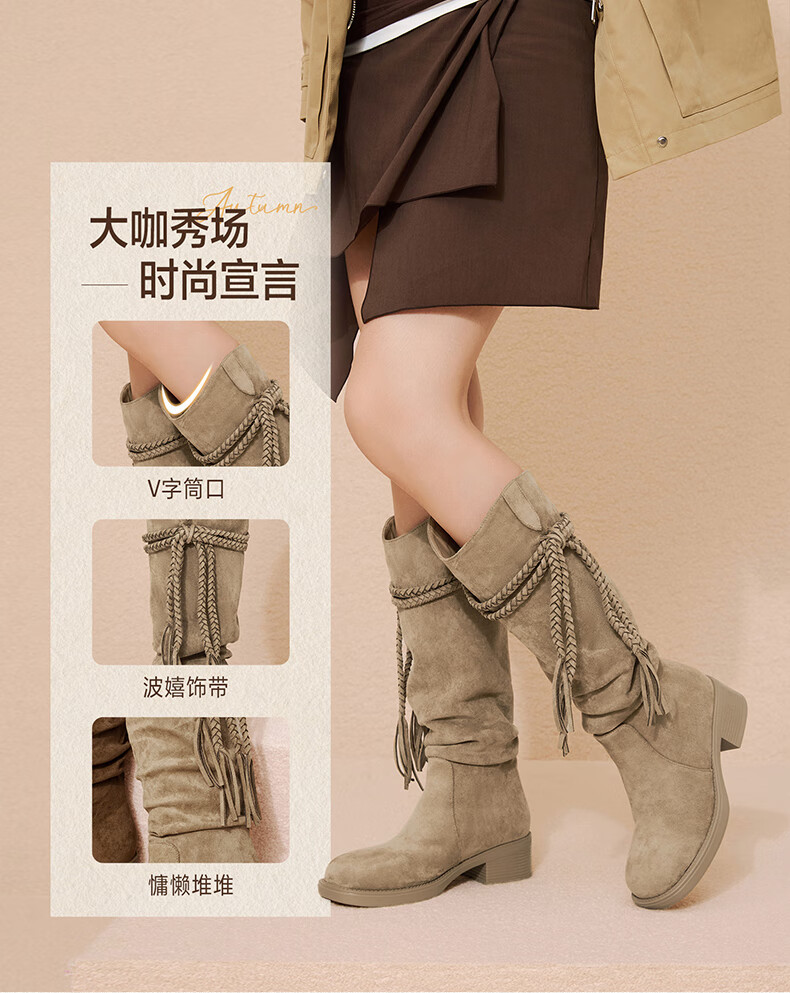 百思图2025冬季新款时尚复古西部靴堆堆长靴粗跟女高筒靴B9200DG5 咖色 37