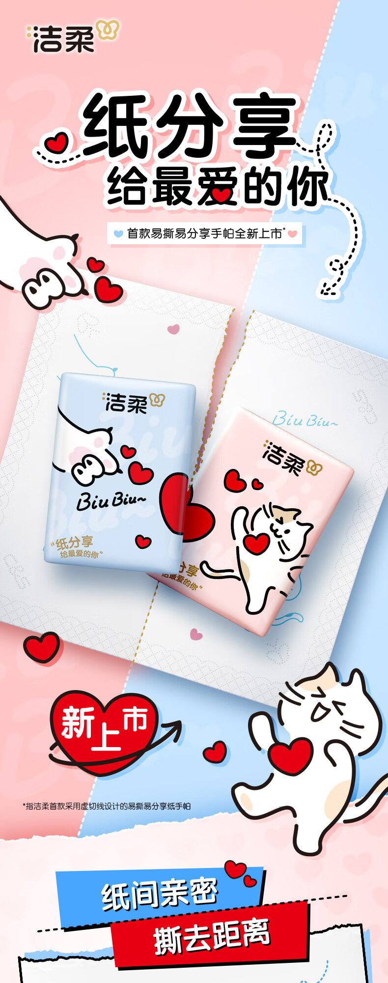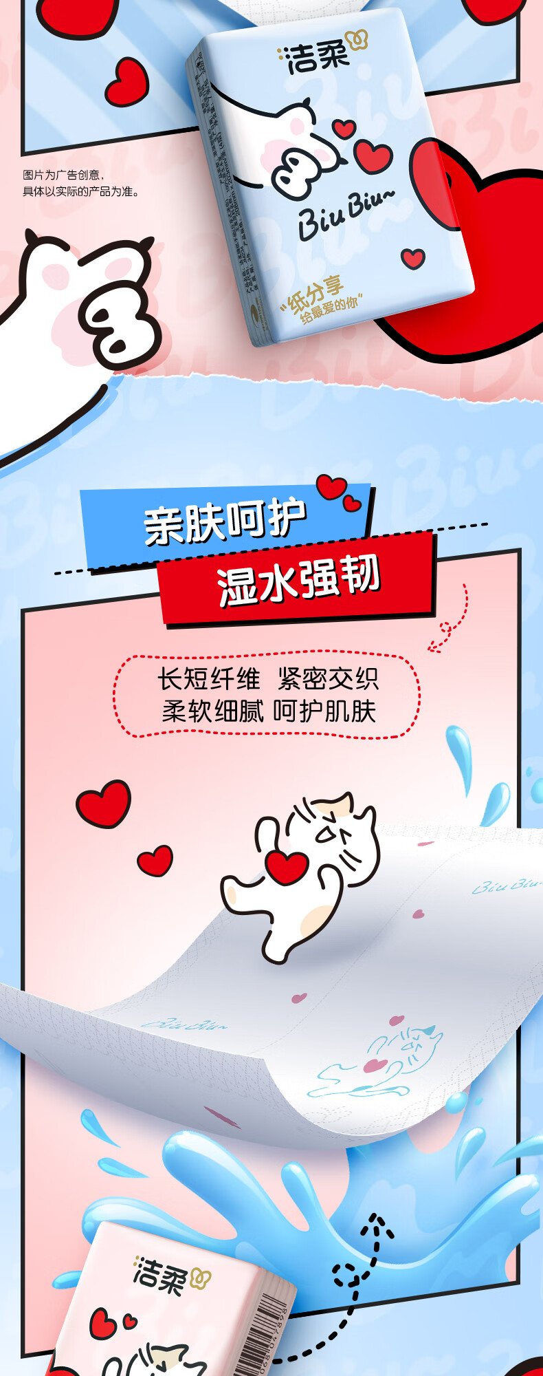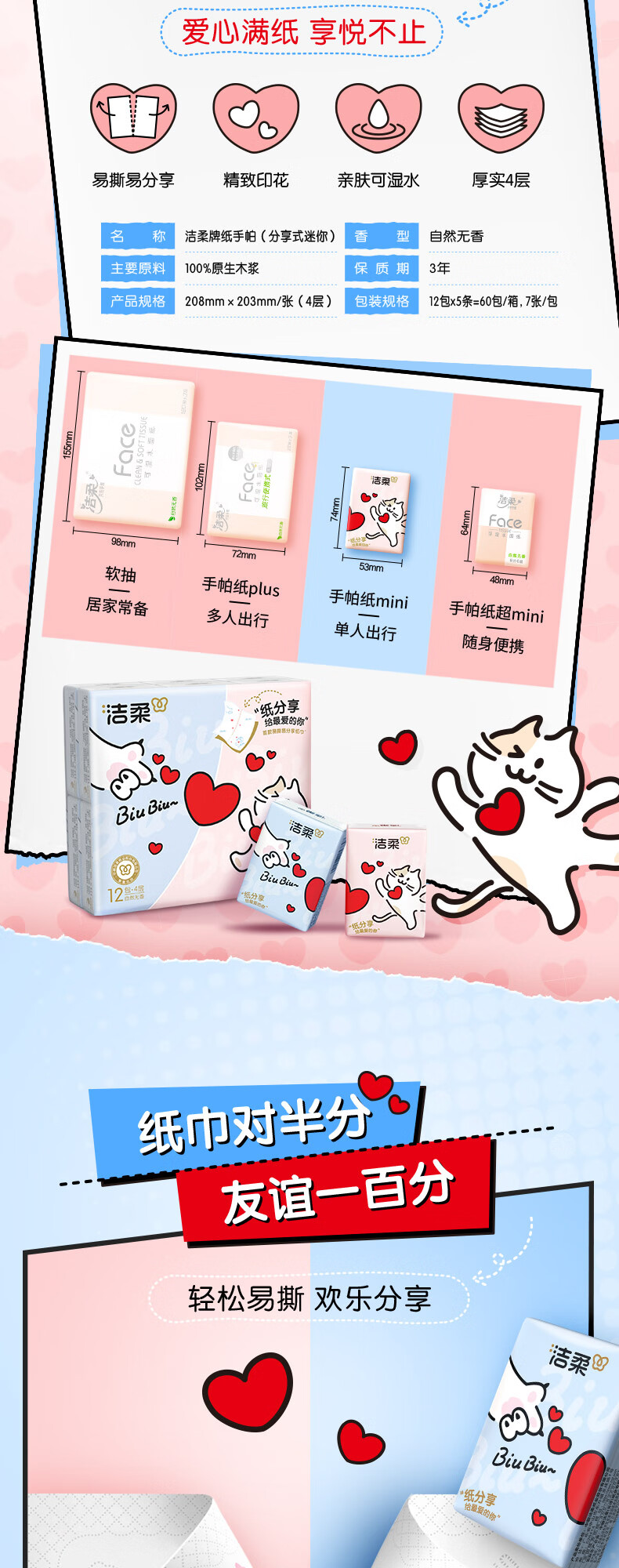 洁柔手帕纸对半撕分享式4层7片*60包可爱小猫咪印花迷你可湿水无香